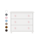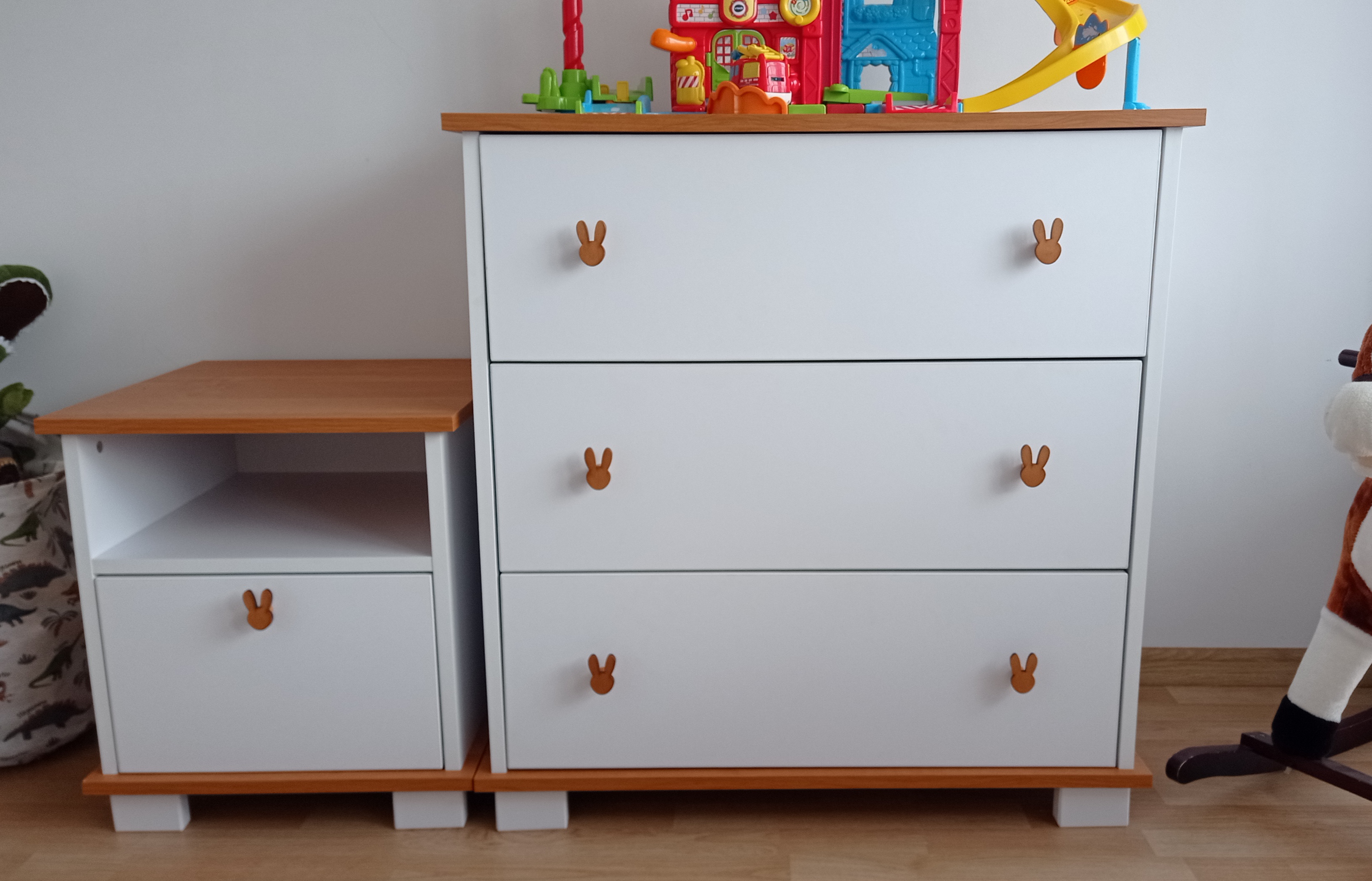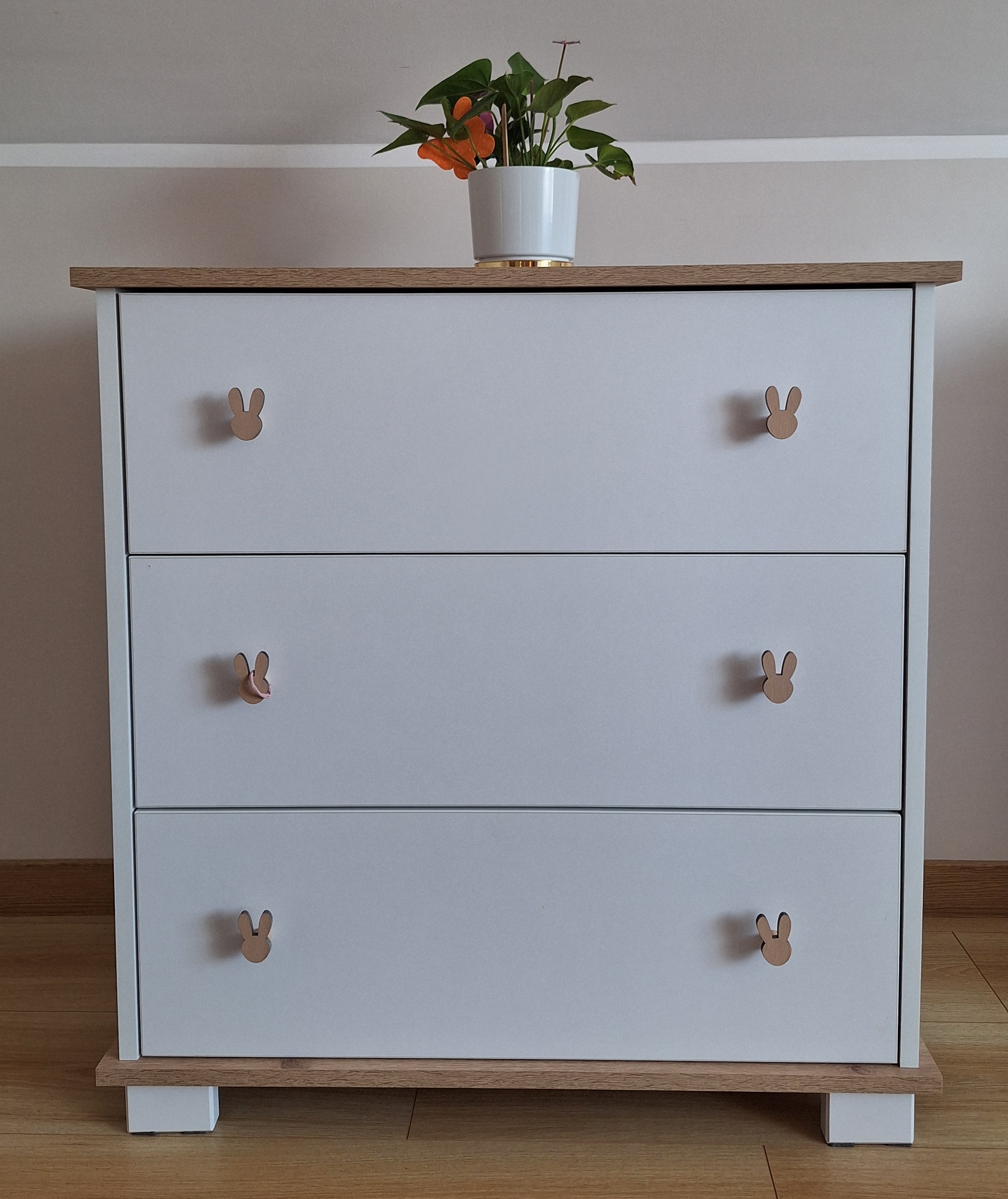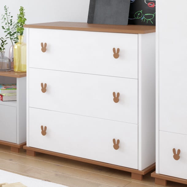 Komoda z kolekcji KRÓLICZEK to klasyczny mebel, gdzie proste formy zostały ożywione uchwytami w kształcie KRÓLICZKA.