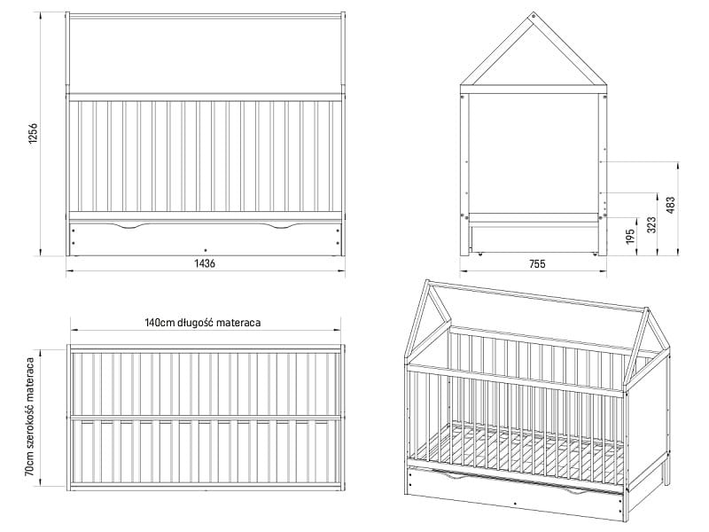 Łóżeczko wykonane z drewna. Wypełnienie szczytów wykonano z HDF. Szuflada z płyty wiórowej i płyty HDF.