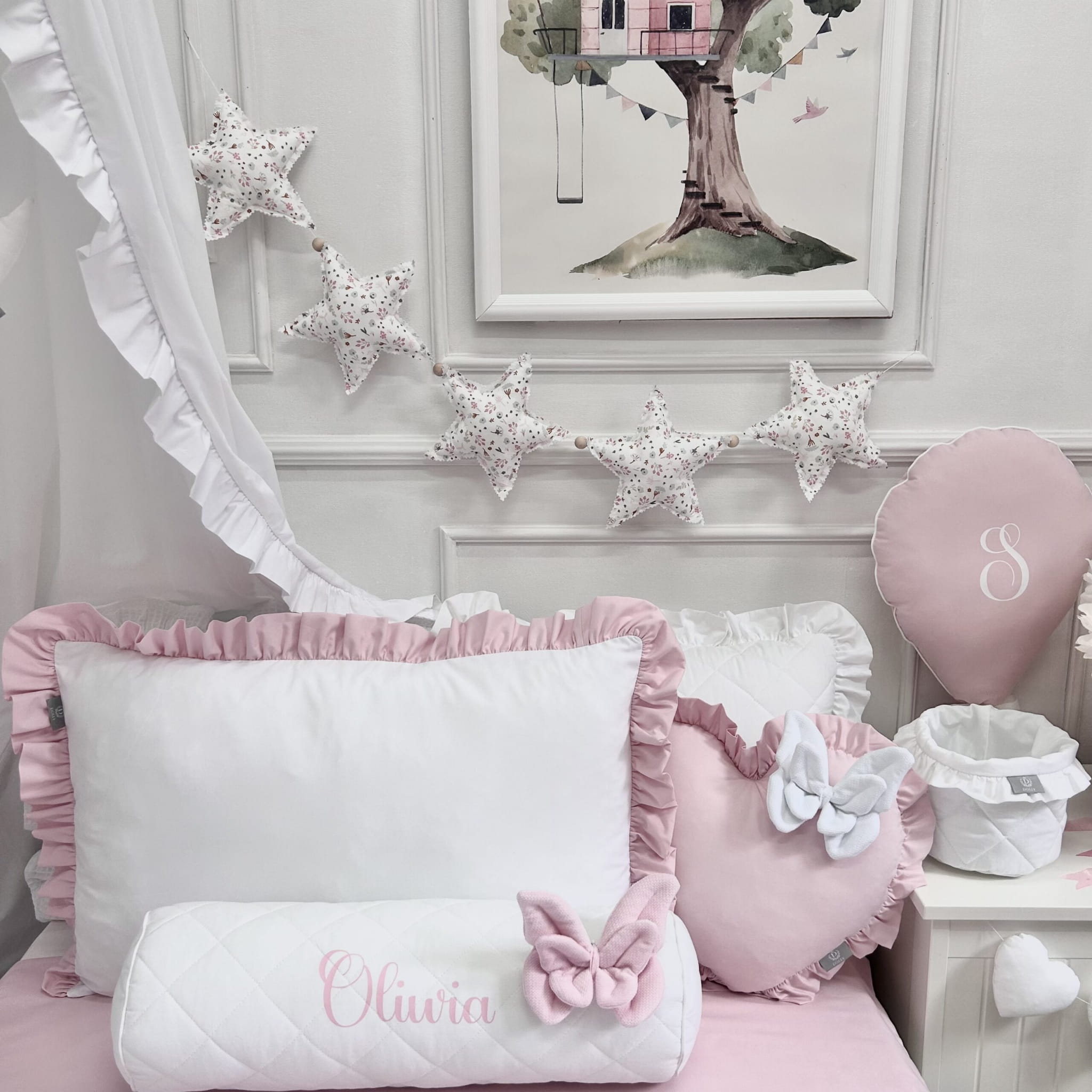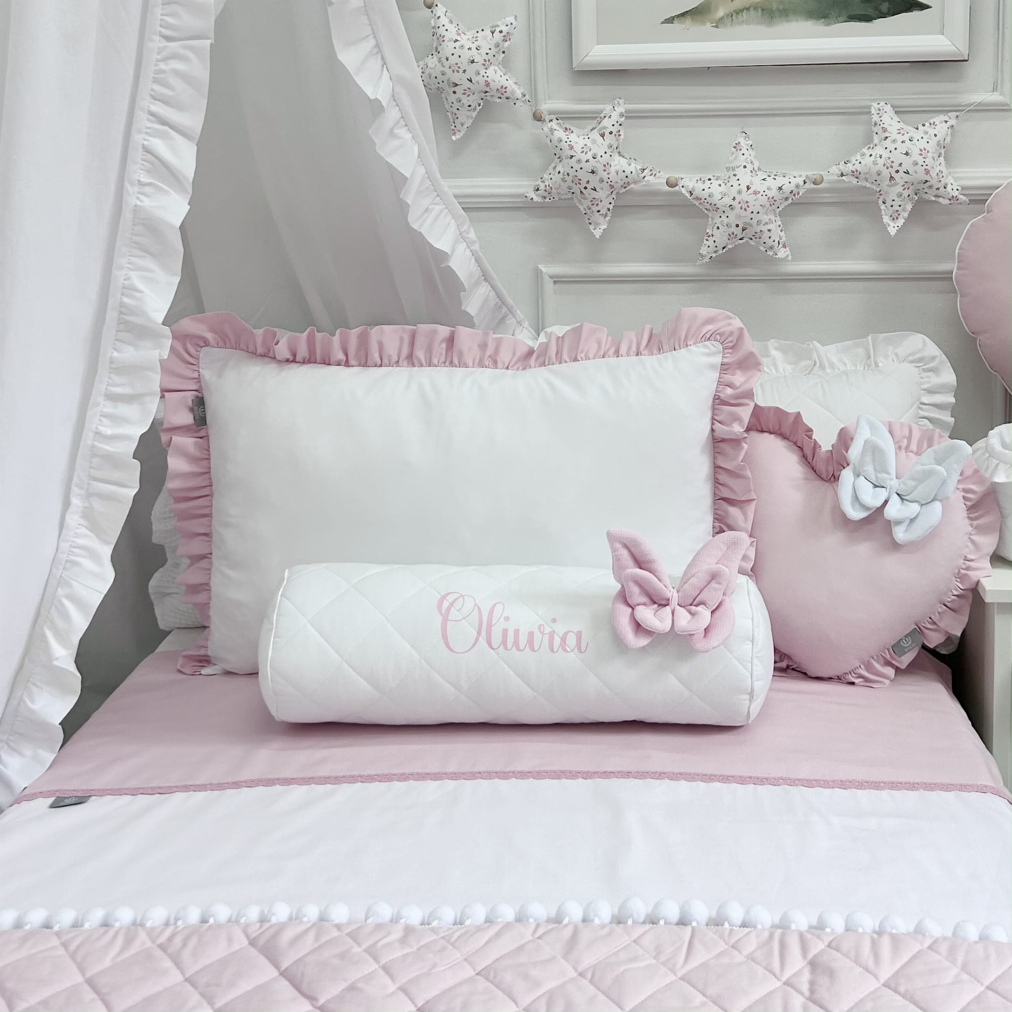 Pościel bawełniana z falbanką puder z bielą dla niemowląt oraz starszych dzieci i młodzieży.