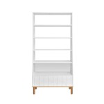 Biała bryła mebli jest zestawiona z naturalnym drewnem dębowym pojawiającym się w podstawie mebla oraz jego nogach,