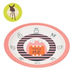 Talerzyk z wyższym i szerszym brzegiem, z motywem zabawnych potworków, utrzymany w kolorach koralu, białym i granatowym.