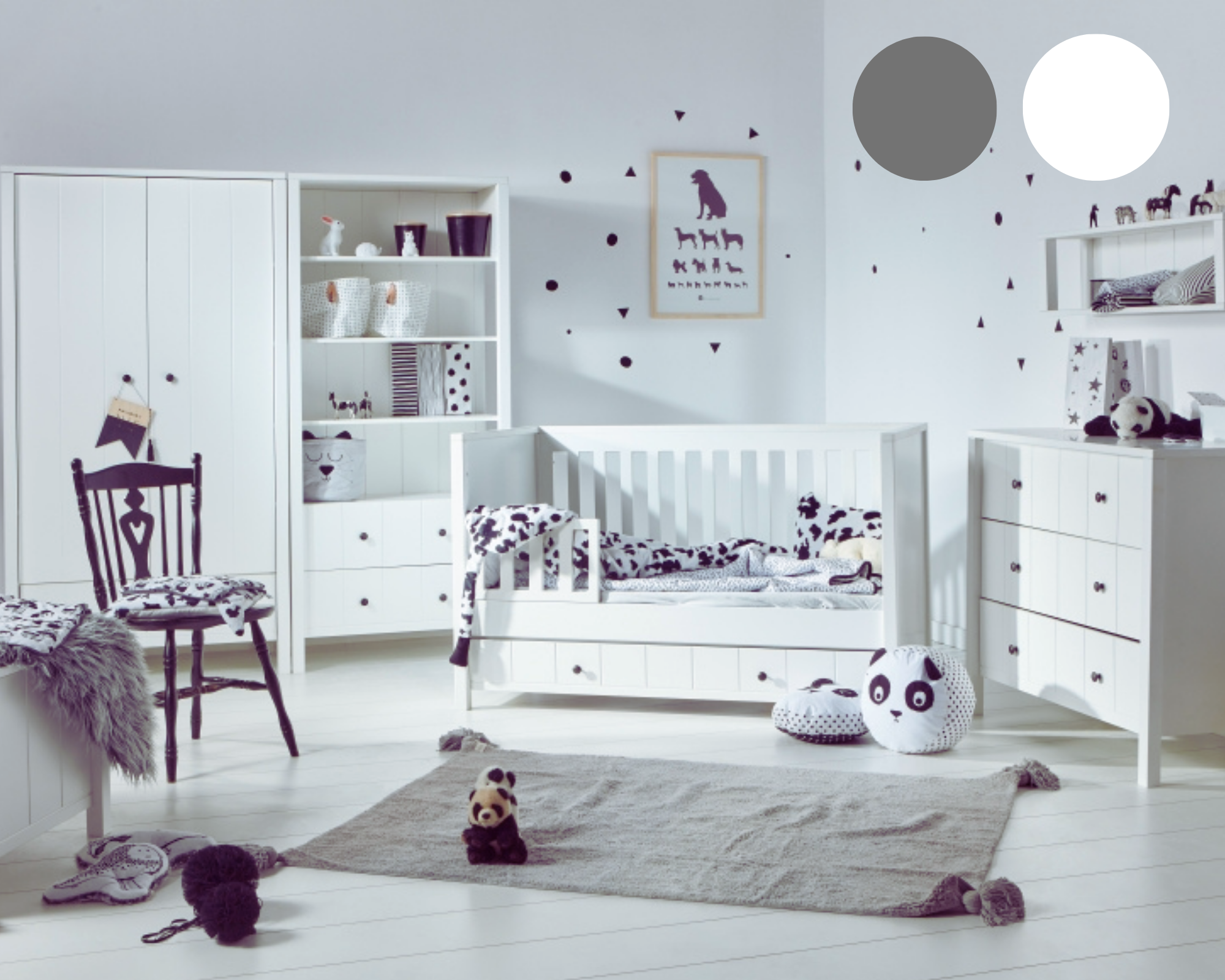 Połączenie klasycznej czerni i bieli sprawia, że kolekcja pasuje zarówno do pokoju chłopca, jak i dziewczynki,