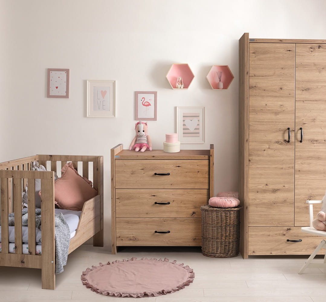 Zestaw mebli dziecięcych AMELIA BABY II – łóżeczko, szafa i komoda w kolorze dębu