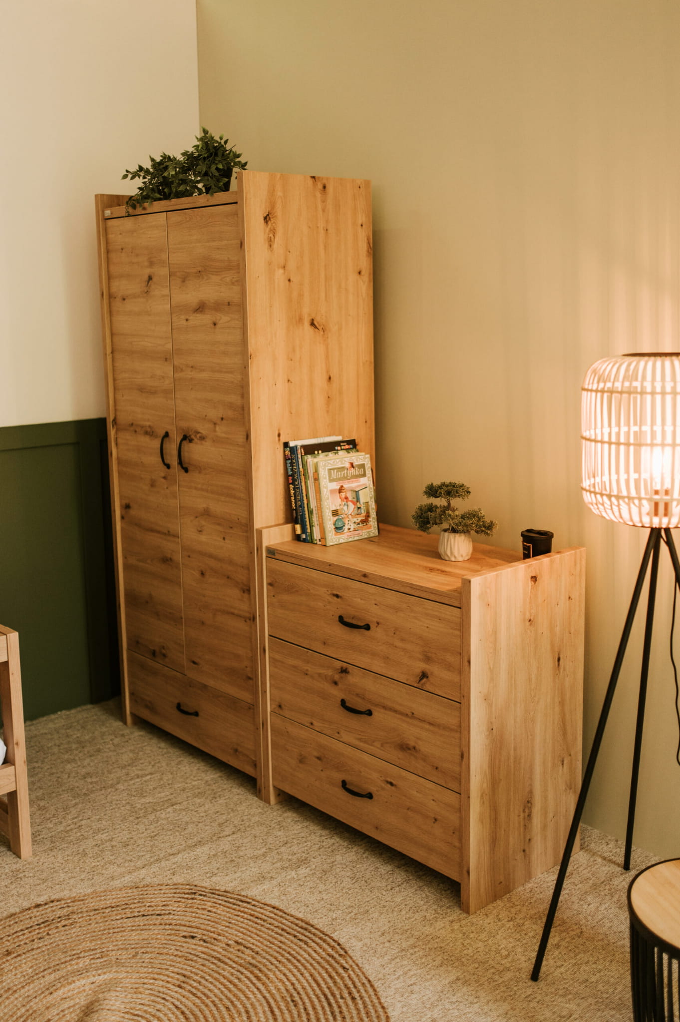 Naturalny, dębowy odcień kolekcji AMELIA BABY II tworzy w pokoju dziecka przytulną i harmonijną atmosferę. Delikatna stylistyka oraz funkcjonalność mebli doskonale komponują się ze skandynawskimi i pastelowymi aranżacjami.
