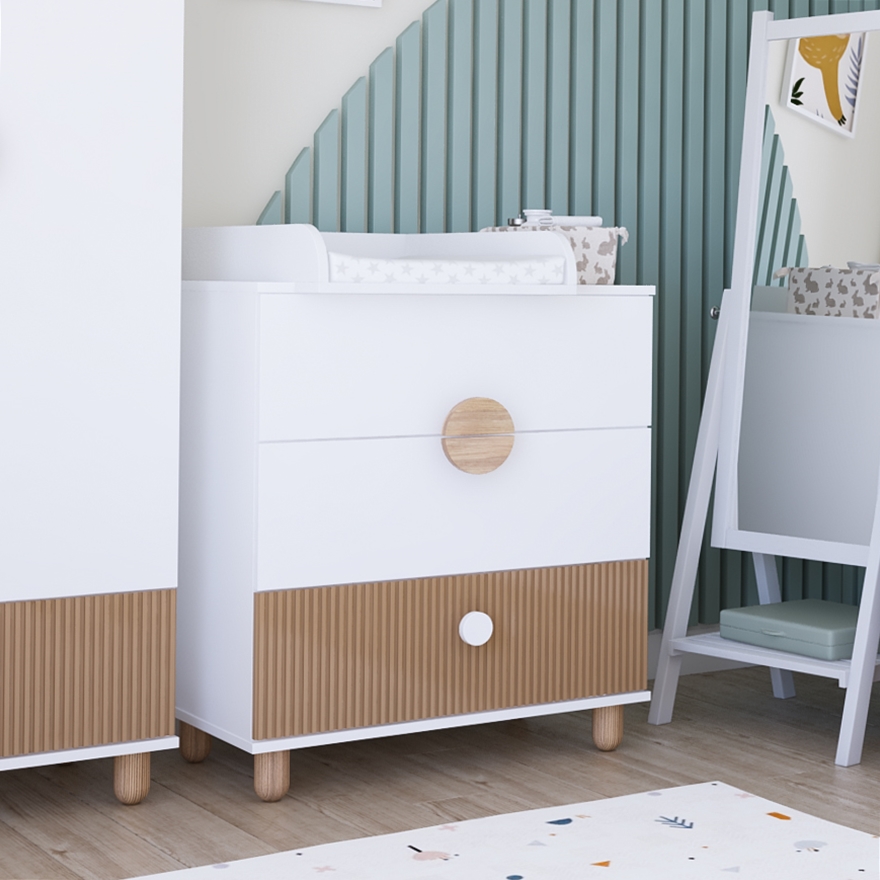 Komoda z kolekcji Cozy LOFT to połączenie nowoczesnego designu, naturalnych akcentów i praktycznych rozwiązań, które sprawdzą się w pokoju dziecka przez wiele lat. Trzy pojemne szuflady oferują dużo miejsca na ubranka, akcesoria i inne drobiazgi, a opcjonalny przewijak, który można łatwo zdemontować, pozwala przekształcić mebel z funkcjonalnej komody niemowlęcej w elegancki element pokoju starszego dziecka.