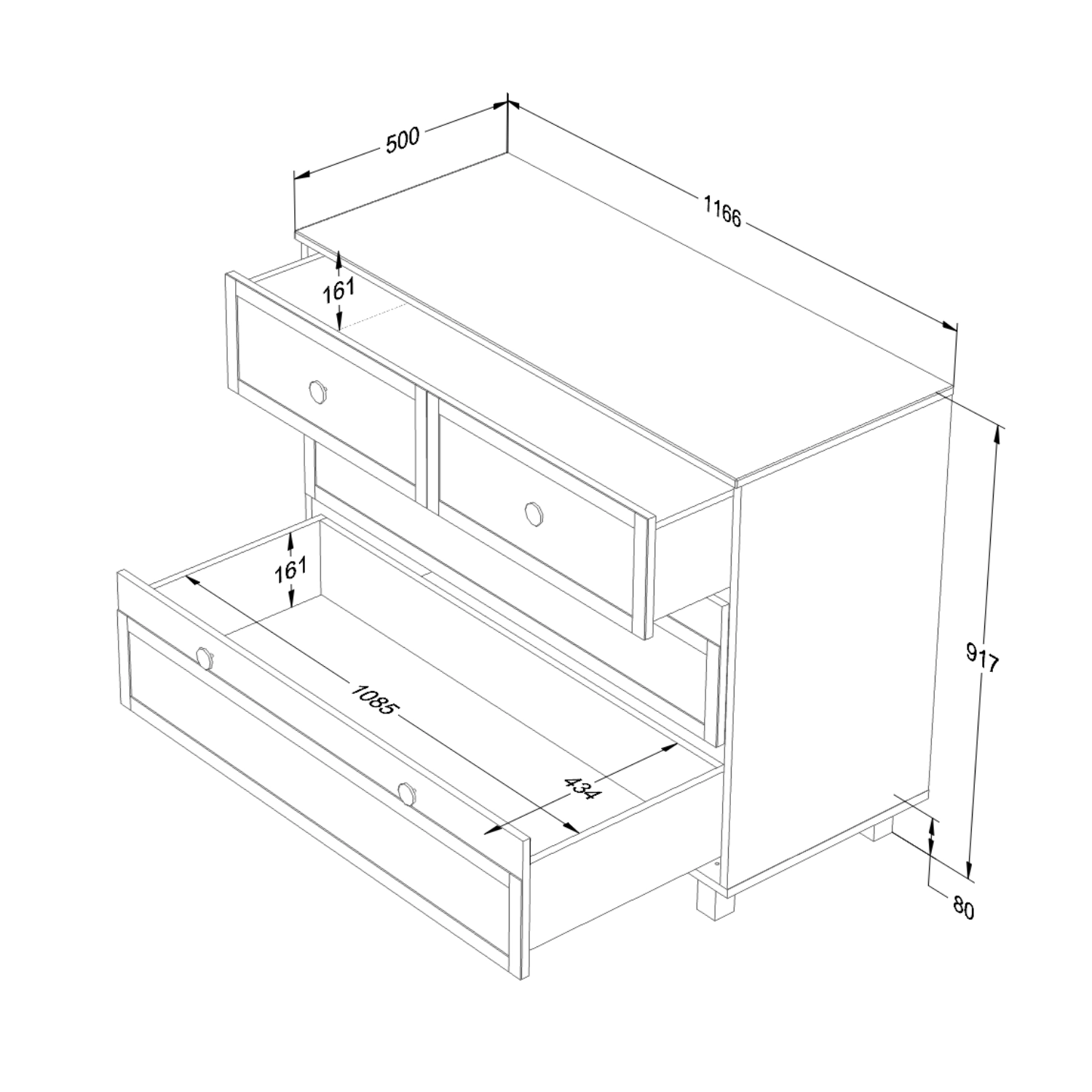 - Trzy pojemne szuflady — wygodne przechowywanie ubrań, tekstyliów i dziecięcych akcesoriów.