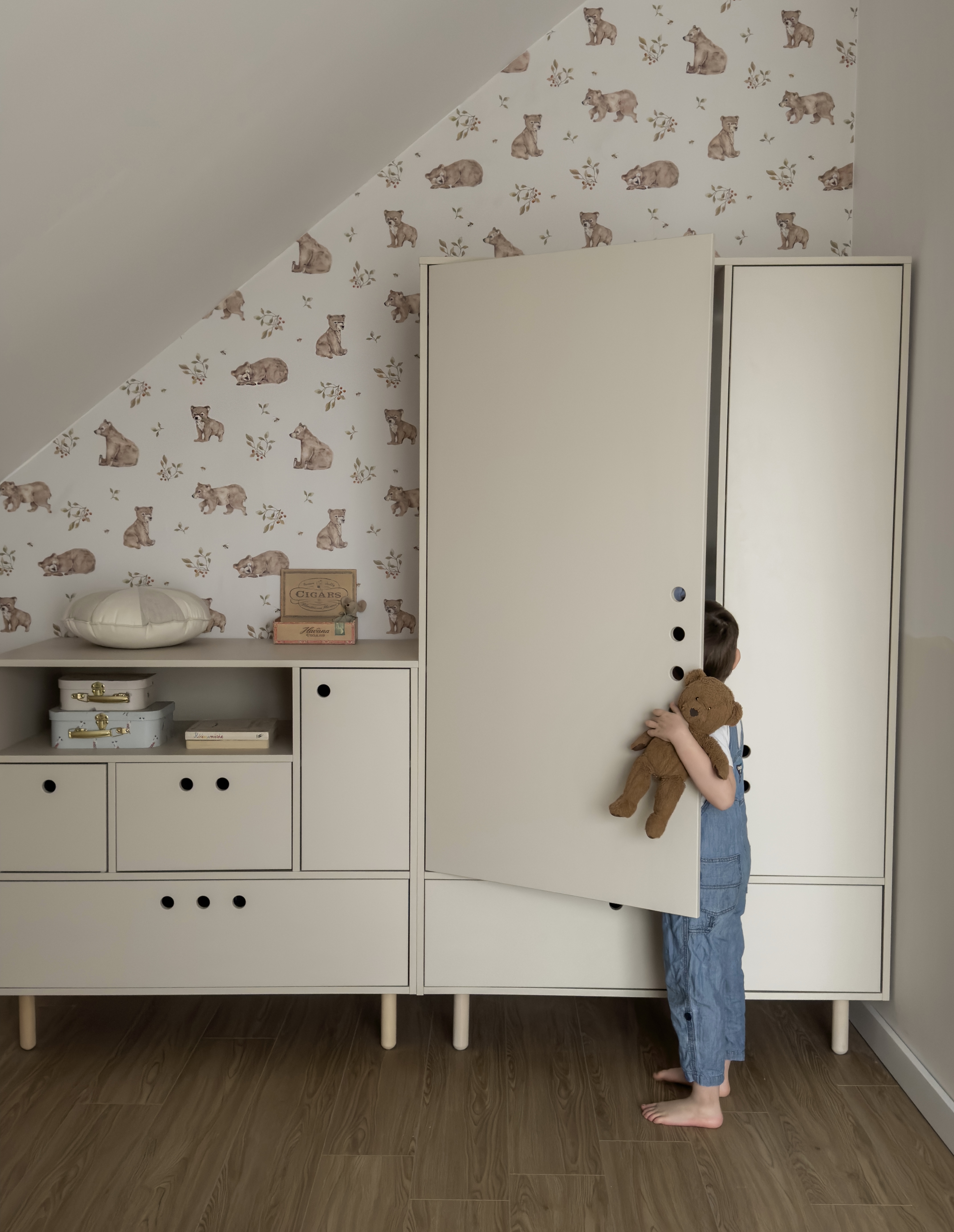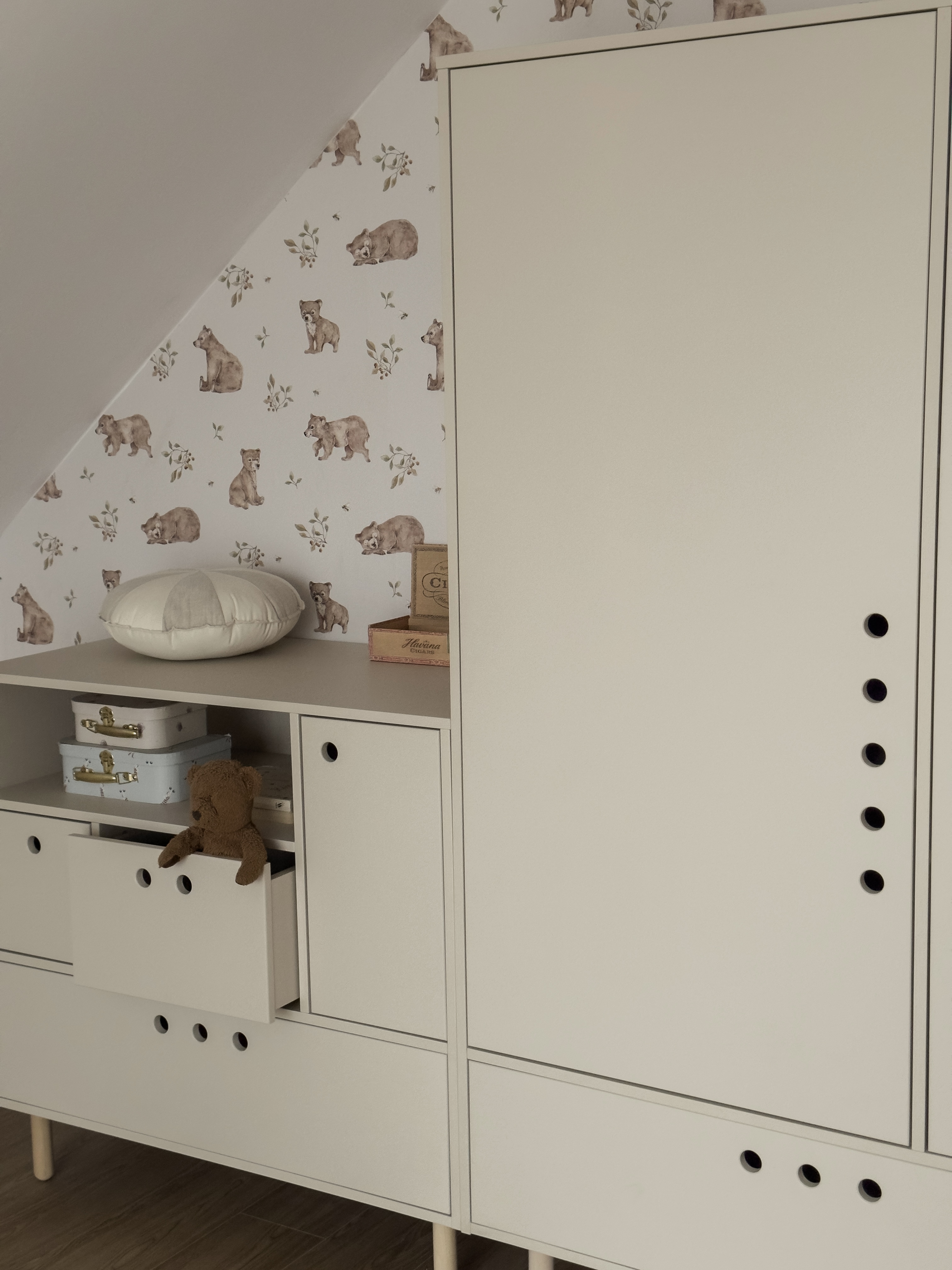 Komoda do pokoju dziecięcego River – Piaskowy Beż to nowoczesny i funkcjonalny mebel zaprojektowany z myślą o uporządkowanej przestrzeni dziecka. Subtelny odcień piaskowego beżu w połączeniu z naturalnymi, bukowymi nóżkami nadaje komodzie lekkości i ponadczasowego charakteru. Geometryczne podziały frontów oraz okrągłe uchwyty doskonale wpisują się w estetykę kolekcji River, tworząc harmonijną i elegancką aranżację pokoju dziecięcego.
