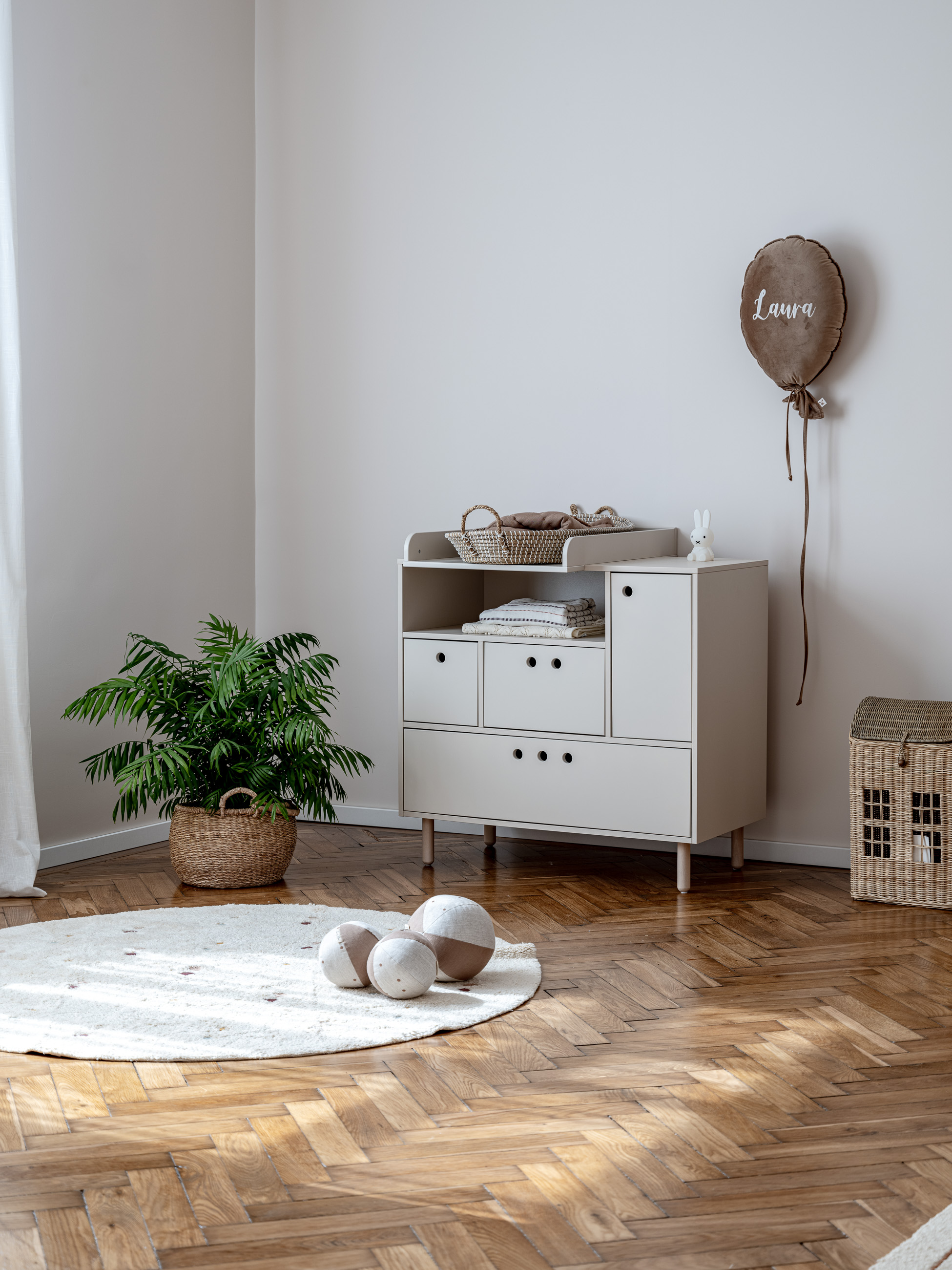 Takie rozwiązanie pozwala dopasować ustawienie do układu pokoju i indywidualnych potrzeb rodziców. Po zakończeniu etapu pieluchowania komoda nadal pełni swoją podstawową funkcję pojemnego mebla do przechowywania.