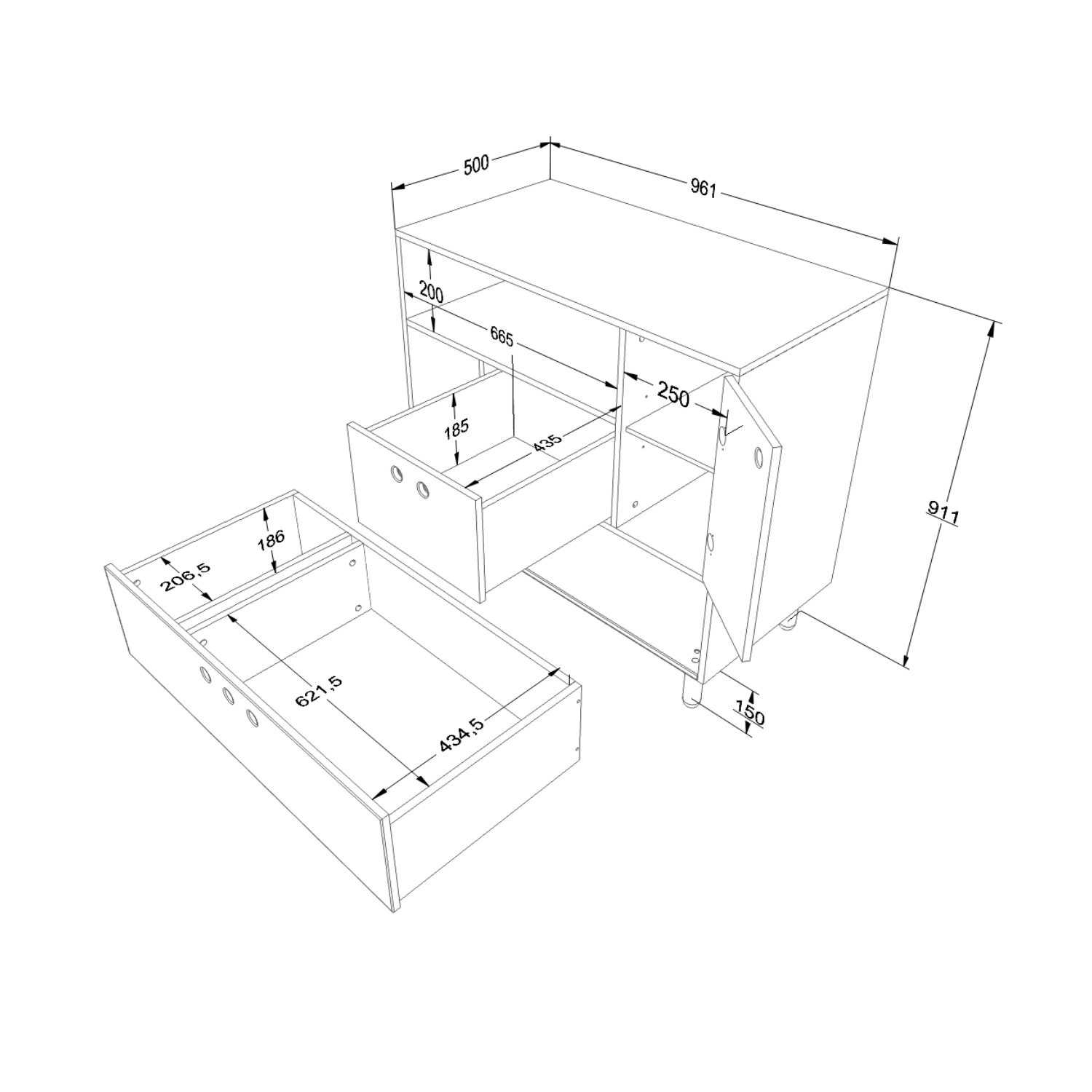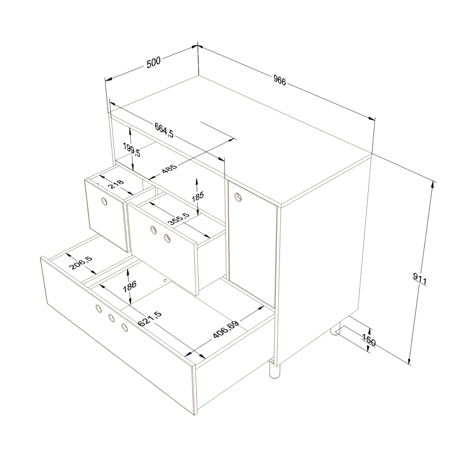 - Dolna szuflada: 90 × 43,5 × 18,5 cm