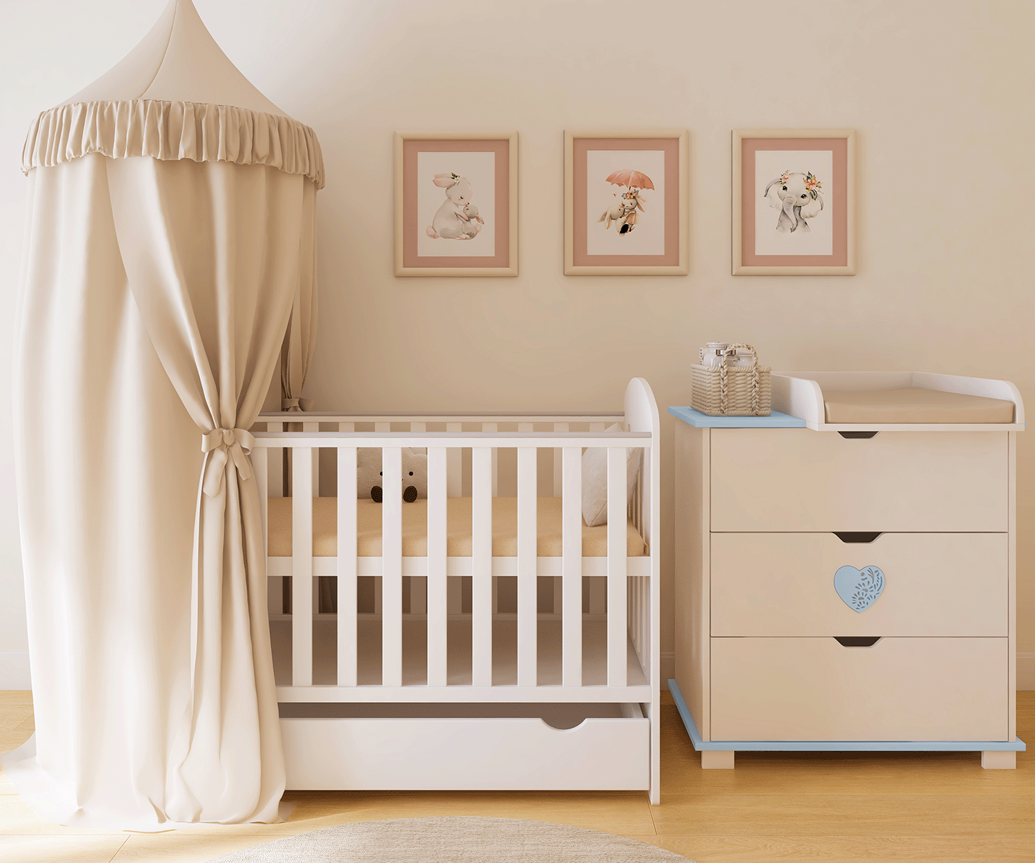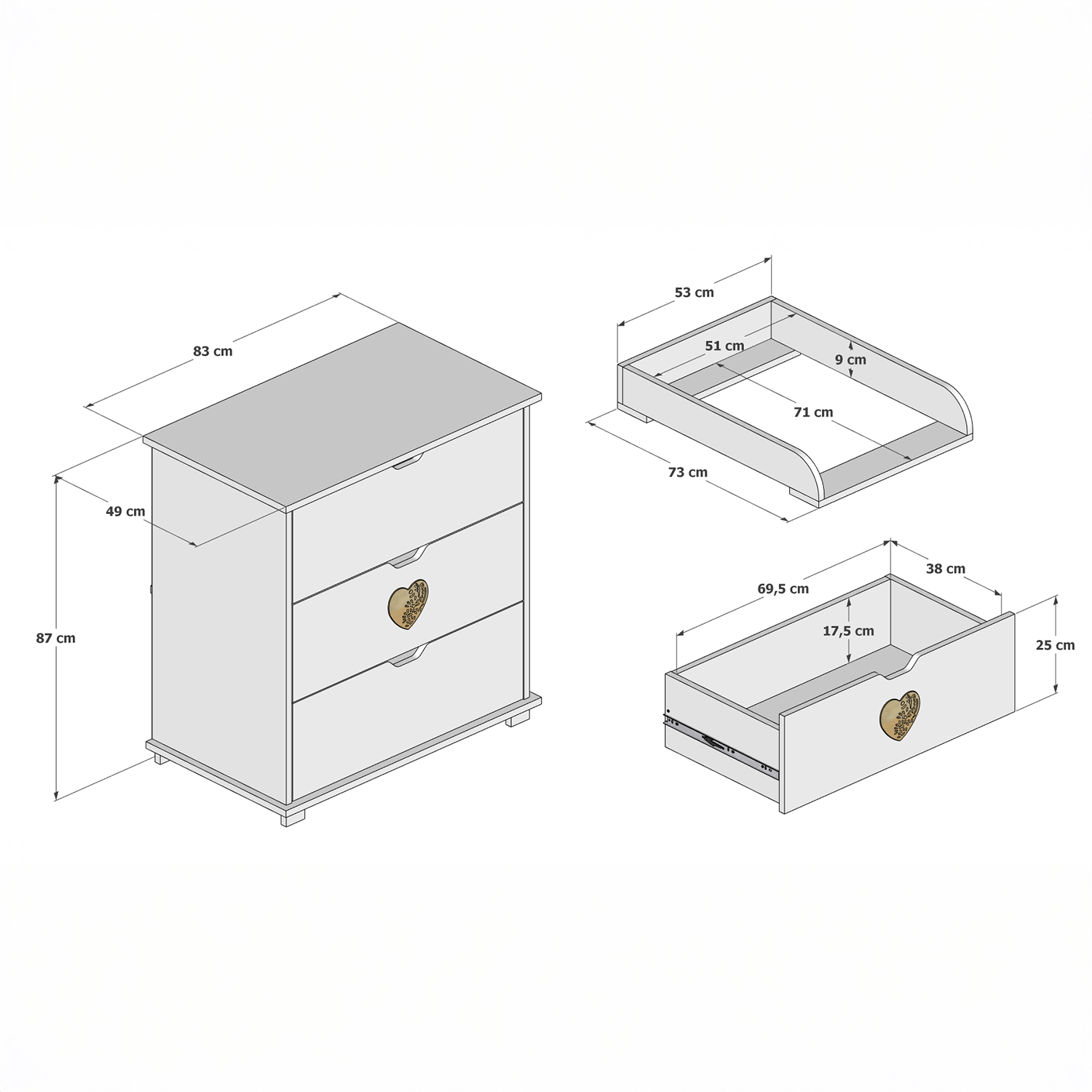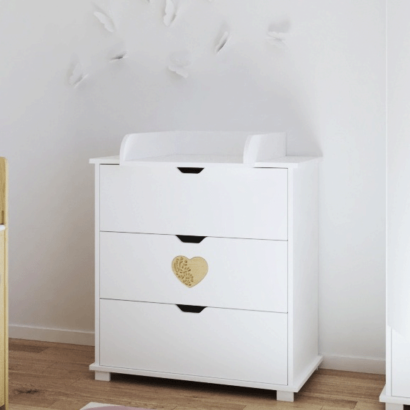 Komoda dziecięca LOVE z trzema szufladami to praktyczne i stylowe rozwiązanie do pokoju maluszka. Pojemne szuflady, opcjonalny przewijak oraz bezpieczne wykończenie sprawiają, że mebel doskonale sprawdzi się zarówno w pierwszych miesiącach życia dziecka, jak i w kolejnych latach, jako klasyczna komoda.