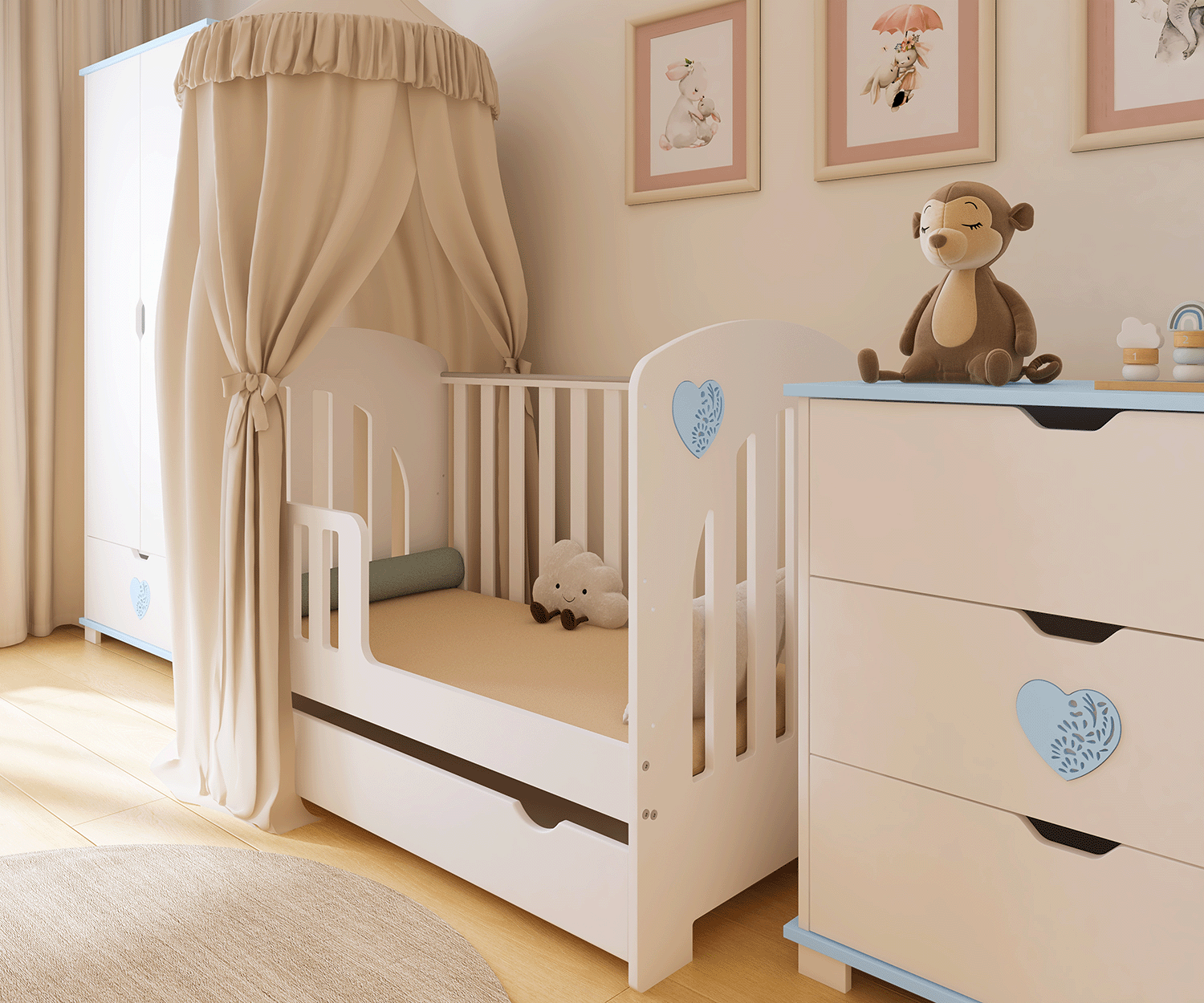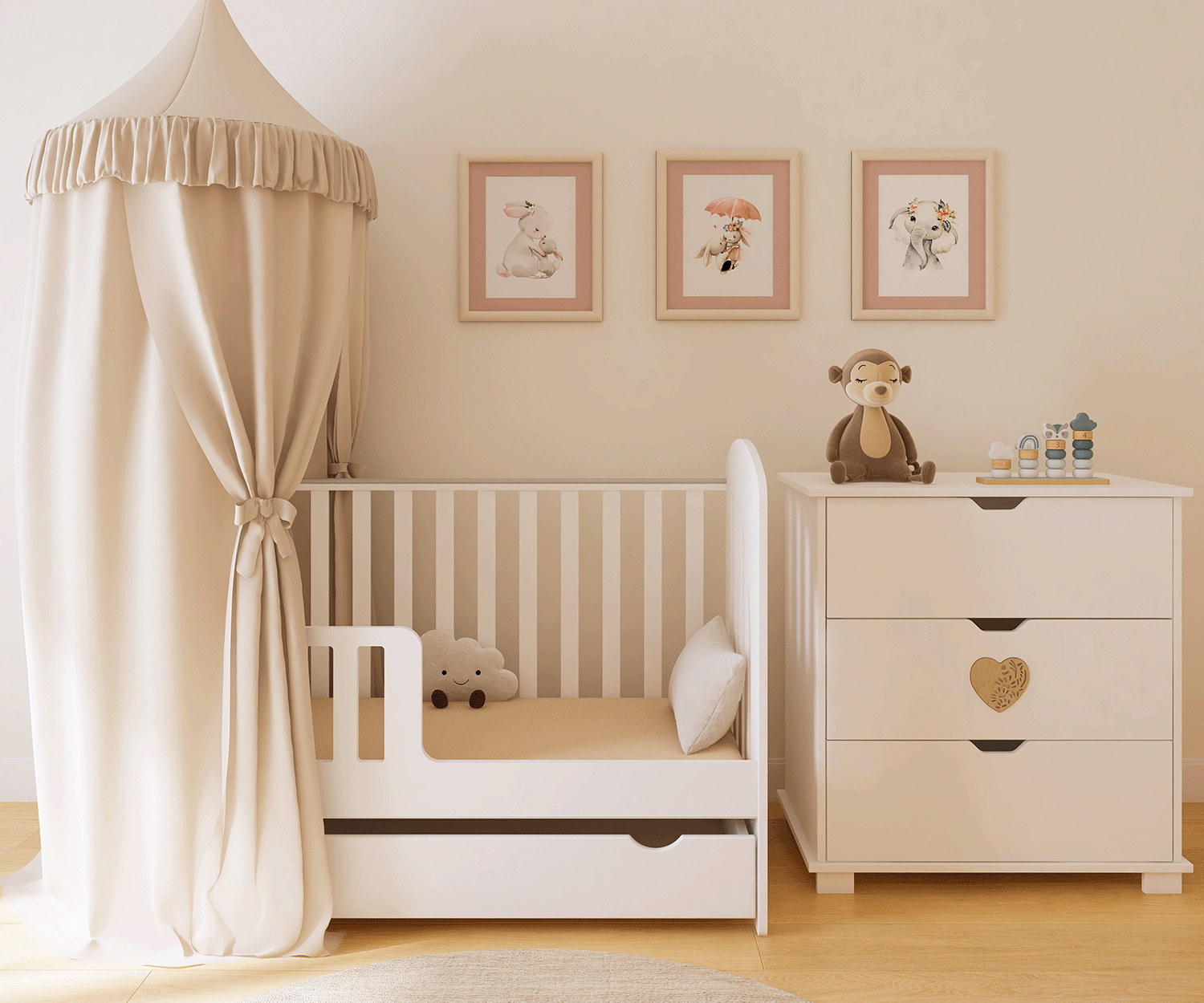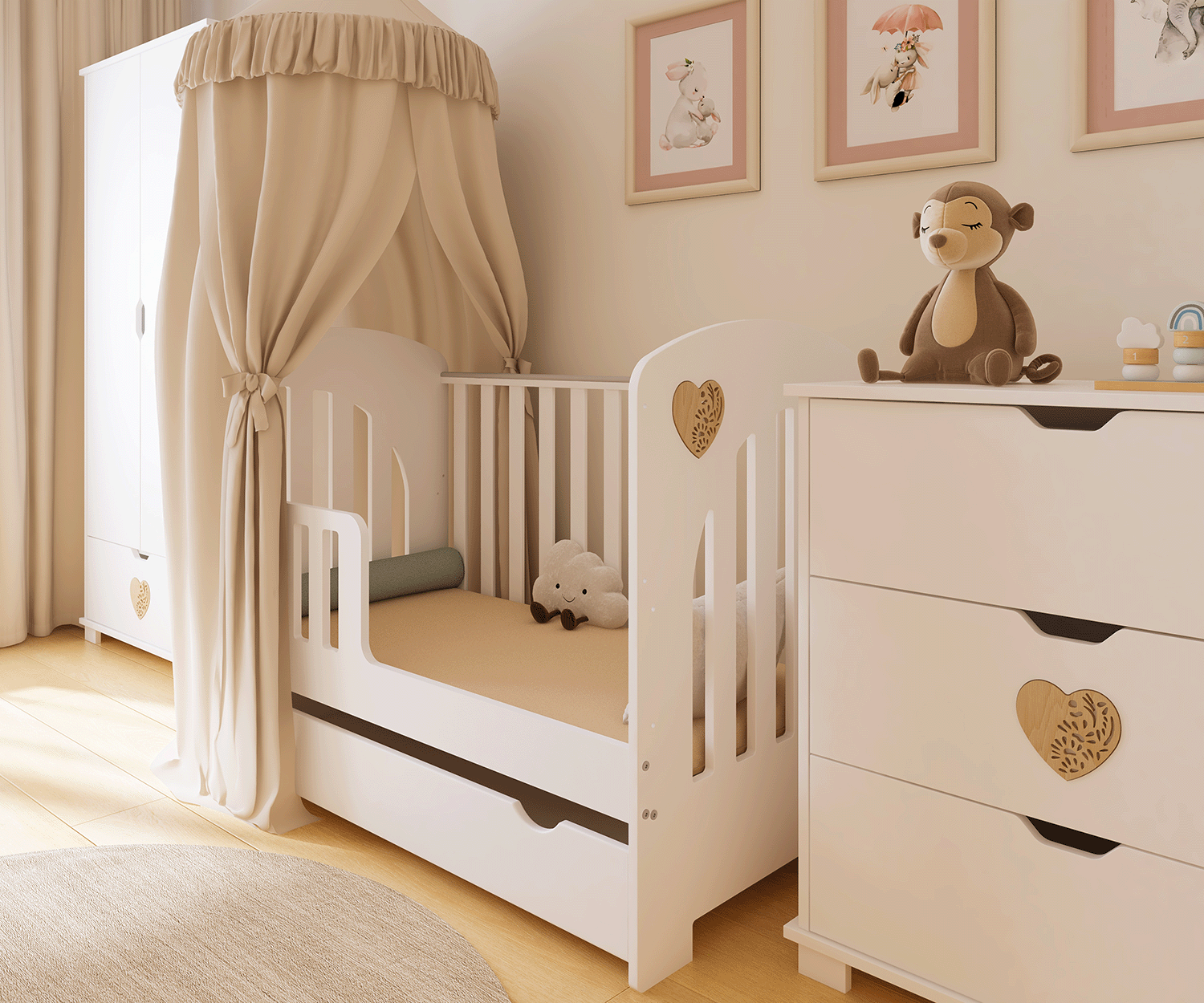 Model LOVE łączy prostą, nowoczesną formę z delikatnym dziecięcym akcentem w postaci dekoracyjnego serduszka. Charakterystyczne wycięcia we frontach szuflad zastępują uchwyty, zwiększając bezpieczeństwo i komfort użytkowania. Komoda może zostać wyposażona w opcjonalny przewijak, który można w każdej chwili zdemontować, dzięki czemu mebel „rośnie” razem z dzieckiem.