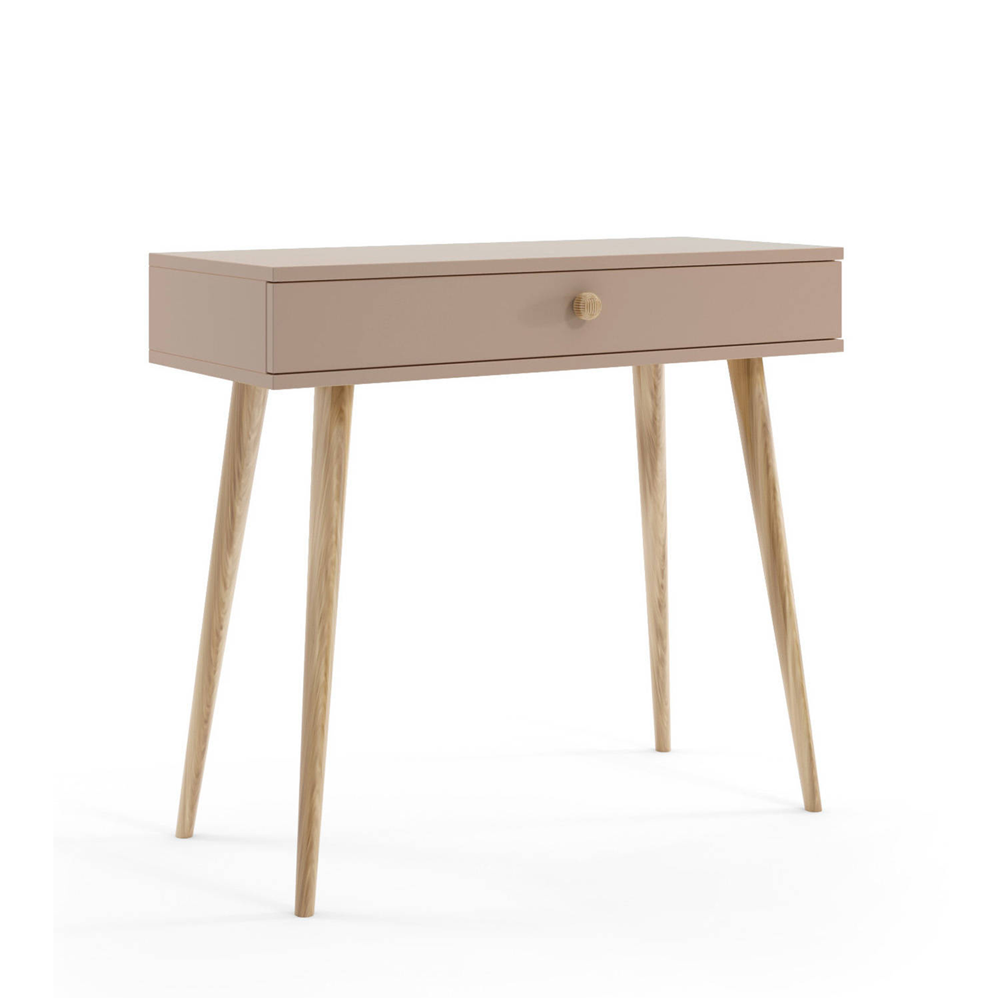 Konsola oraz toaletka 2w1 Milo to nie tylko praktyczny mebel do przedpokoju, ale również idealne rozwiązanie do sypialni lub pokoju córki. Szeroki blat i pojemna szuflada zapewniają miejsce do przechowywania drobiazgów, a wysokie, drewniane nóżki nadają meblowi lekkości. Konsola może posłużyć jako małe biurko lub toaletka, a wysokie nogi pozwalają na wsunięcie pod blat pufy lub krzesła.