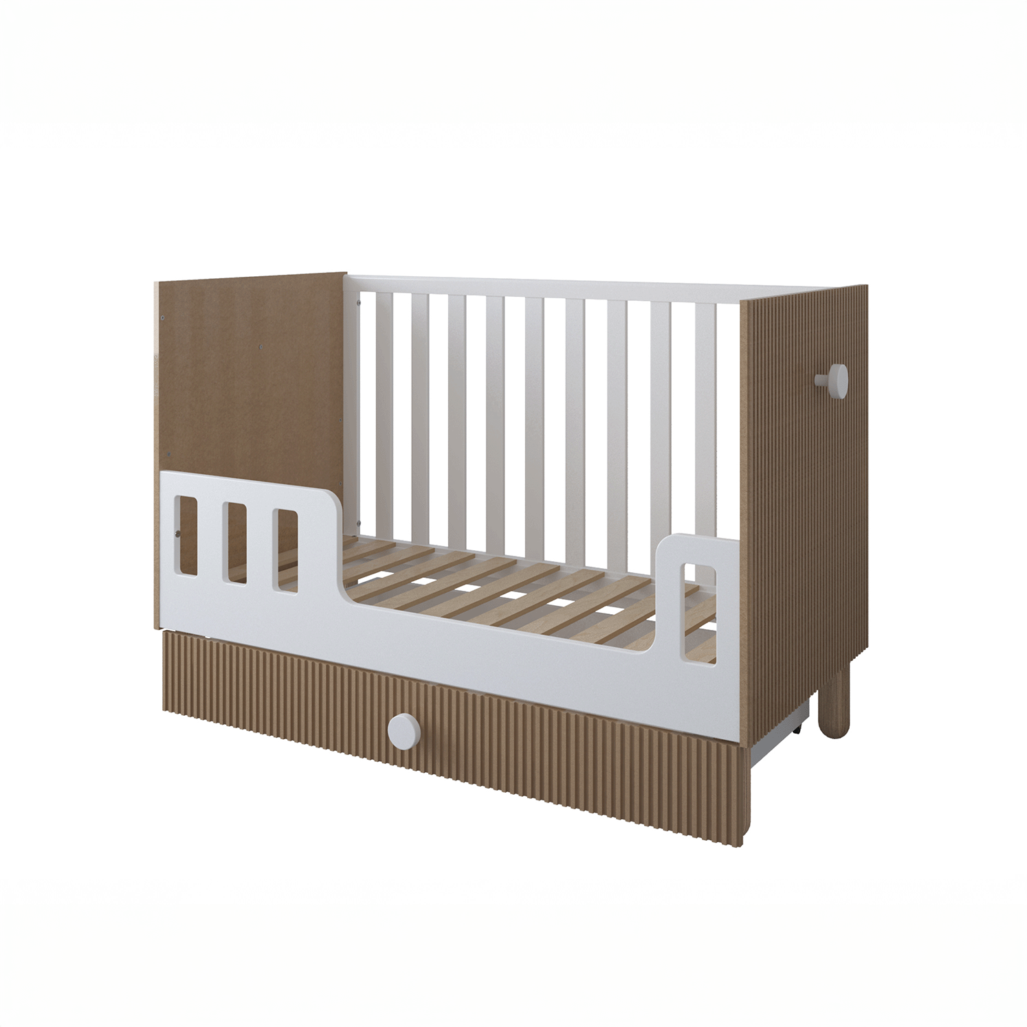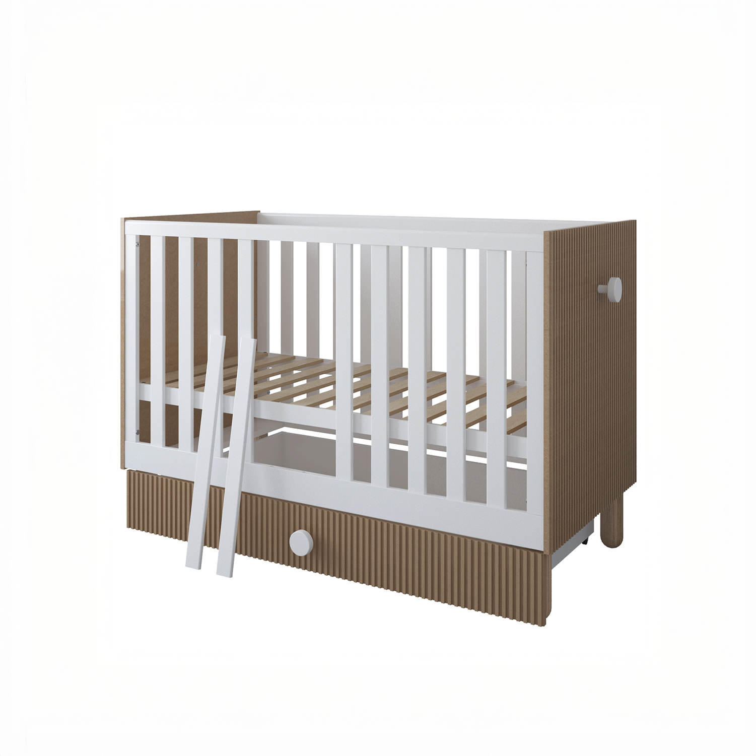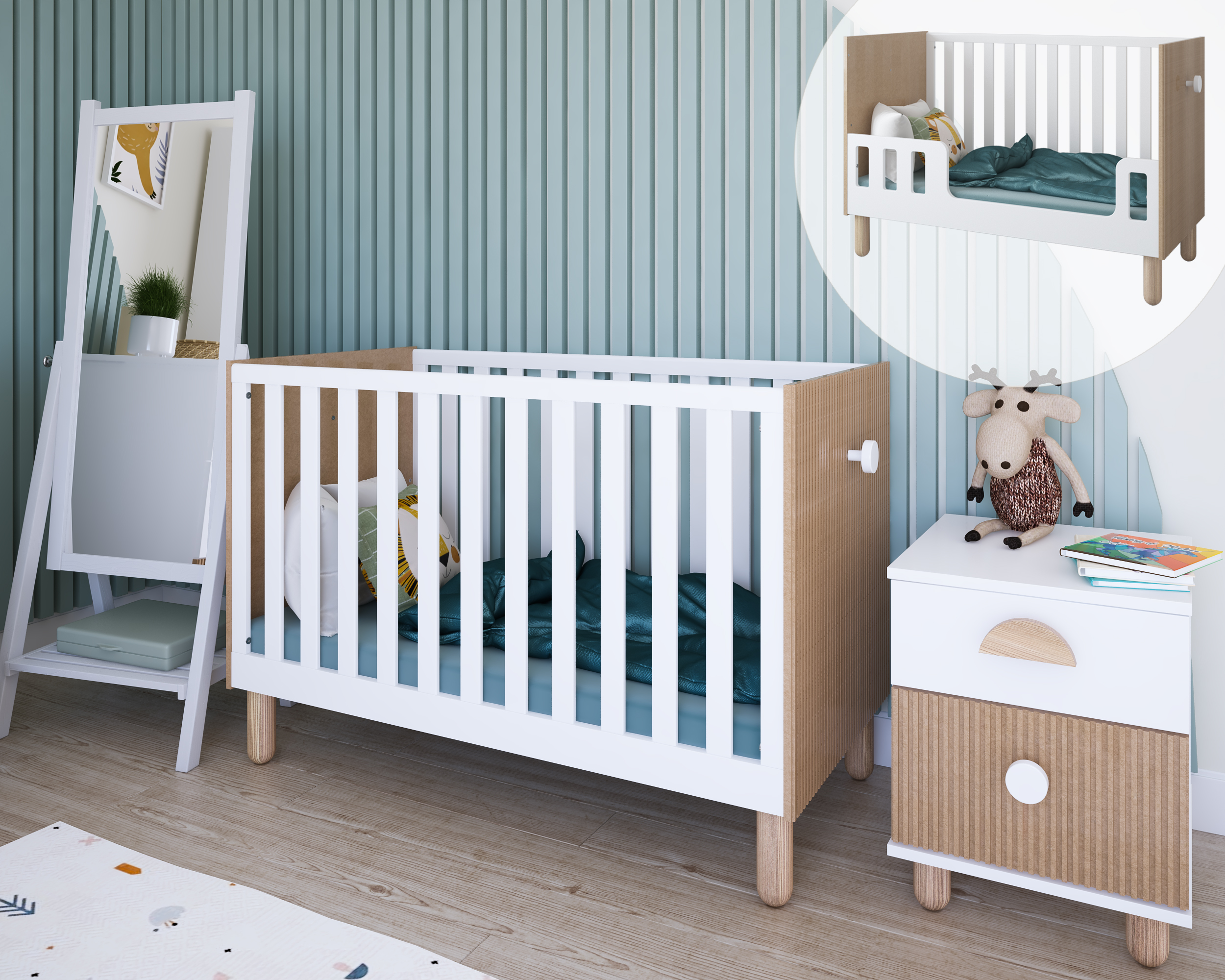 Łóżeczko 2w1 z kolekcji Cozy LOFT to idealne połączenie elegancji, funkcjonalności i troski o bezpieczeństwo najmłodszych. Prosta forma z drewnianymi detalami i subtelnymi frezowaniami tworzy harmonijny mebel, który doskonale wpisze się w aranżacje nowoczesnych wnętrz. Dzięki możliwości regulacji wysokości leżyska i wyjmowanym szczebelkom łóżeczko rośnie razem z dzieckiem, zapewniając komfort i praktyczność przez lata.