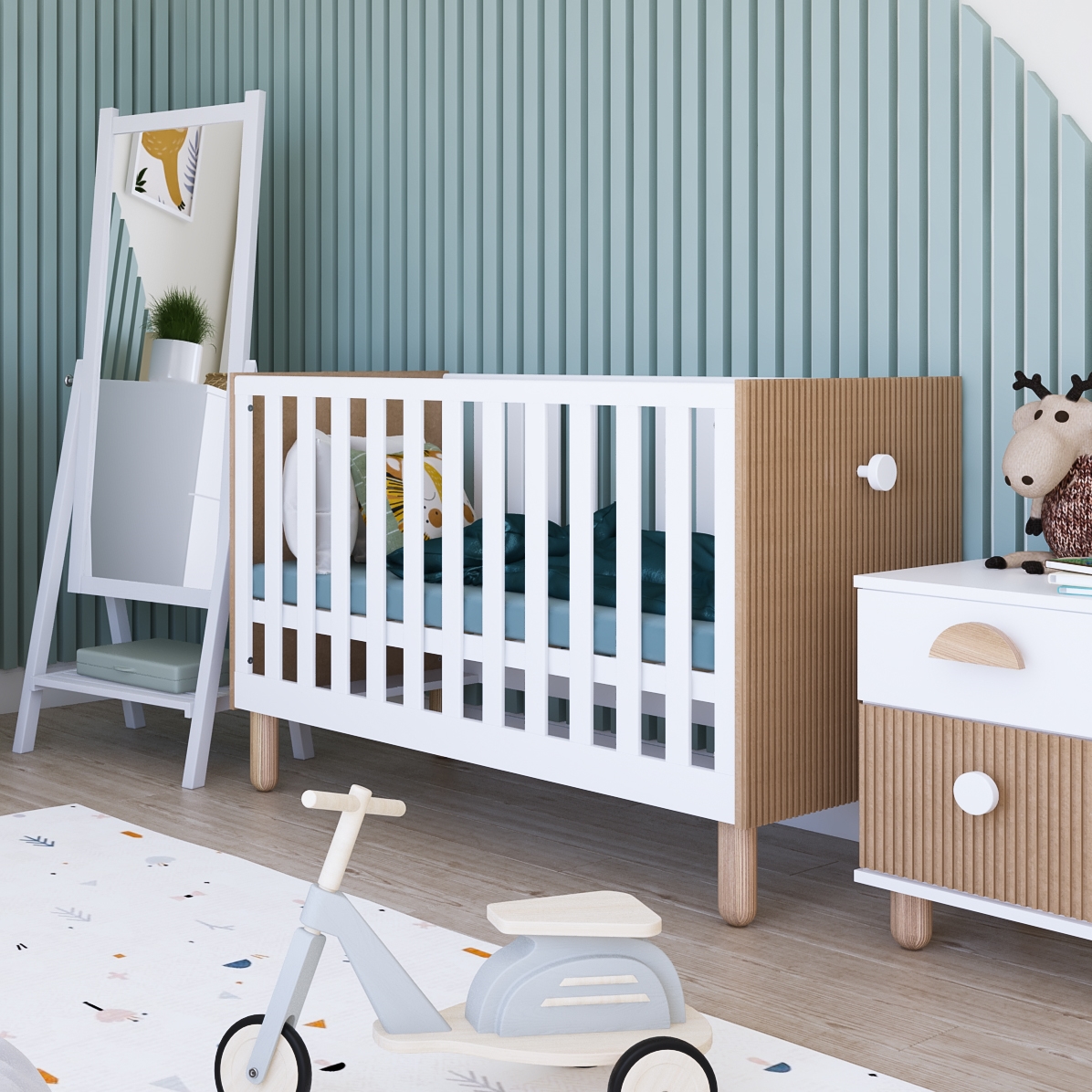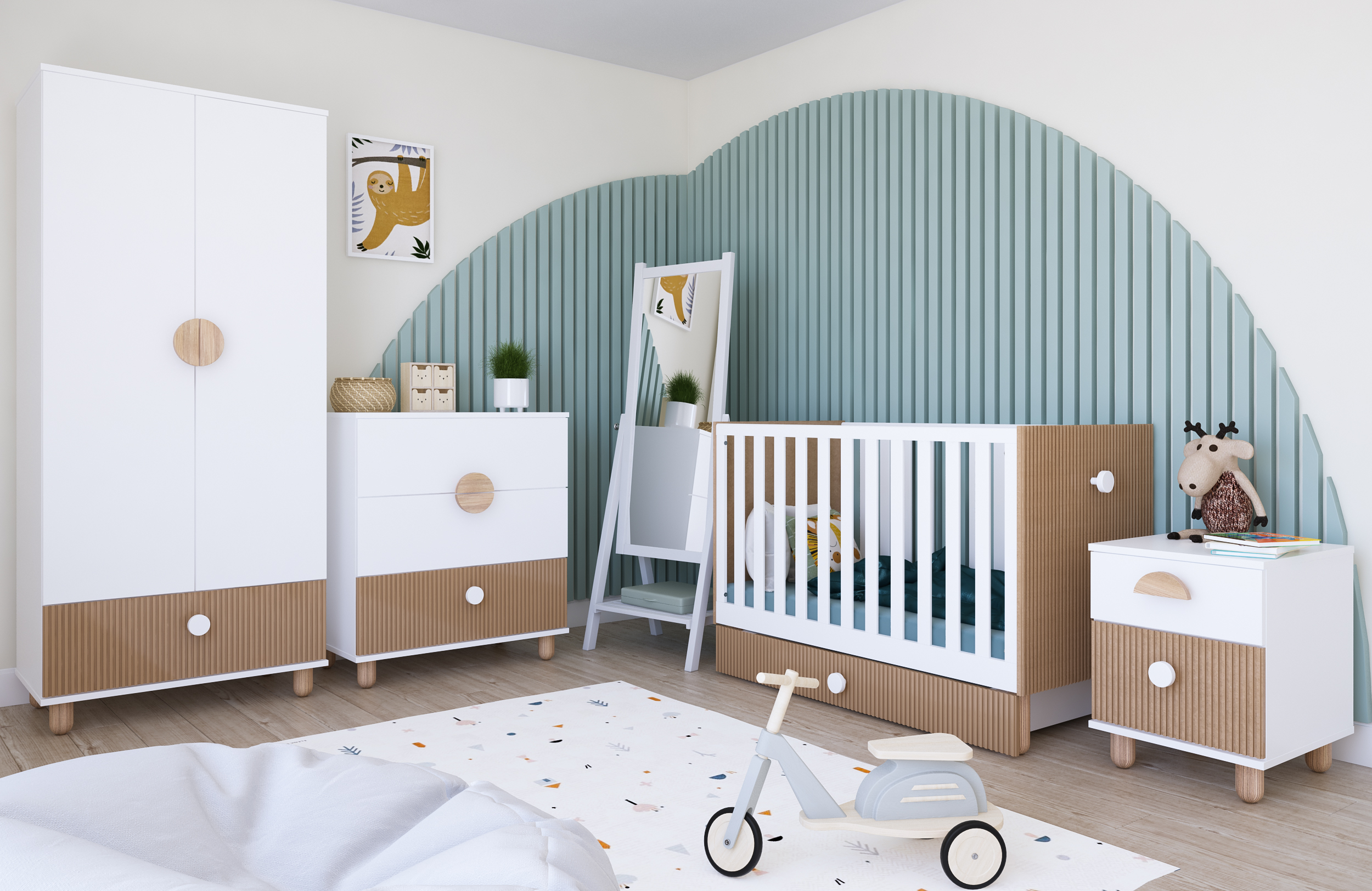 Stwórz spójną, funkcjonalną i piękną aranżację, łącząc łóżeczko z innymi meblami z kolekcji Cozy LOFT – komodą, szafą, regałem, biurkiem i szafką nocną. Razem tworzą przytulną przestrzeń, która rośnie wraz z Twoim dzieckiem.