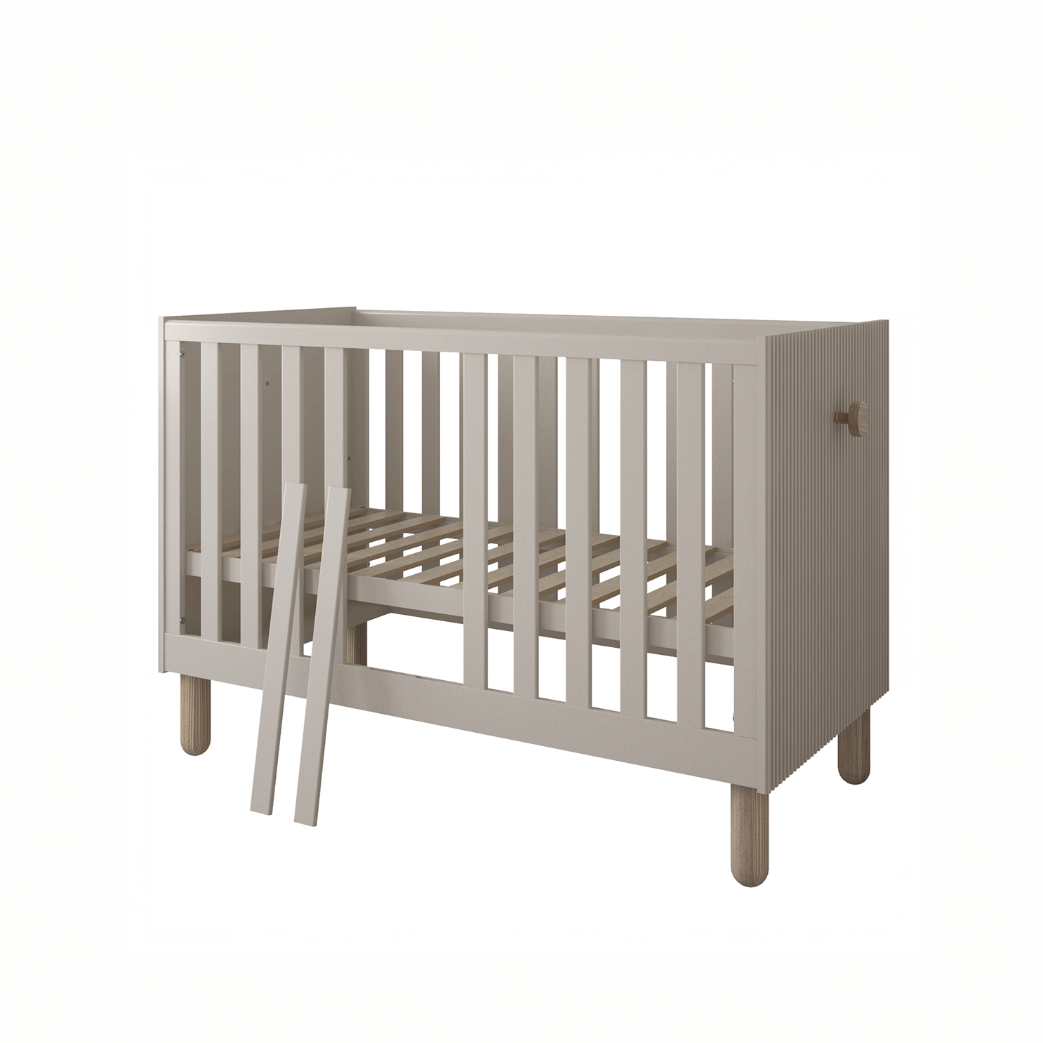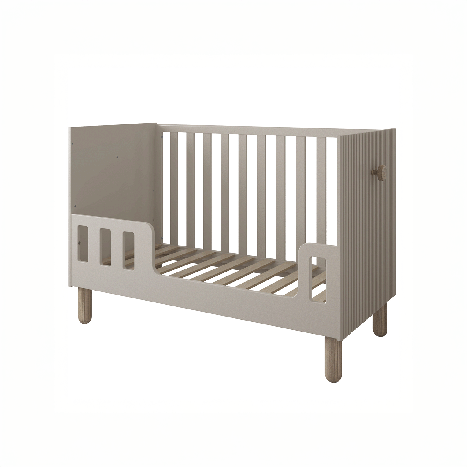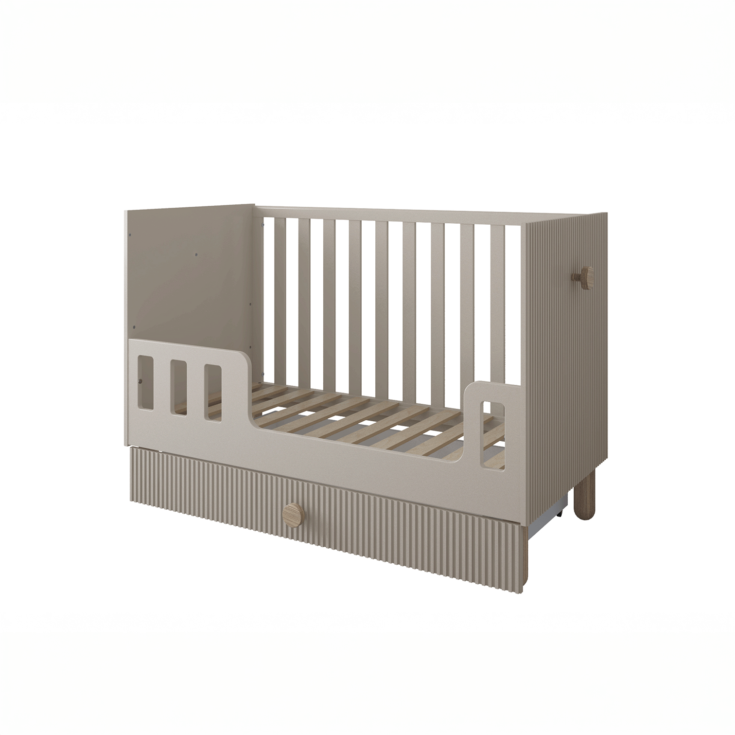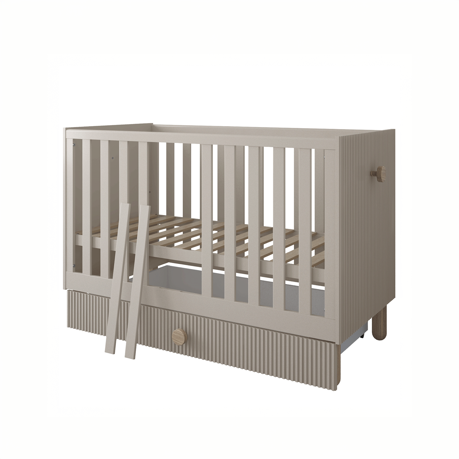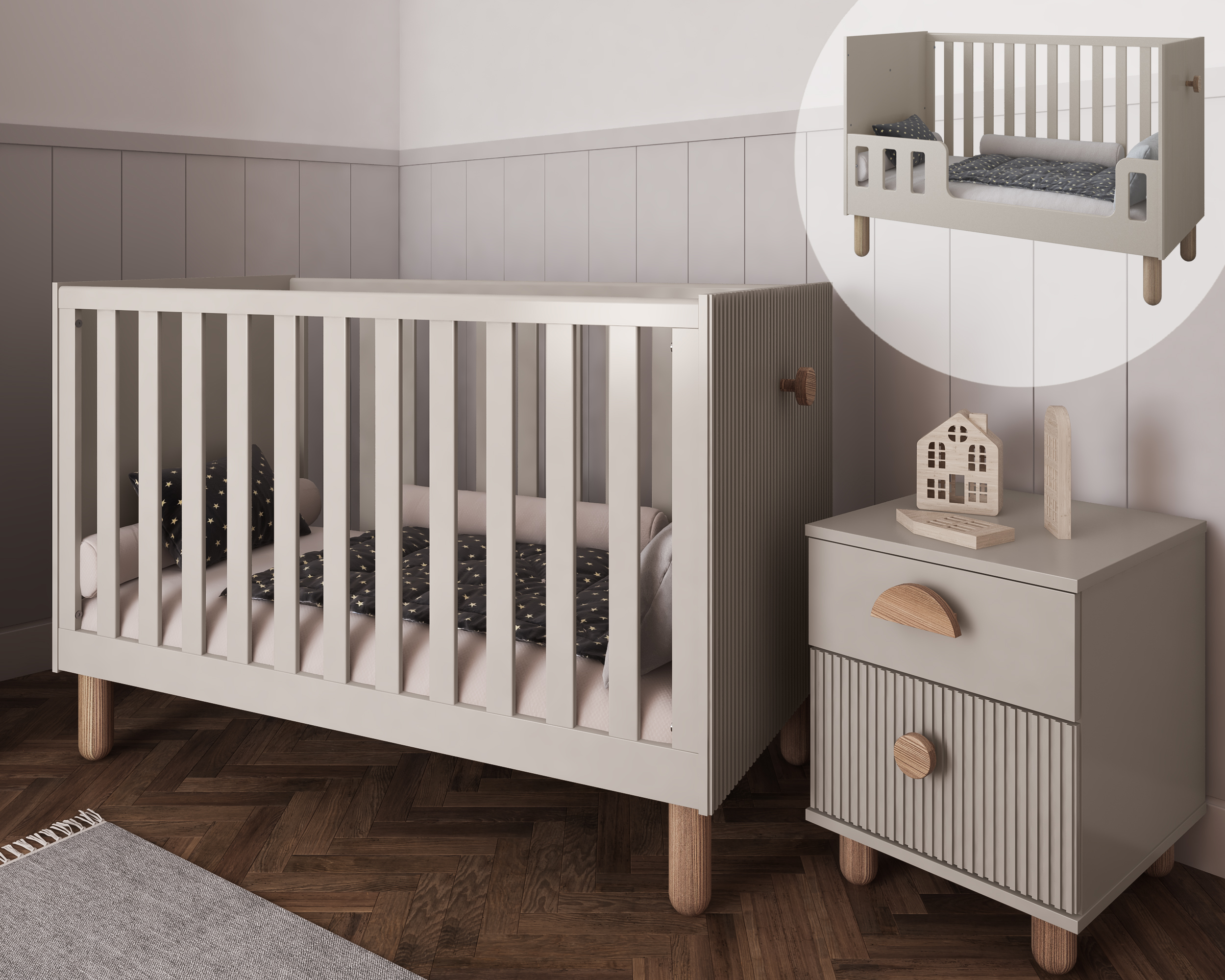 Łóżeczko 2w1 z kolekcji Cozy LOFT to idealne połączenie elegancji, funkcjonalności i troski o bezpieczeństwo najmłodszych. Prosta forma z drewnianymi detalami i subtelnymi frezowaniami tworzy harmonijny mebel, który doskonale wpisze się w aranżacje nowoczesnych wnętrz. Dzięki możliwości regulacji wysokości leżyska i wyjmowanym szczebelkom łóżeczko rośnie razem z dzieckiem, zapewniając komfort i praktyczność przez lata.