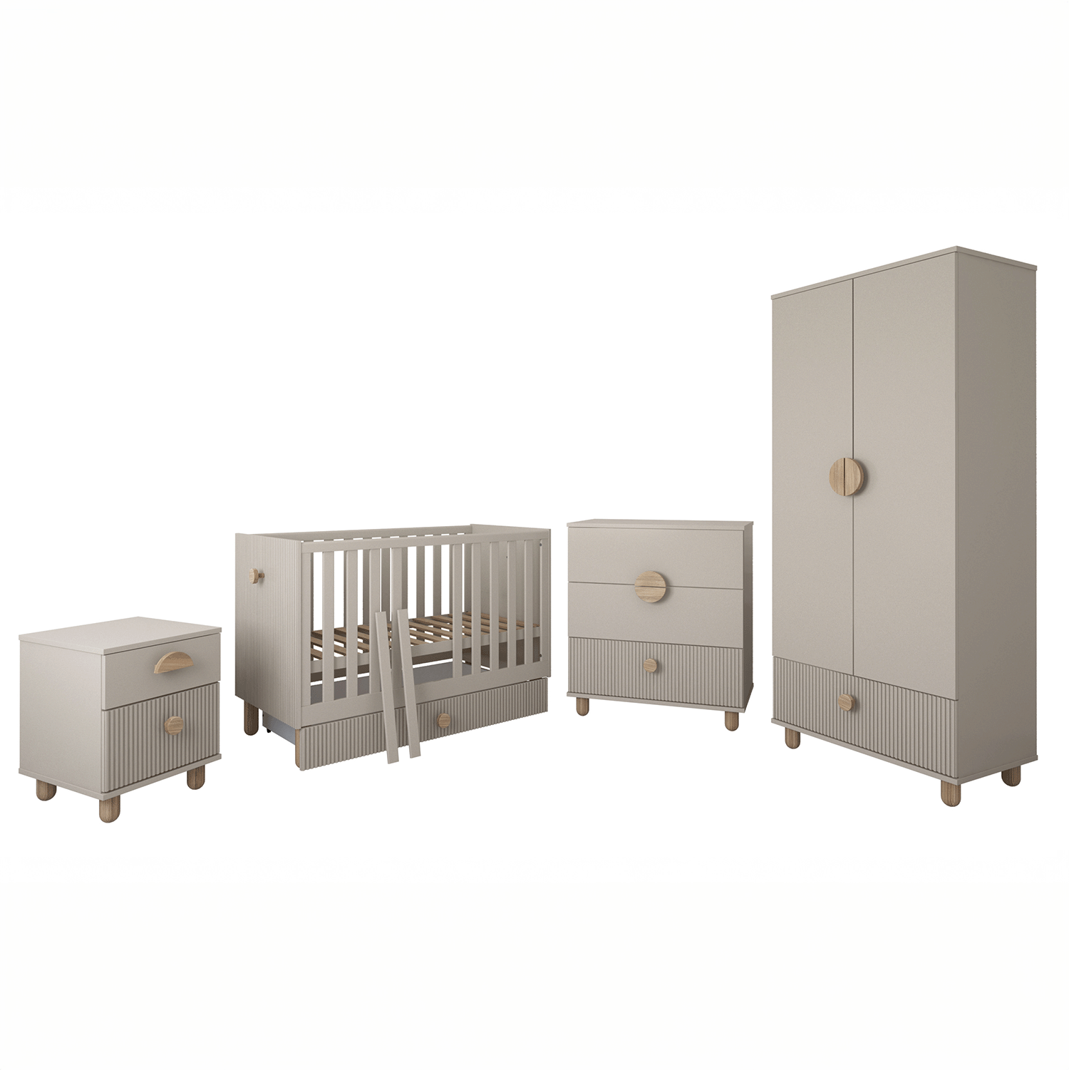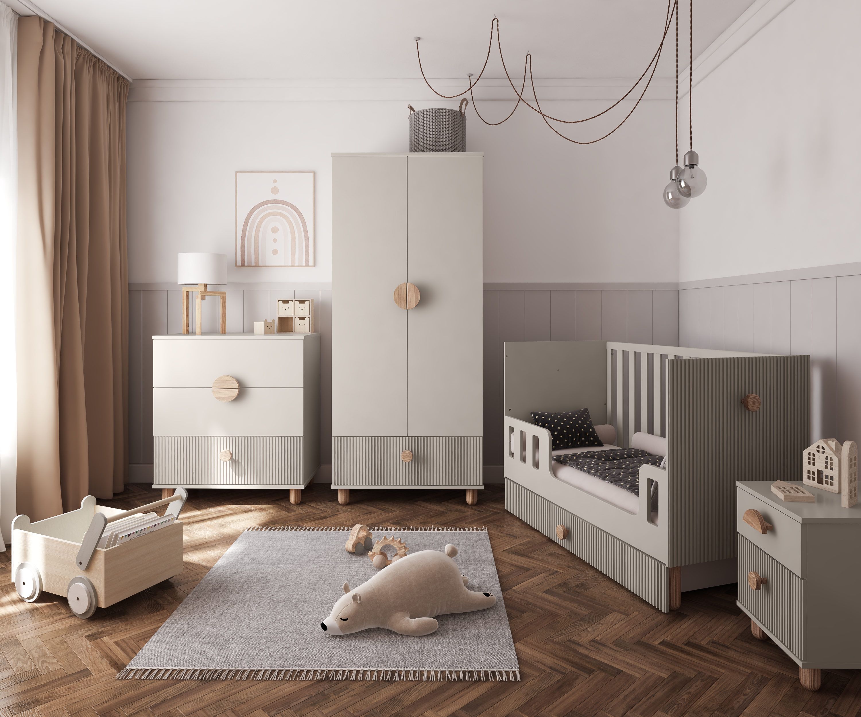 Stwórz spójną, funkcjonalną i piękną aranżację, łącząc łóżeczko z innymi meblami z kolekcji Cozy LOFT – komodą, szafą, regałem, biurkiem i szafką nocną. Razem tworzą przytulną przestrzeń, która rośnie wraz z Twoim dzieckiem.