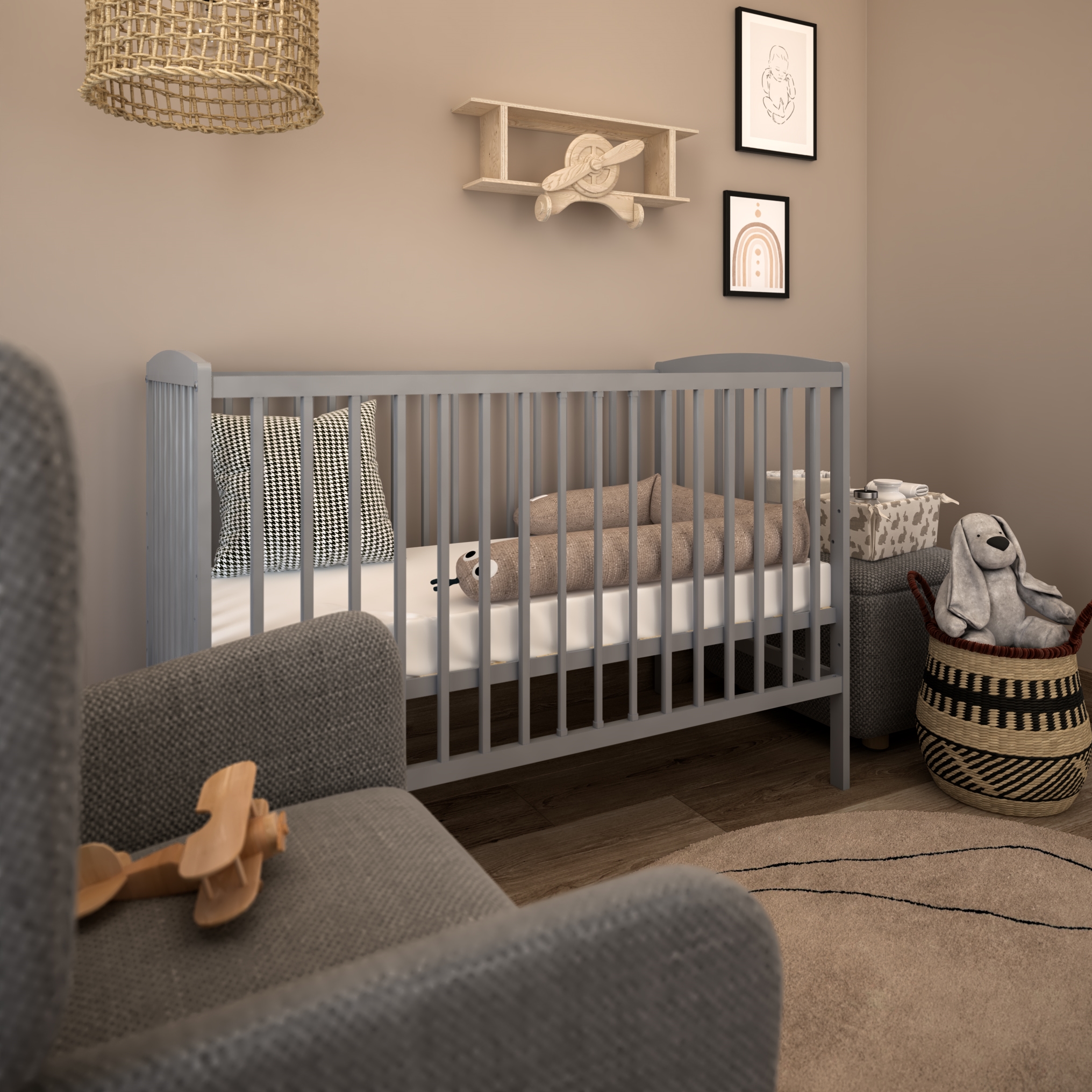 Łóżeczko niemowlęce BASIC 120x60 w kolorze szarym lub naturalnym to solidne, bezpieczne i funkcjonalne łóżeczko drewniane z regulacją wysokości leżyska oraz trzema wyciąganymi szczebelkami. Spełnienie normy EN 716-1, atestowane lakiery wodne oraz przemyślana konstrukcja czynią z niego trwały i bezpieczny wybór do pokoju niemowlęcia.