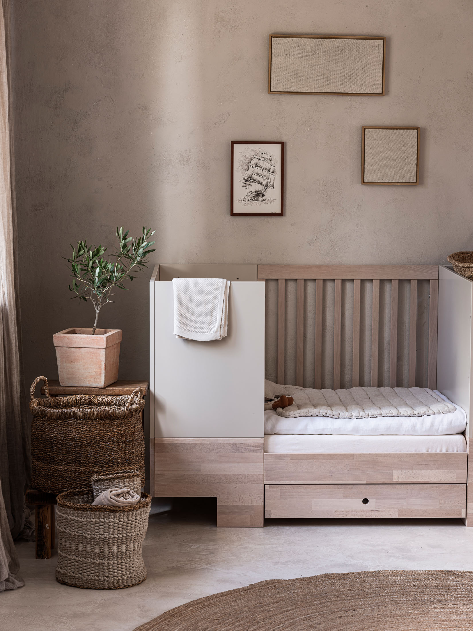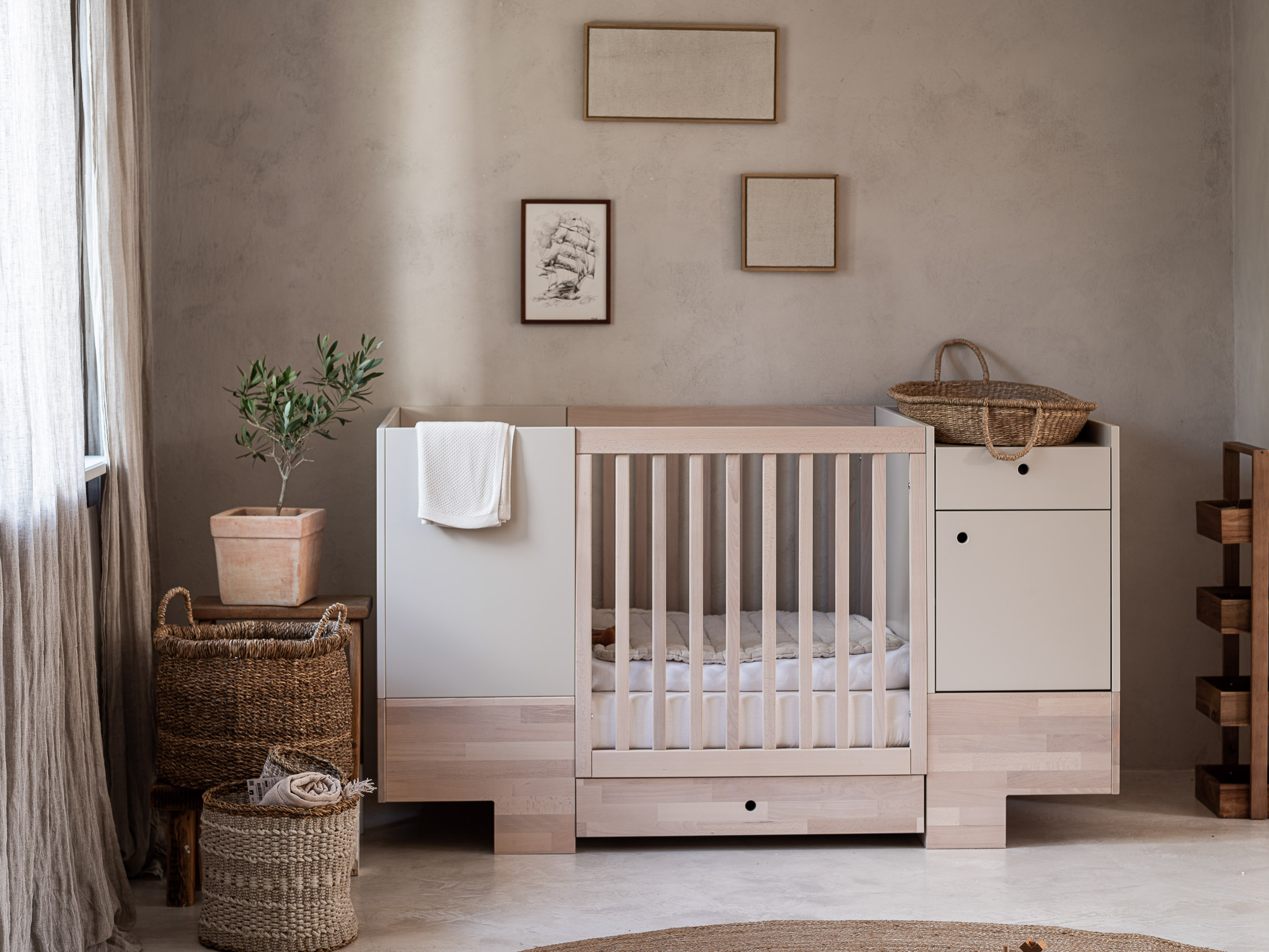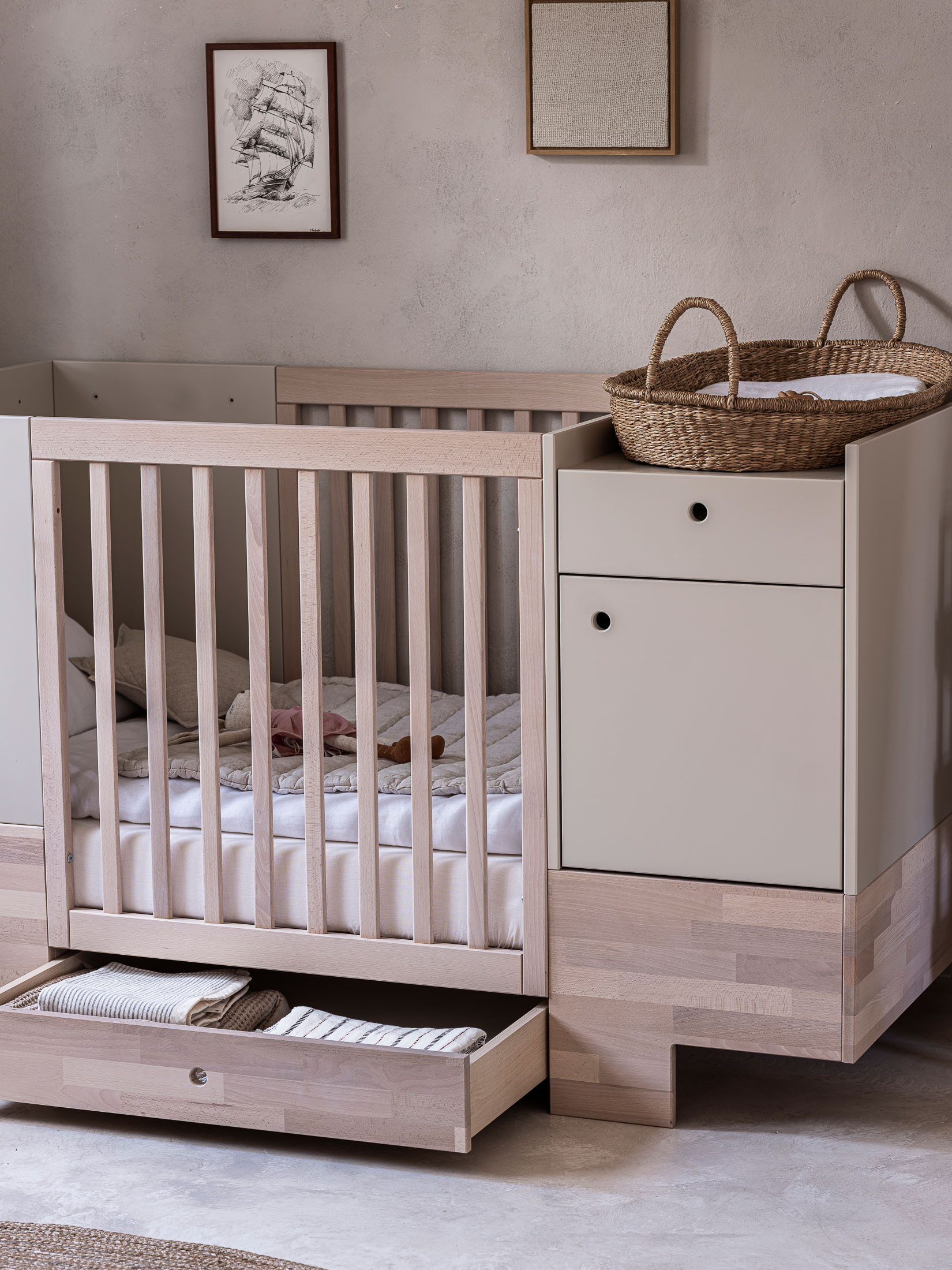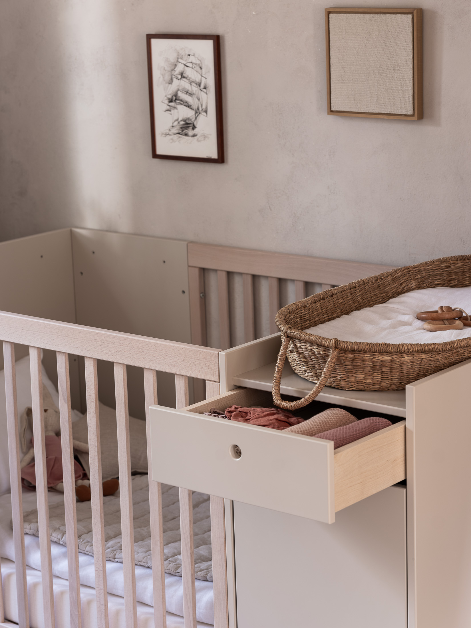 - Zintegrowana szafka z przewijakiem — półki oraz szuflada zapewniają wygodę podczas pielęgnacji.