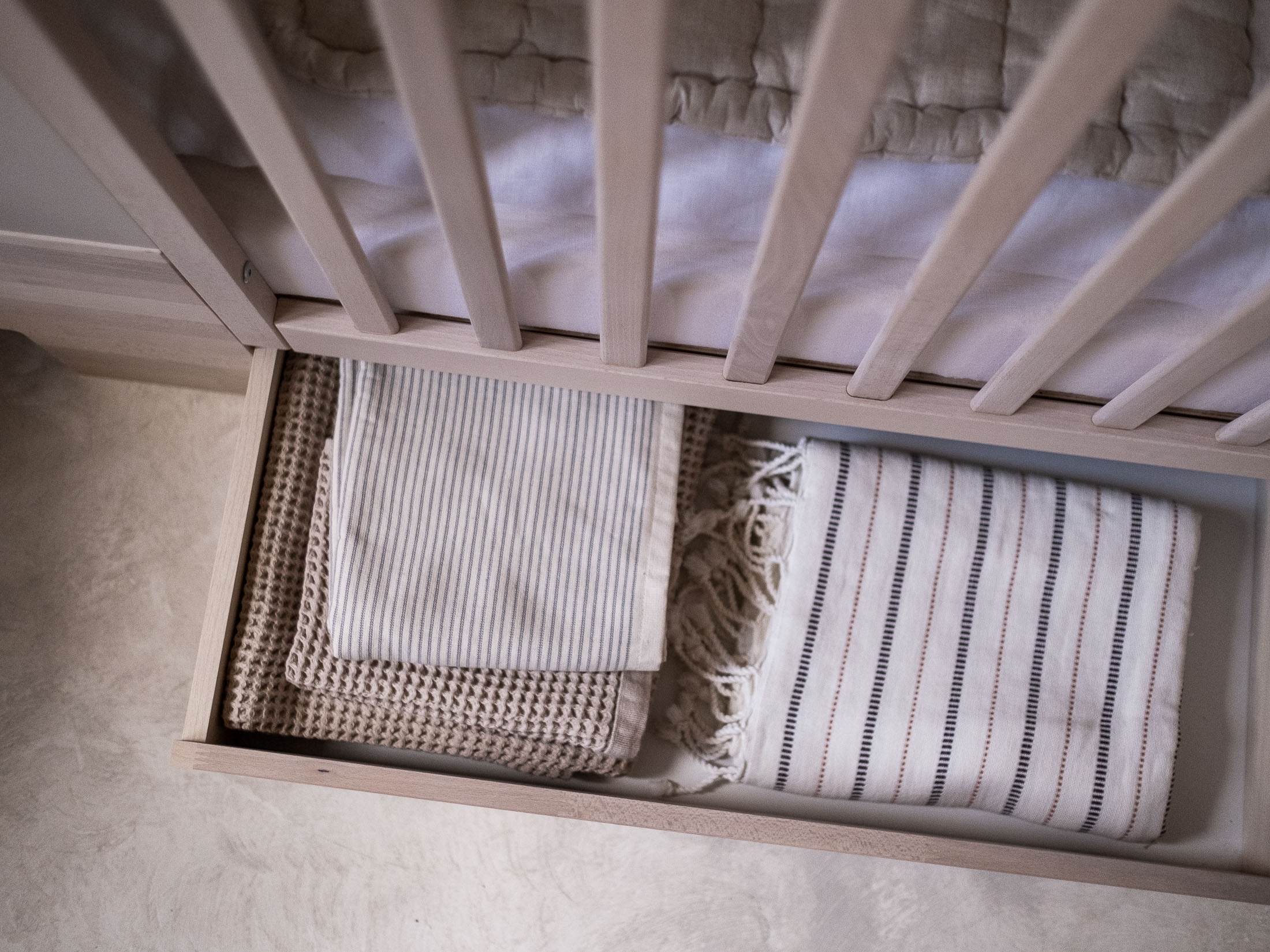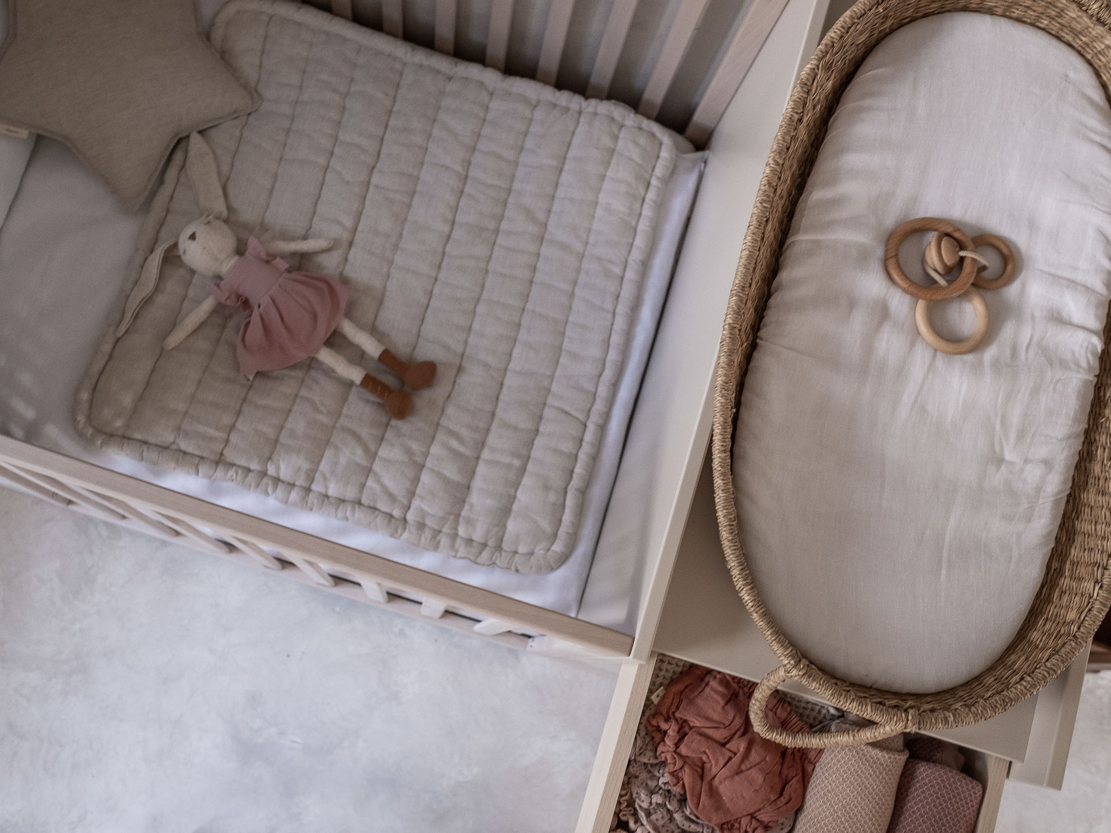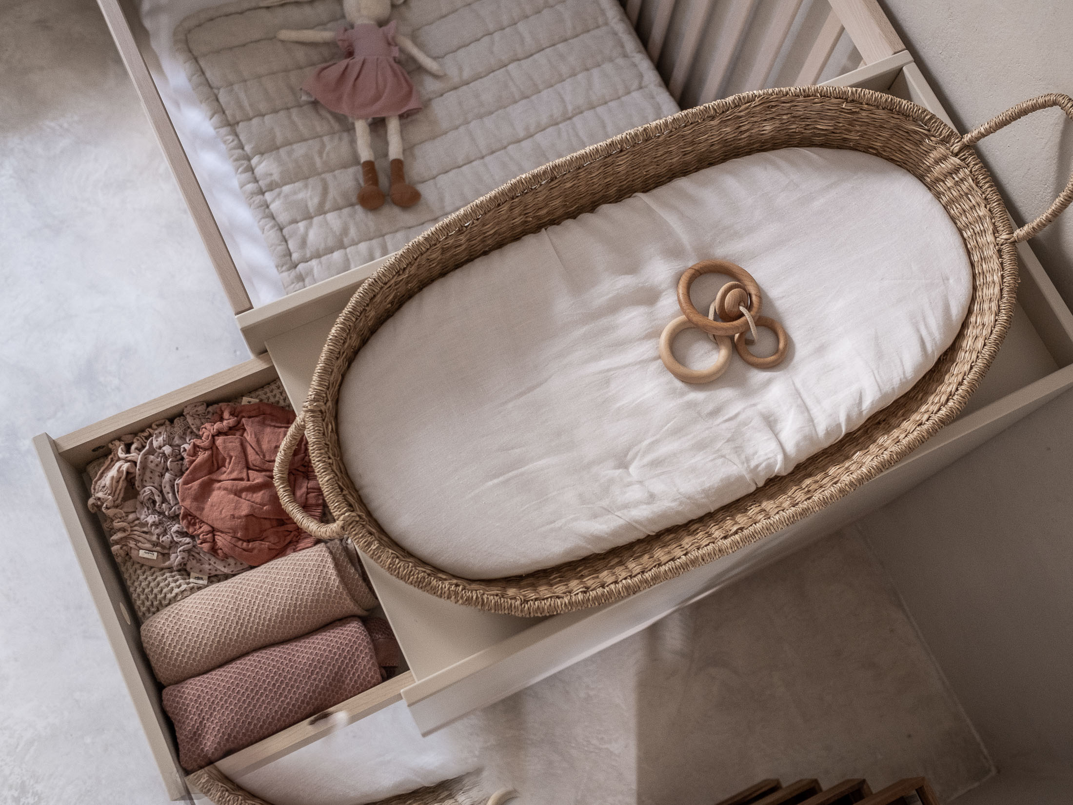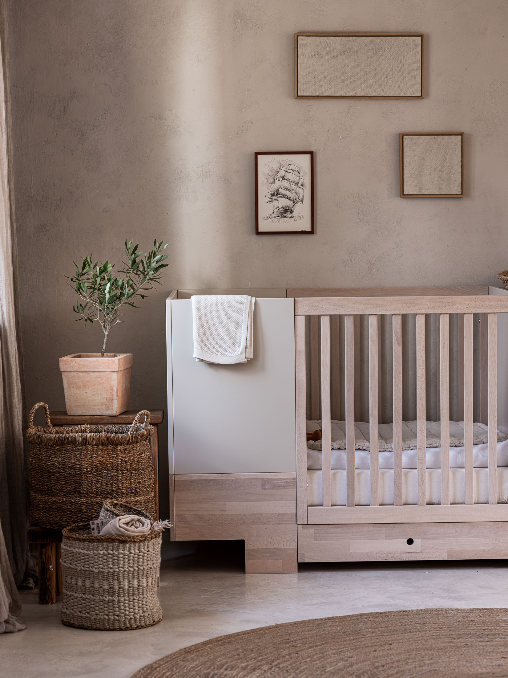 - Zintegrowana szafka z przewijakiem — półki oraz szuflada zapewniają wygodę podczas pielęgnacji.