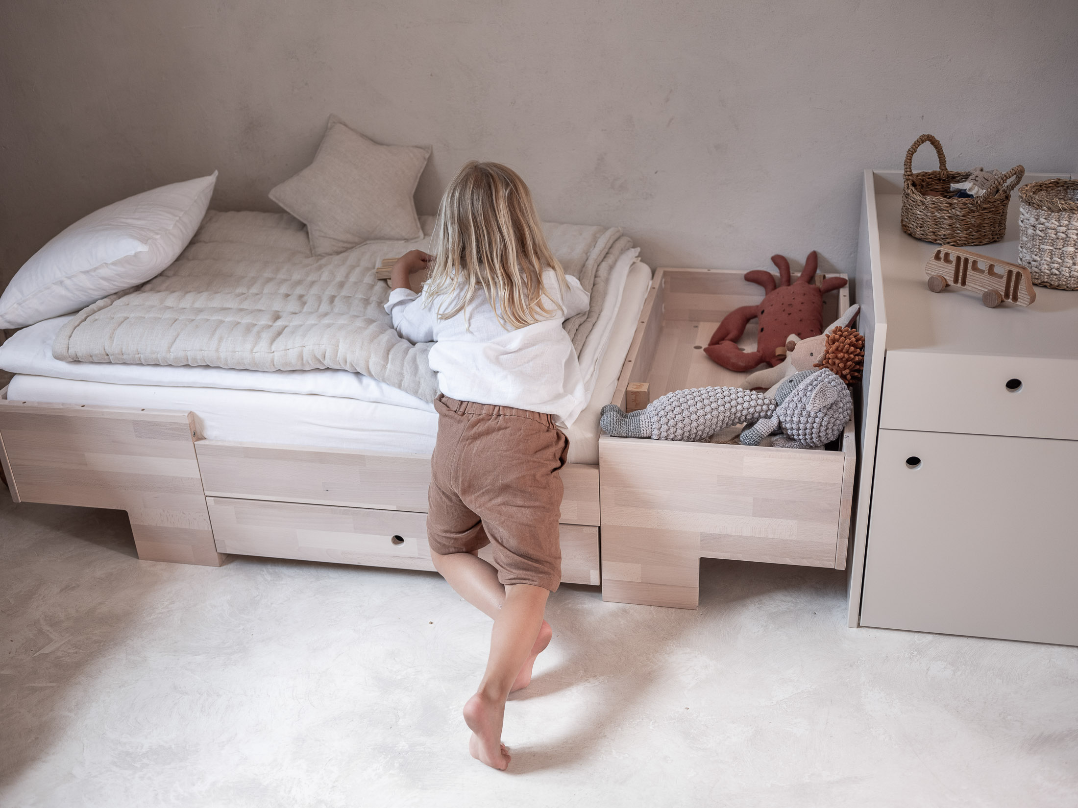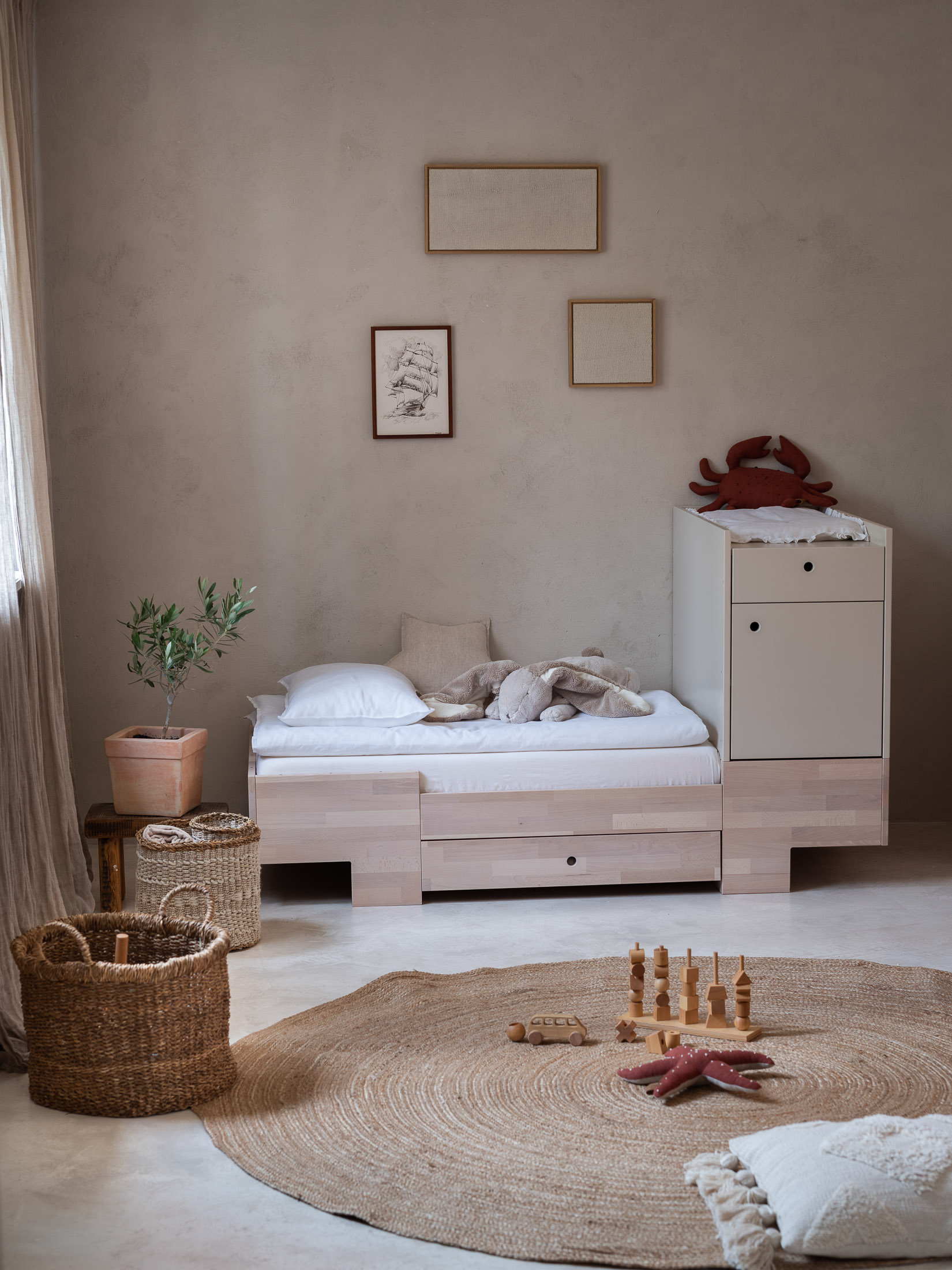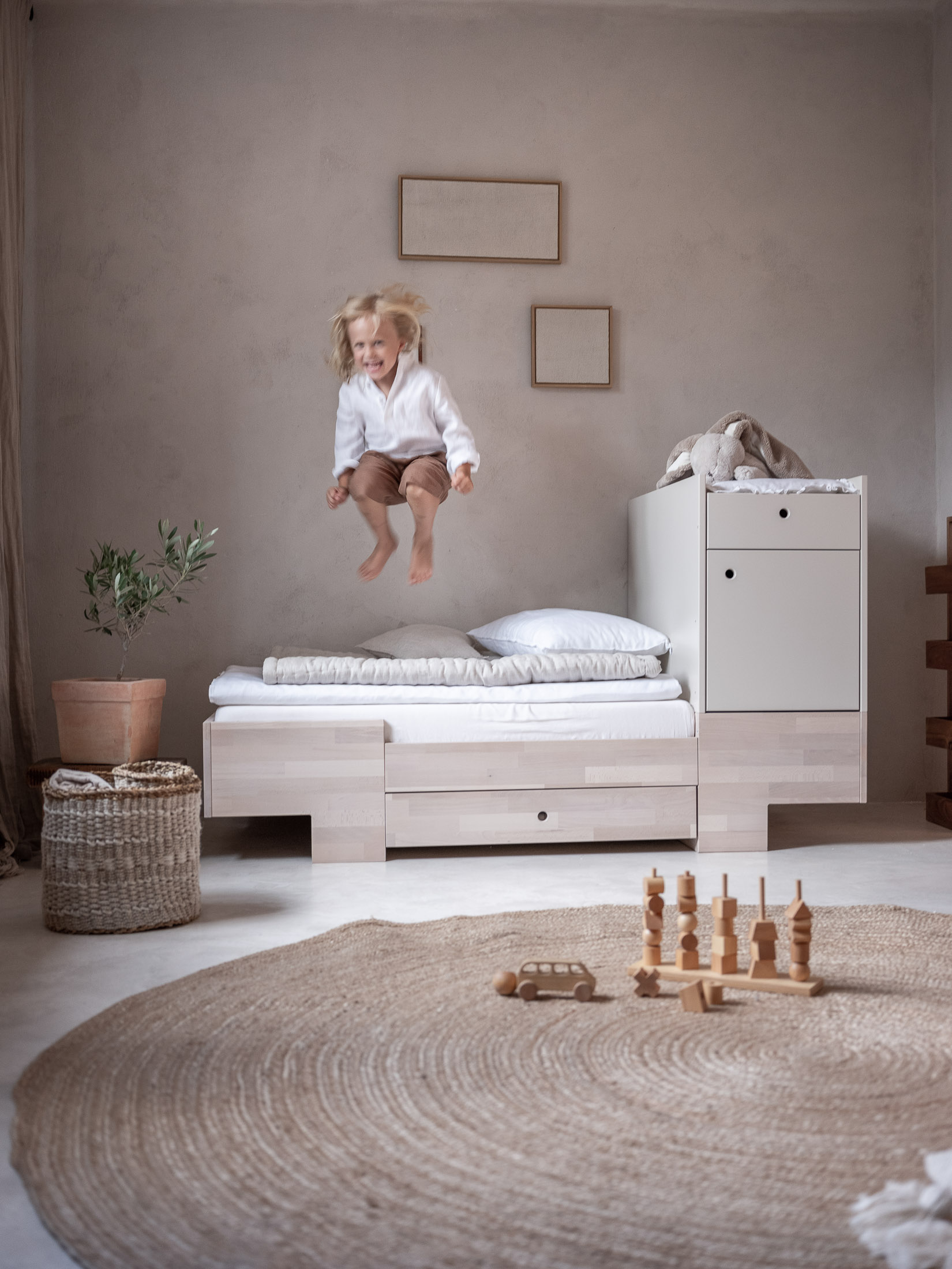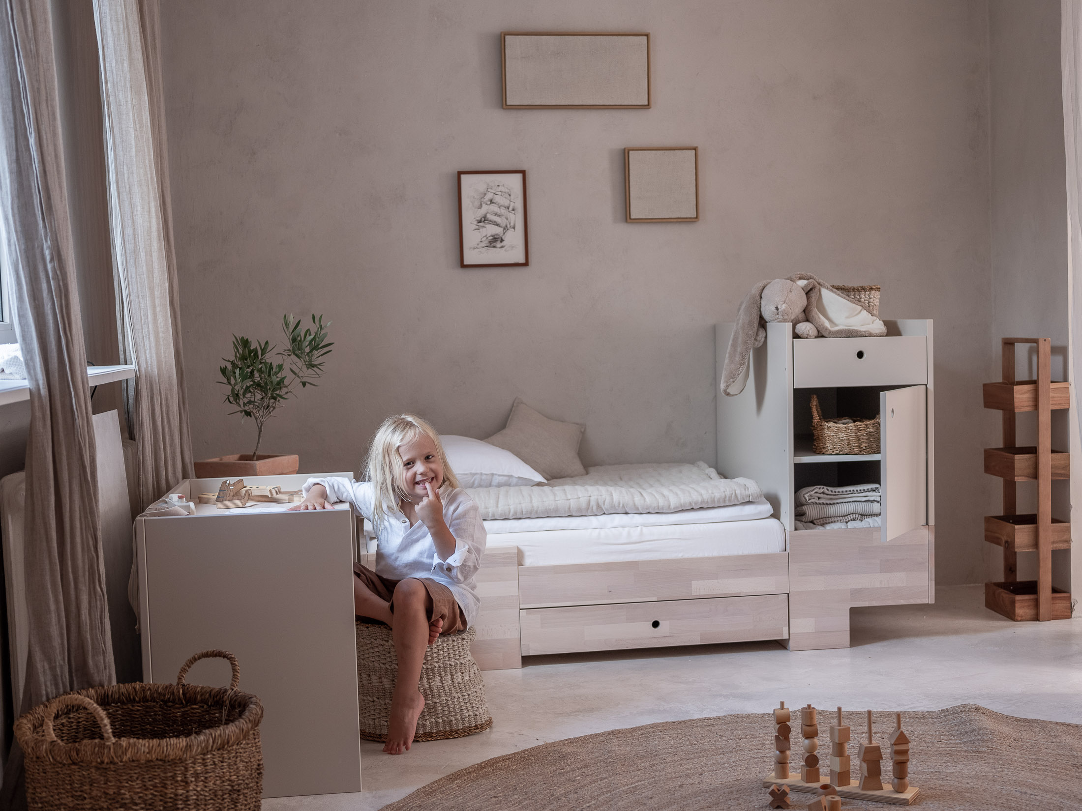 Łóżeczko wielofunkcyjne SmartBed do pokoju dziecięcego to innowacyjne rozwiązanie, które rośnie razem z dzieckiem i dostosowuje się do kolejnych etapów jego rozwoju. Na początku pełni funkcję kompaktowego łóżeczka niemowlęcego 80 × 120 cm z praktyczną szafką i przewijakiem, zapewniając wygodę podczas codziennej pielęgnacji. Z czasem może zostać przekształcone w samodzielne łóżko 80 × 160 cm, a dodatkowe elementy konstrukcyjne zyskują nowe funkcje — jako biurko, wolnostojąca szafka czy pojemnik na zabawki. To przemyślany, oszczędzający przestrzeń system meblowy do pokoju dziecka.