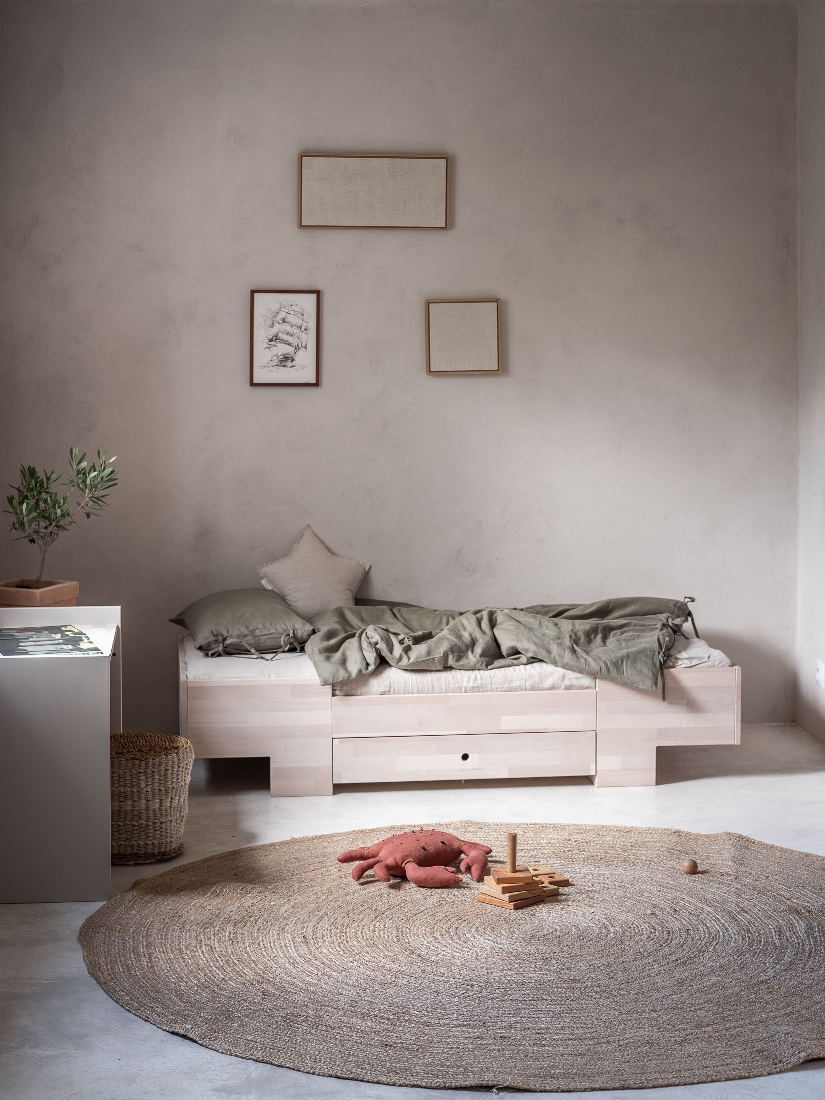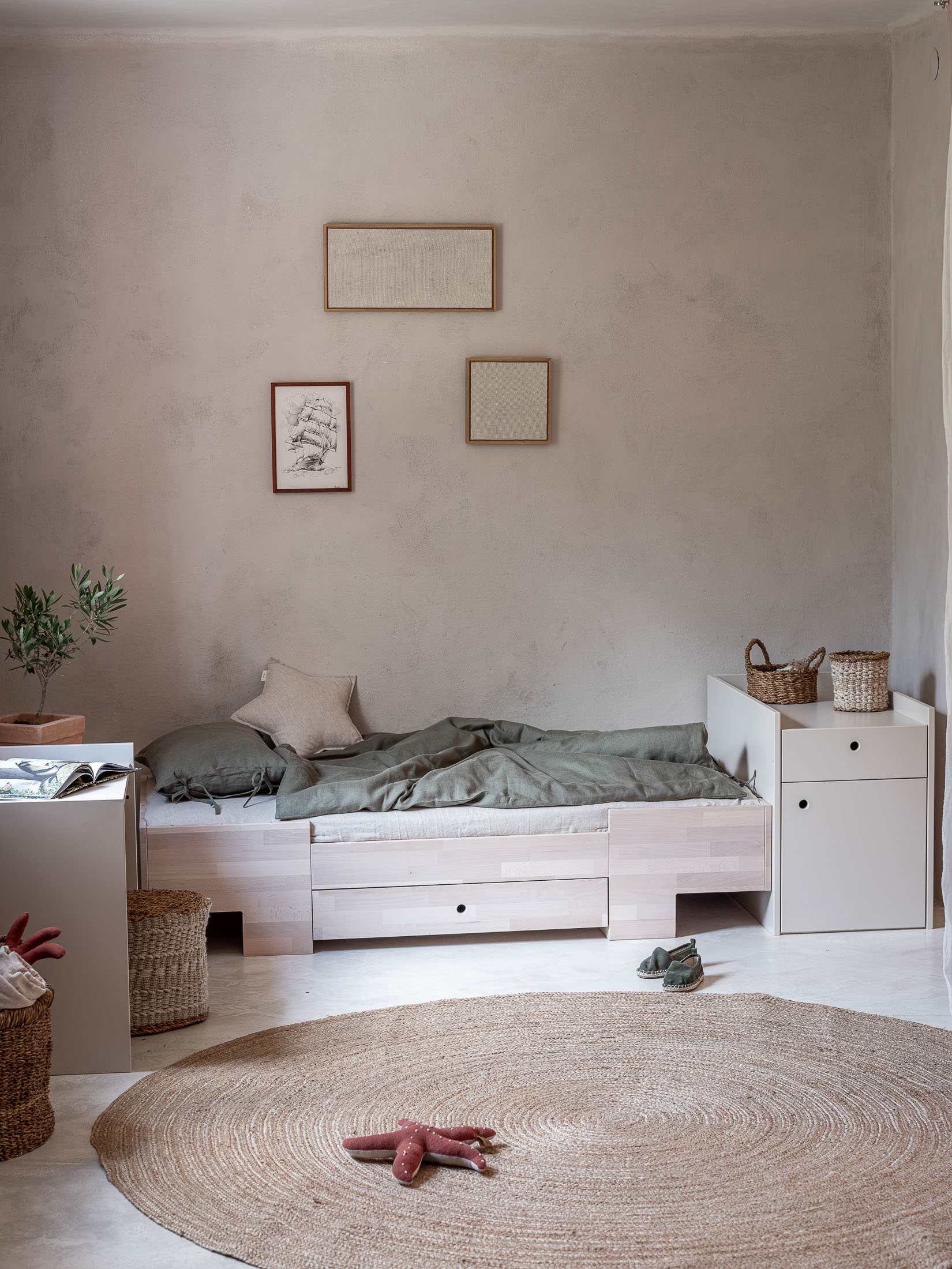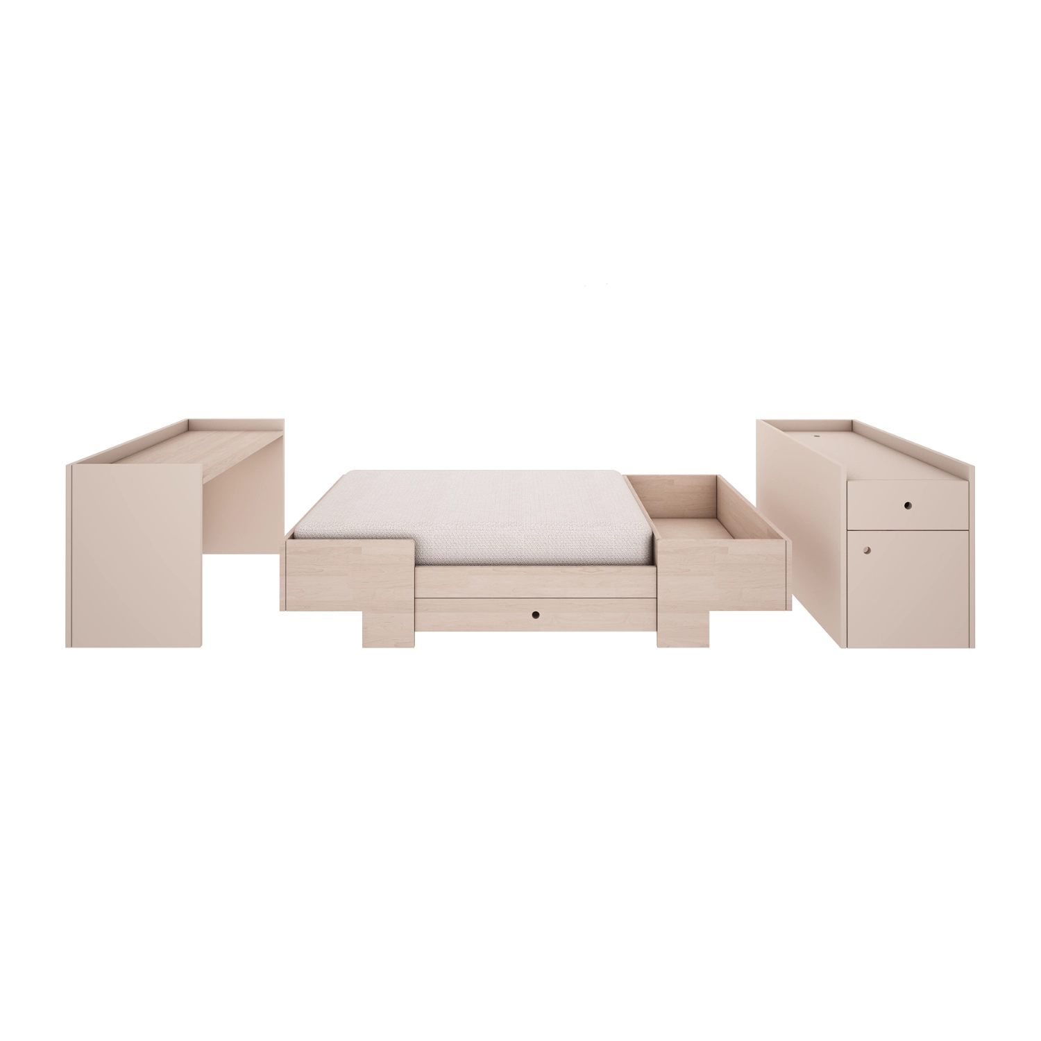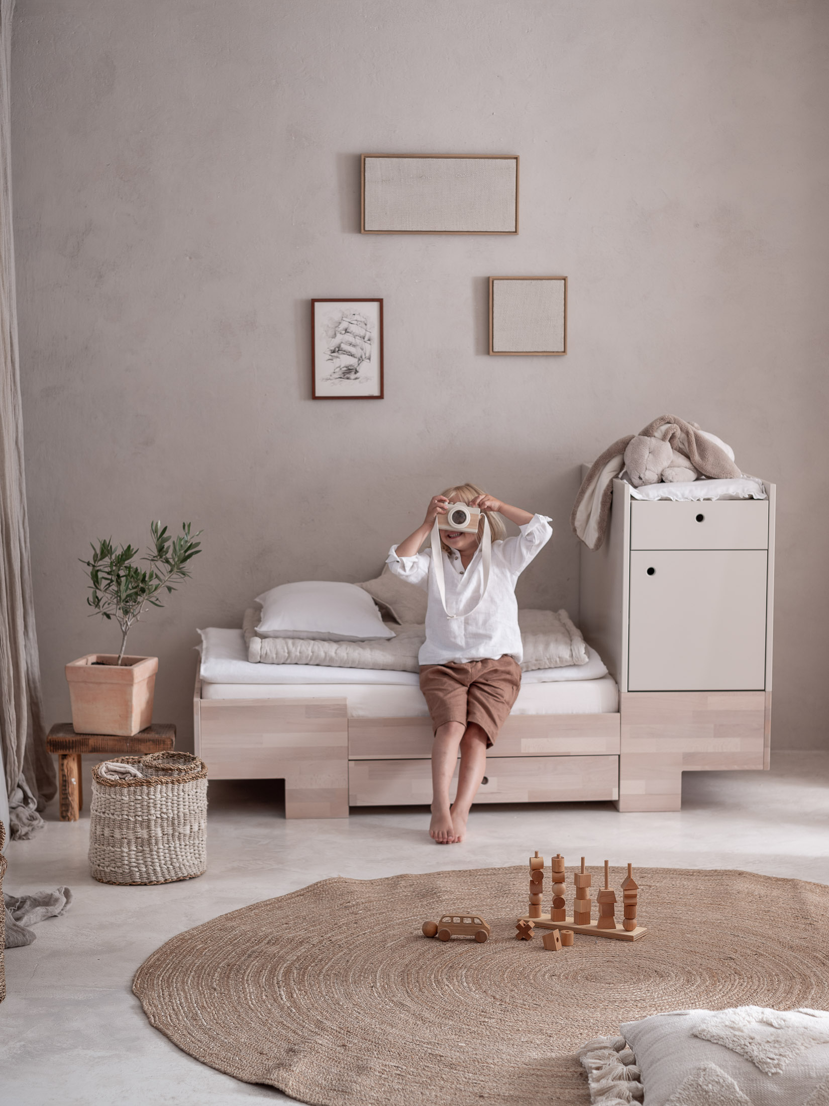 Łóżeczko wielofunkcyjne SmartBed do pokoju dziecięcego to innowacyjne rozwiązanie, które rośnie razem z dzieckiem i dostosowuje się do kolejnych etapów jego rozwoju. Na początku pełni funkcję kompaktowego łóżeczka niemowlęcego 80 × 120 cm z praktyczną szafką i przewijakiem, zapewniając wygodę podczas codziennej pielęgnacji. Z czasem może zostać przekształcone w samodzielne łóżko 80 × 160 cm, a dodatkowe elementy konstrukcyjne zyskują nowe funkcje — jako biurko, wolnostojąca szafka czy pojemnik na zabawki. To przemyślany, oszczędzający przestrzeń system meblowy do pokoju dziecka.
