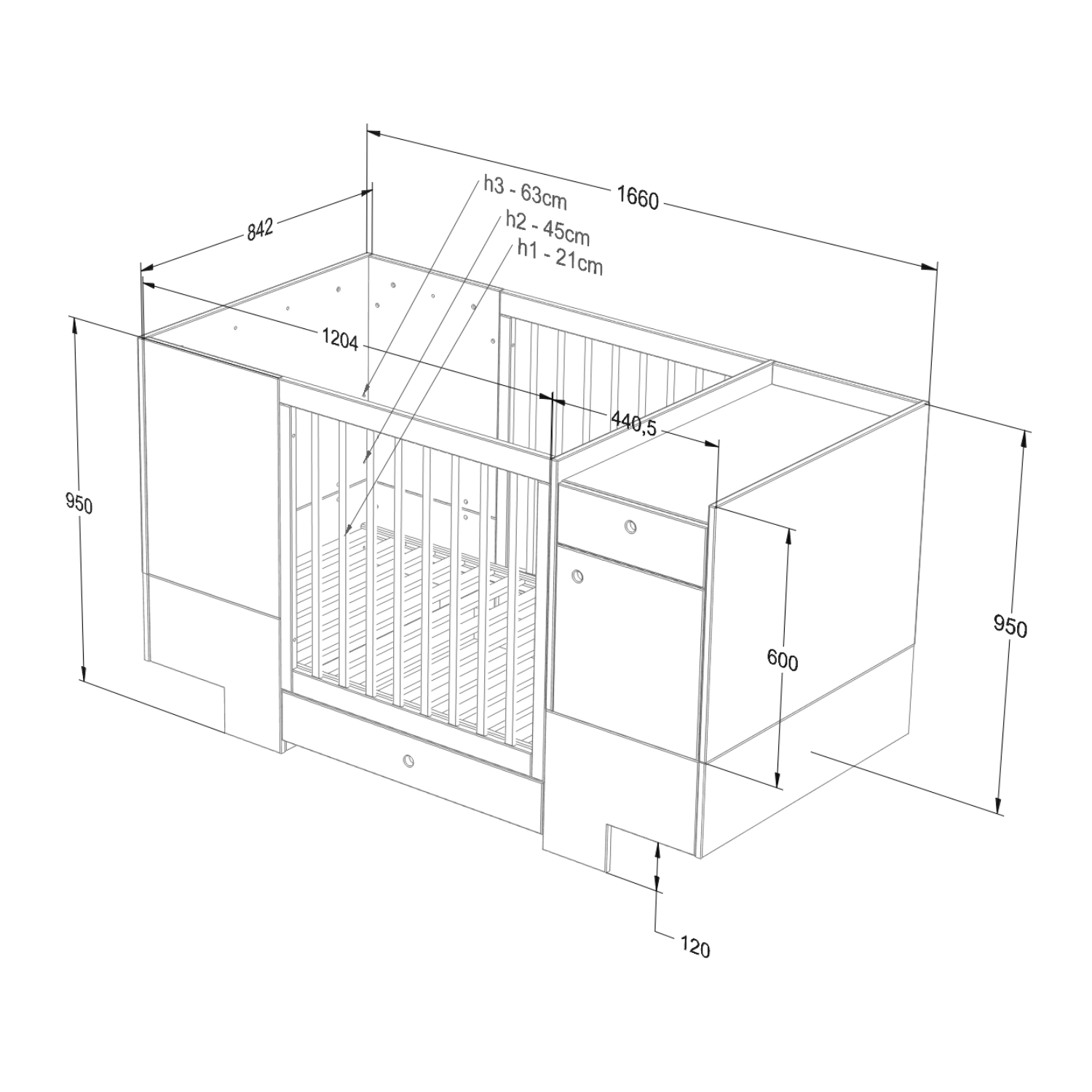 - 3 poziomy regulacji stelaża — dopasowanie wysokości materaca do wieku dziecka.