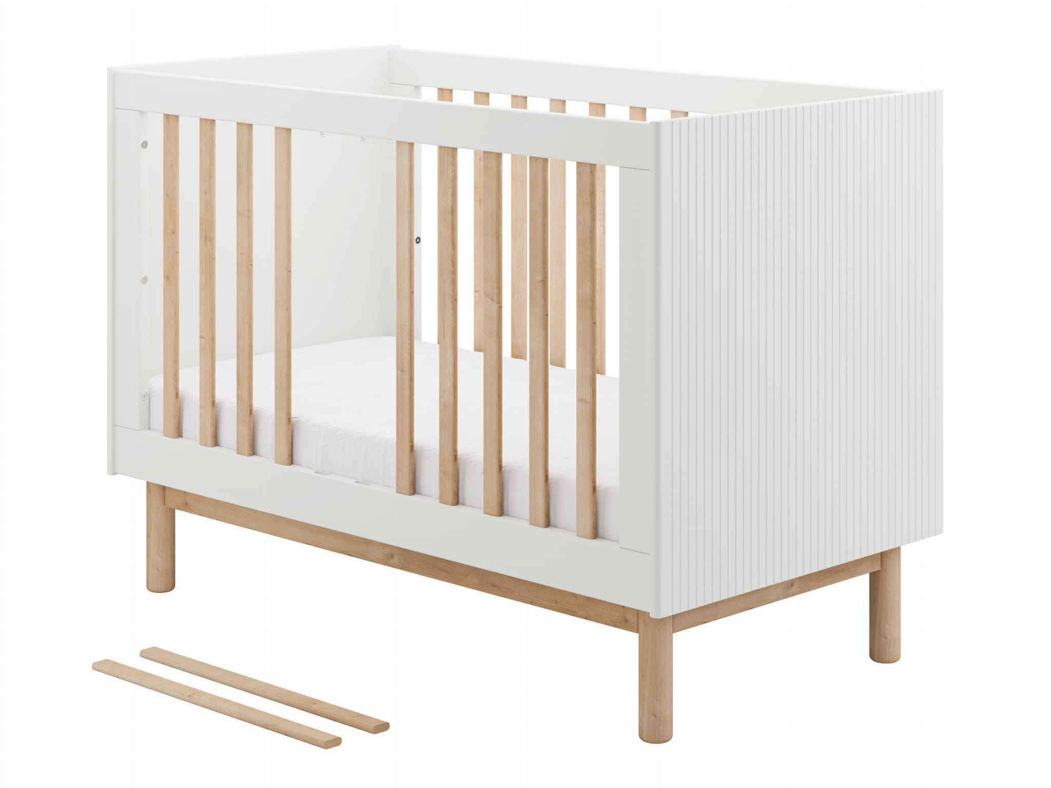 Łóżeczko Miloo 120x60 łączy styl, wygodę i funkcjonalność w jednym projekcie. Dzięki starannie dopracowanym detalom, ryflowanym frontom i solidnym bukowym nogom, stanowi wyjątkowy element dziecięcego pokoju. To mebel, który rośnie razem z dzieckiem i zapewnia mu spokojny sen przez lata.