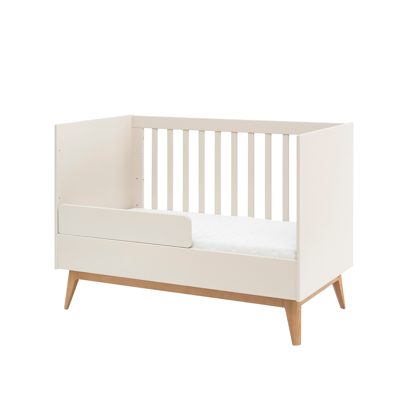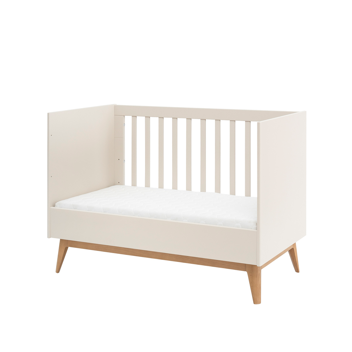 Dzięki możliwości zdjęcia jednego z boków mebel można łatwo przekształcić w wygodne „moje pierwsze łóżko”. Trzystopniowa regulacja wysokości materaca umożliwia dopasowanie łóżeczka do wieku dziecka, a solidna konstrukcja zapewnia stabilność i bezpieczeństwo podczas codziennego użytkowania. To inwestycja na lata – łóżeczko rośnie razem z Twoim dzieckiem, zachowując swój styl i funkcjonalność.