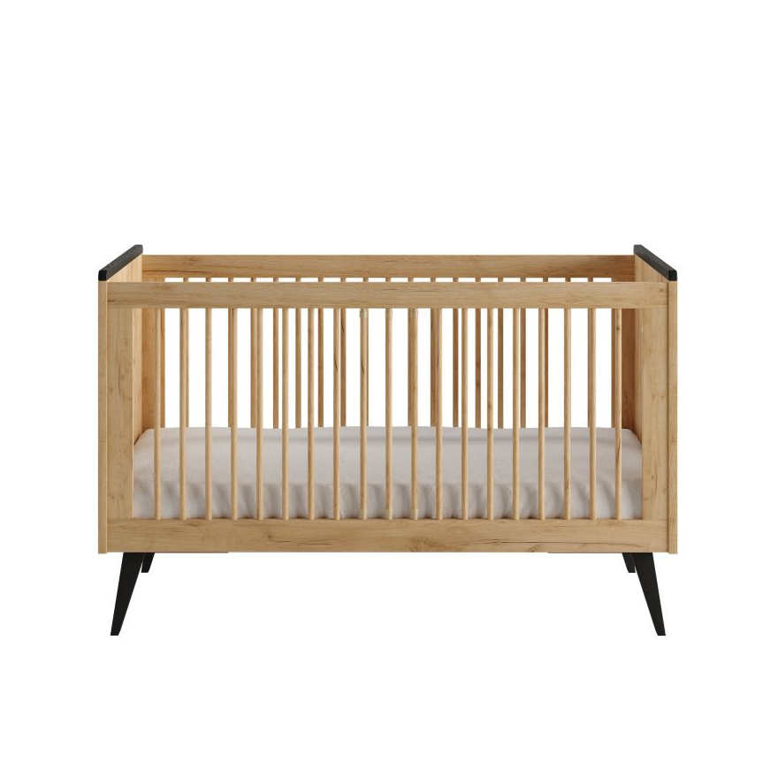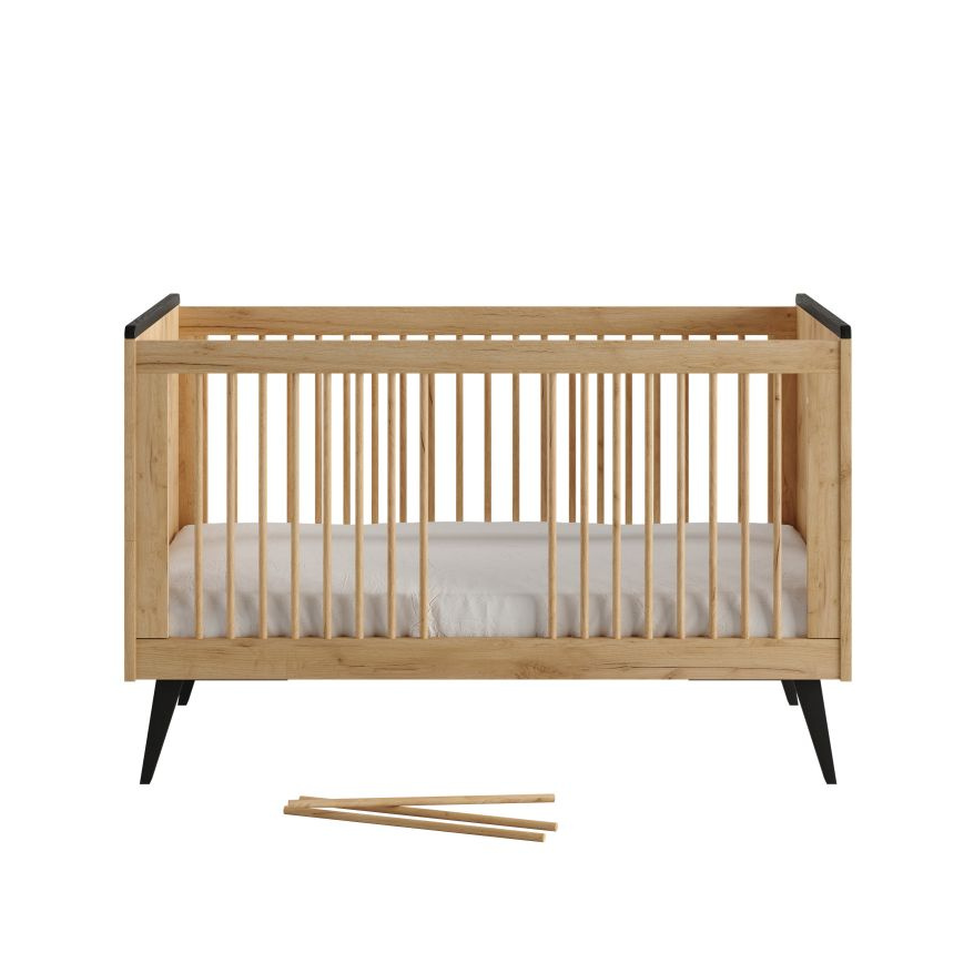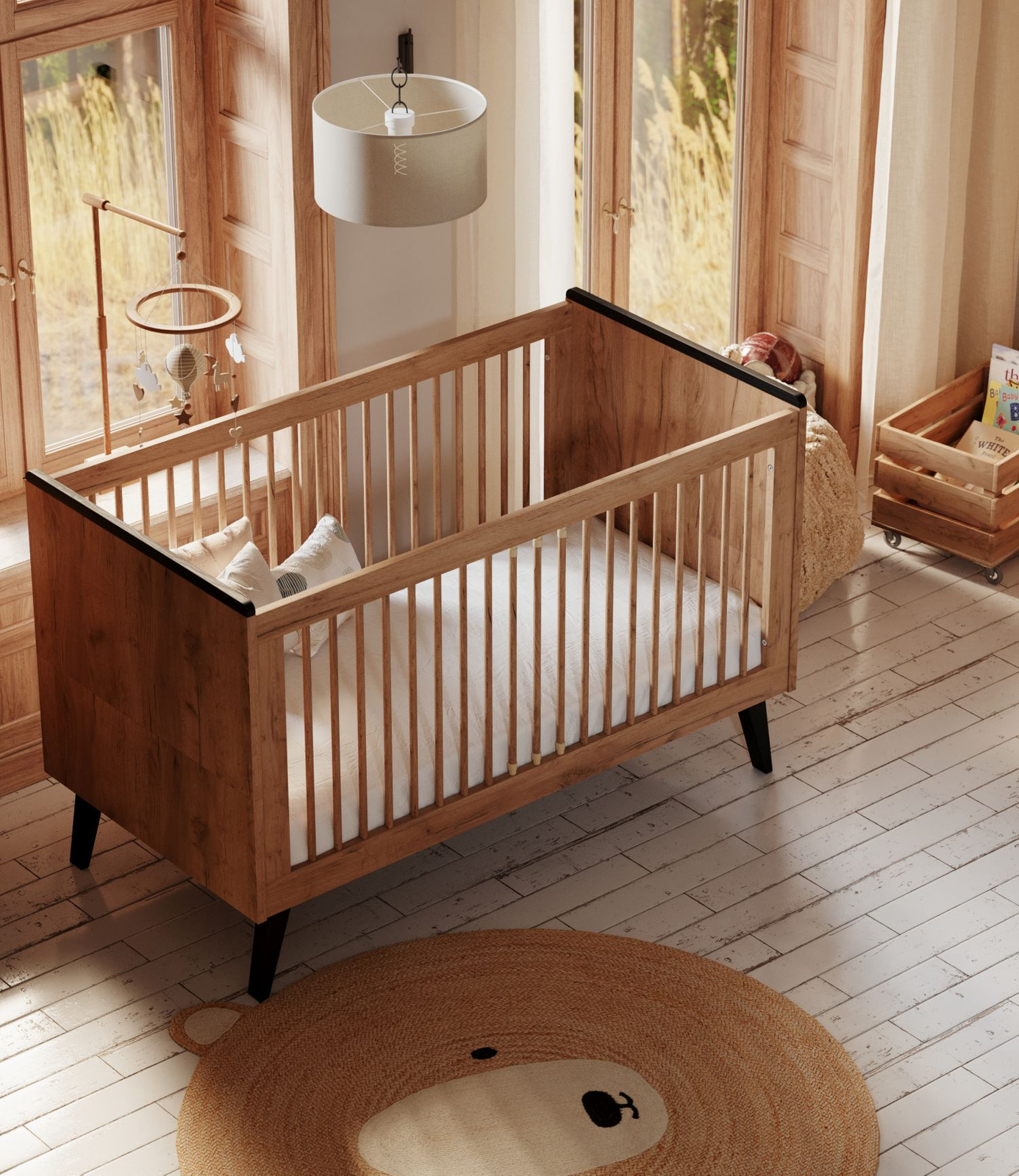 Łóżeczko Retro łączy naturalne materiały, ciepły odcień dębu i subtelne detale w stylu vintage. Dzięki prostym liniom i ponadczasowemu wzornictwu doskonale wkomponuje się w każdy dziecięcy pokój, tworząc przytulne i eleganckie wnętrze.
