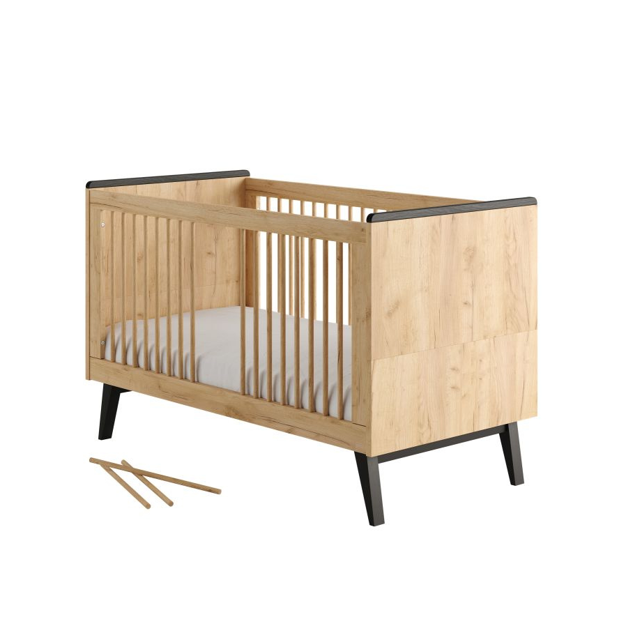 Łóżeczko z kolekcji Retro 140×70 cm to połączenie klasycznego stylu i nowoczesnej funkcjonalności. Dzięki możliwości przekształcenia w tapczanik, mebel rośnie razem z dzieckiem, zapewniając komfort i bezpieczeństwo zarówno w pierwszych miesiącach życia, jak i w wieku przedszkolnym. Naturalne materiały, ciepły odcień dębu oraz delikatne, bukowe detale tworzą przytulną i harmonijną aranżację wnętrza.