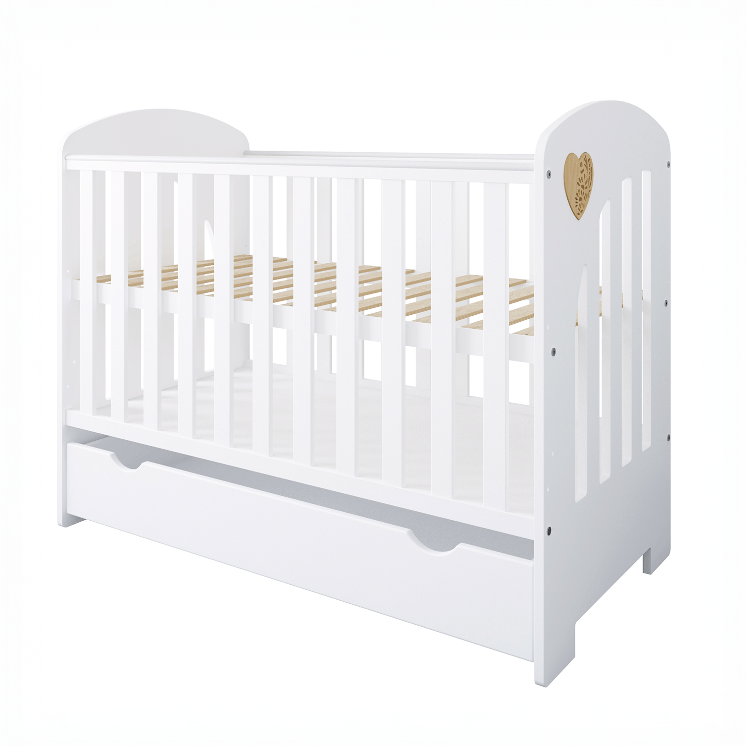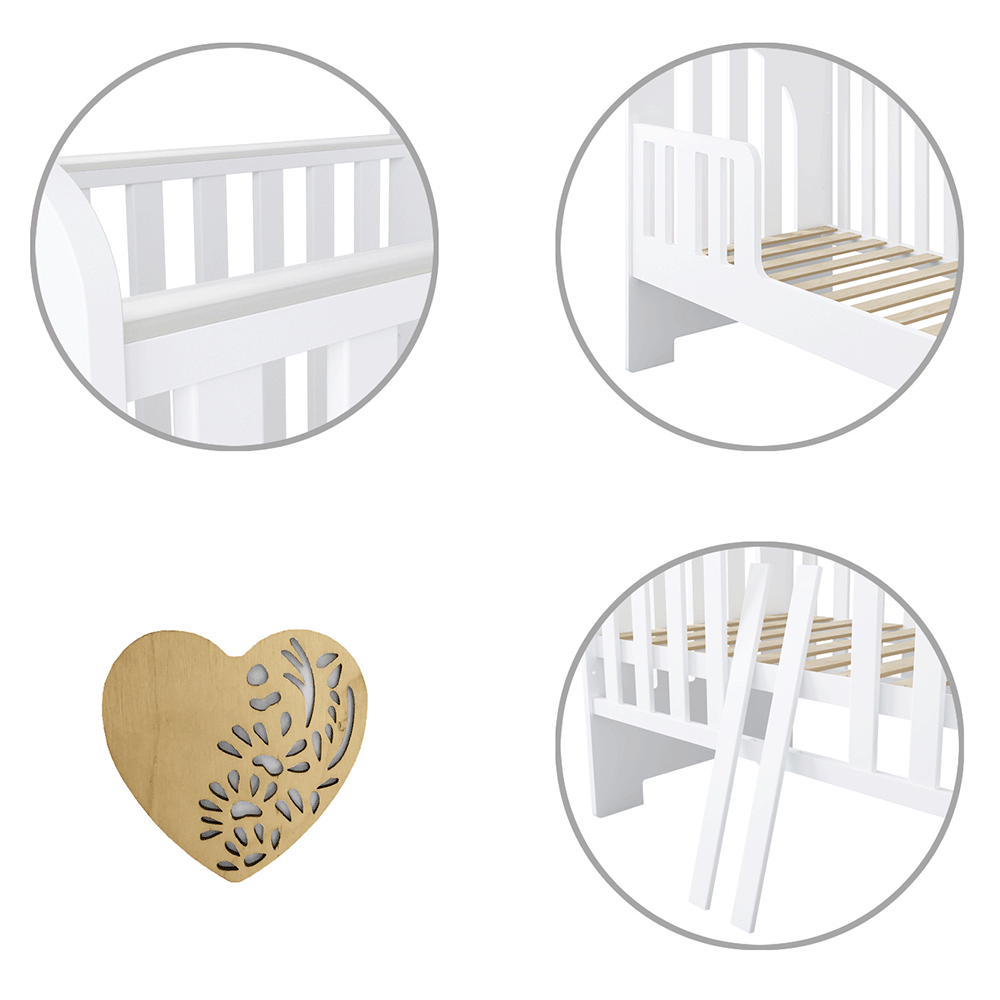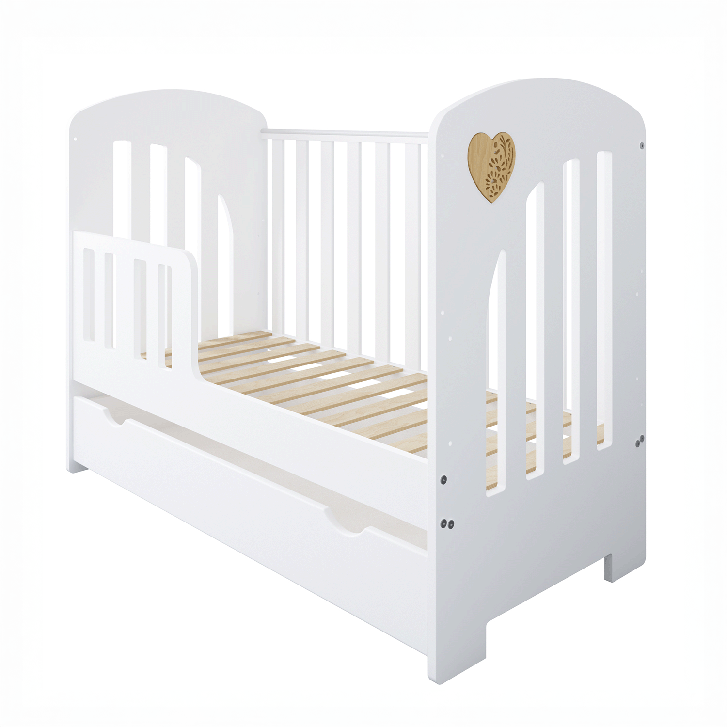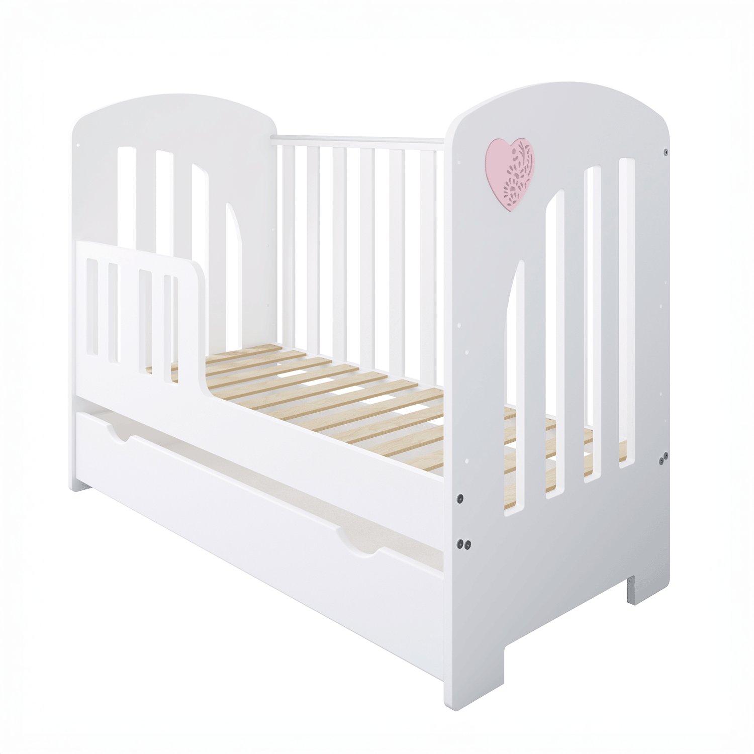 Łóżeczko dziecięce LOVE 120x60 z szufladą, barierką i funkcją tapczanika – białe z dekoracyjnym serduszkiem