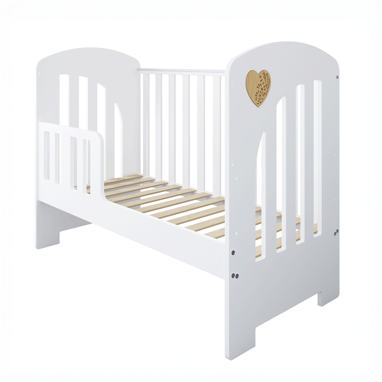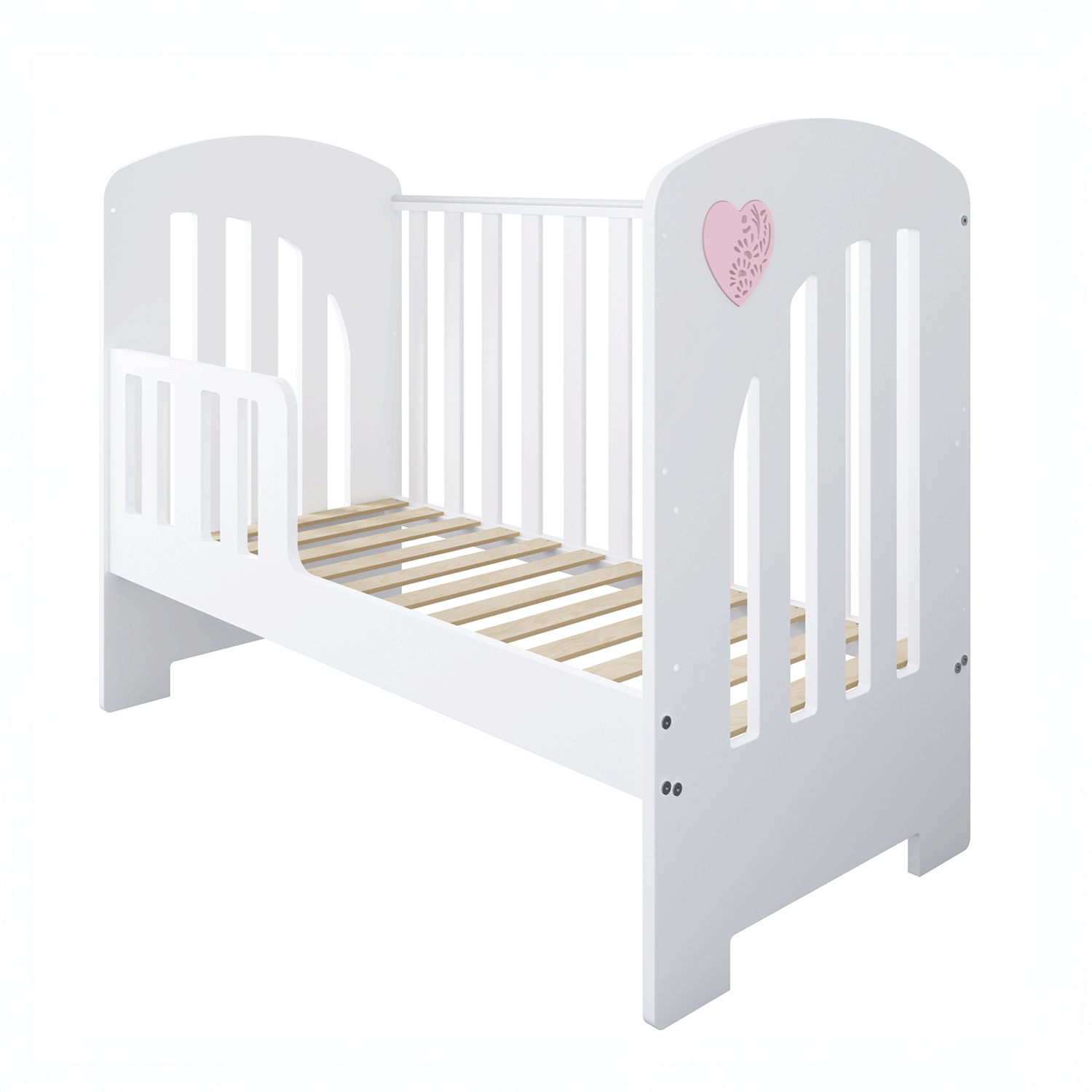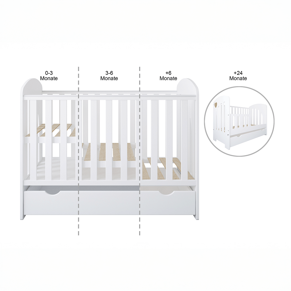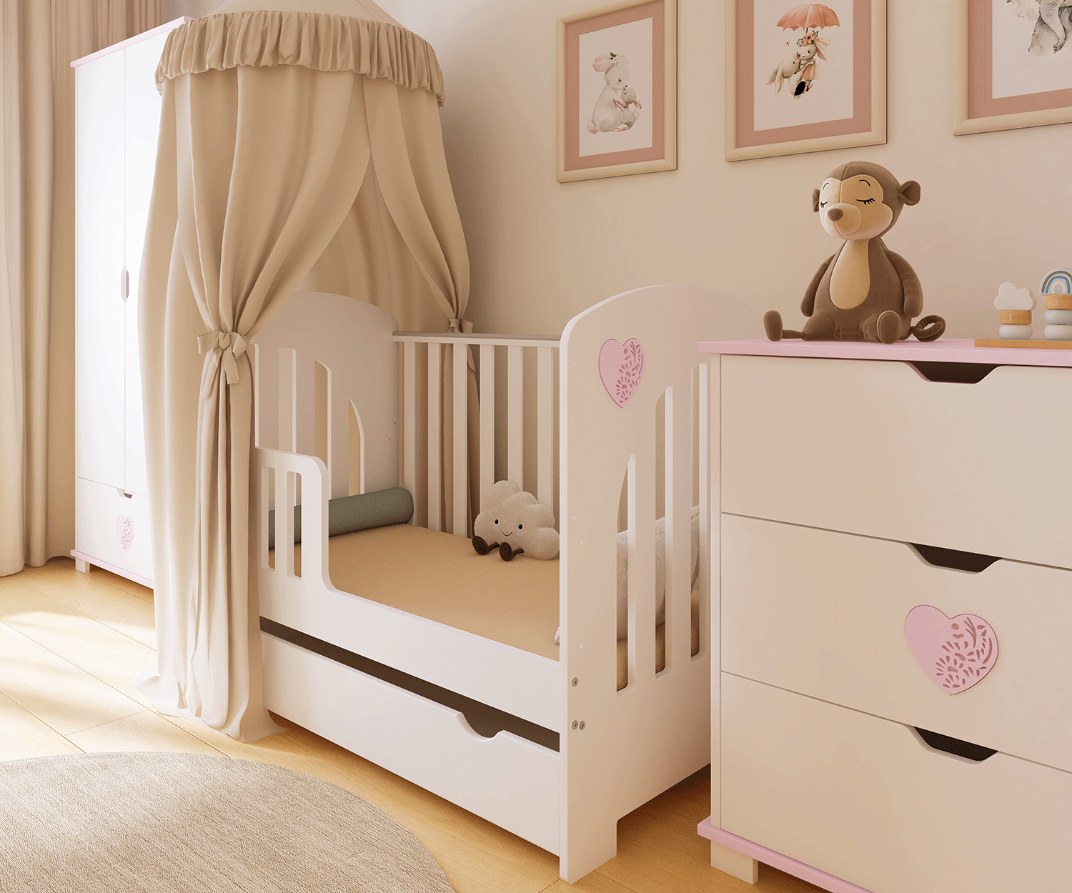 Łóżeczko dziecięce LOVE 120x60 z szufladą, barierką i funkcją tapczanika – białe z dekoracyjnym serduszkiem