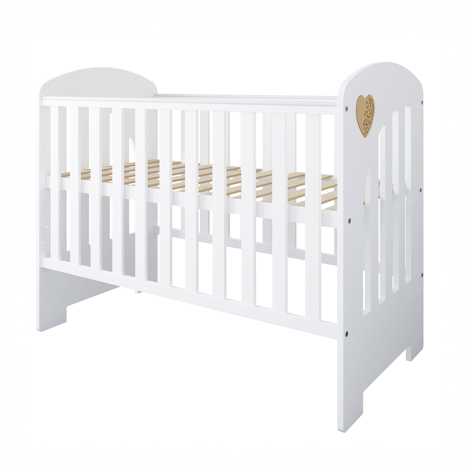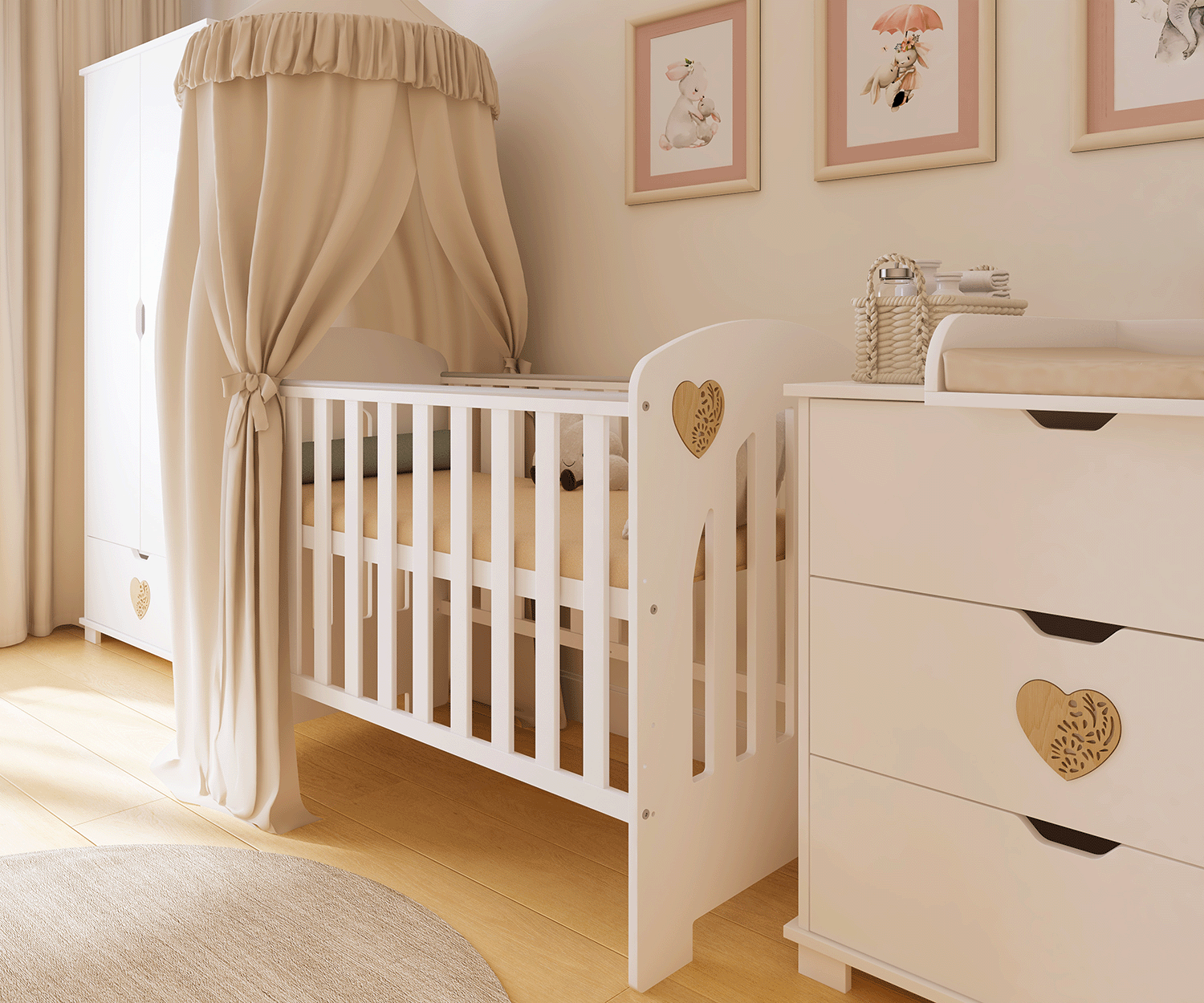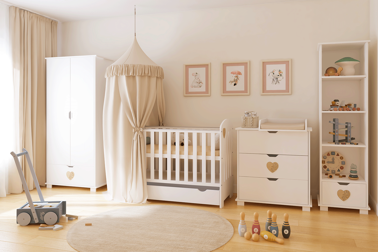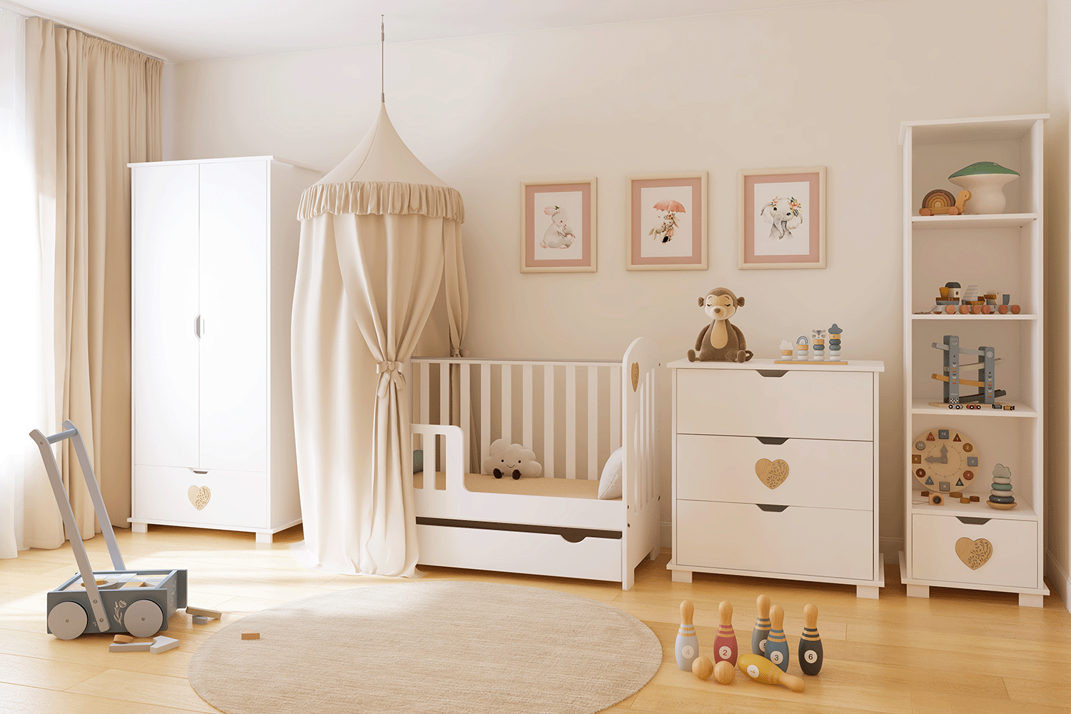 Łóżeczko dziecięce LOVE 120x60 z szufladą, barierką i funkcją tapczanika – białe z dekoracyjnym serduszkiem