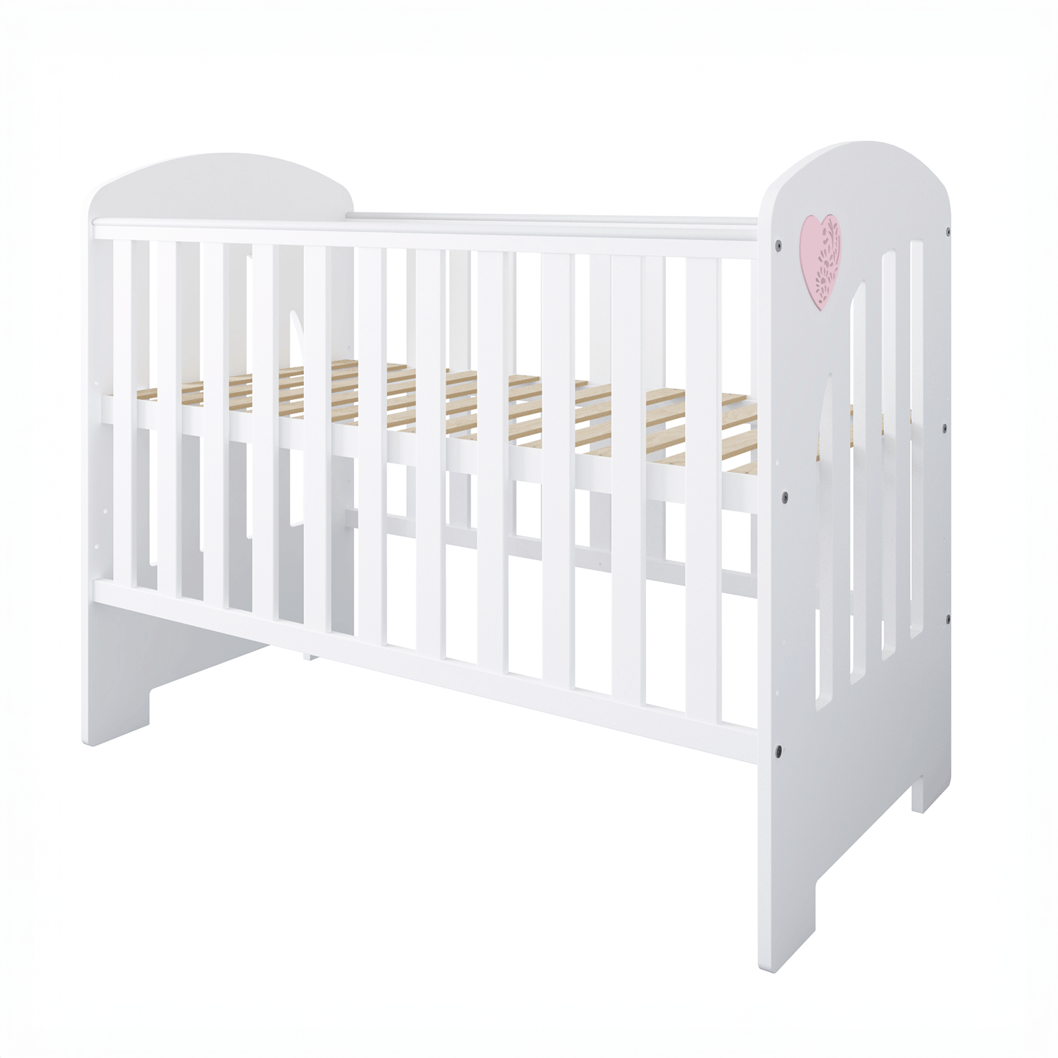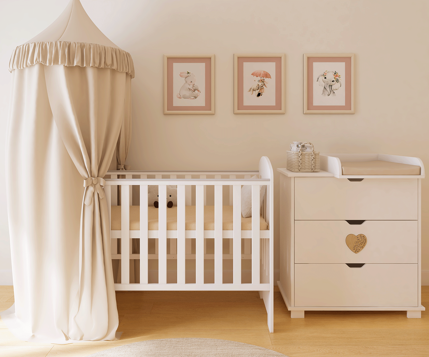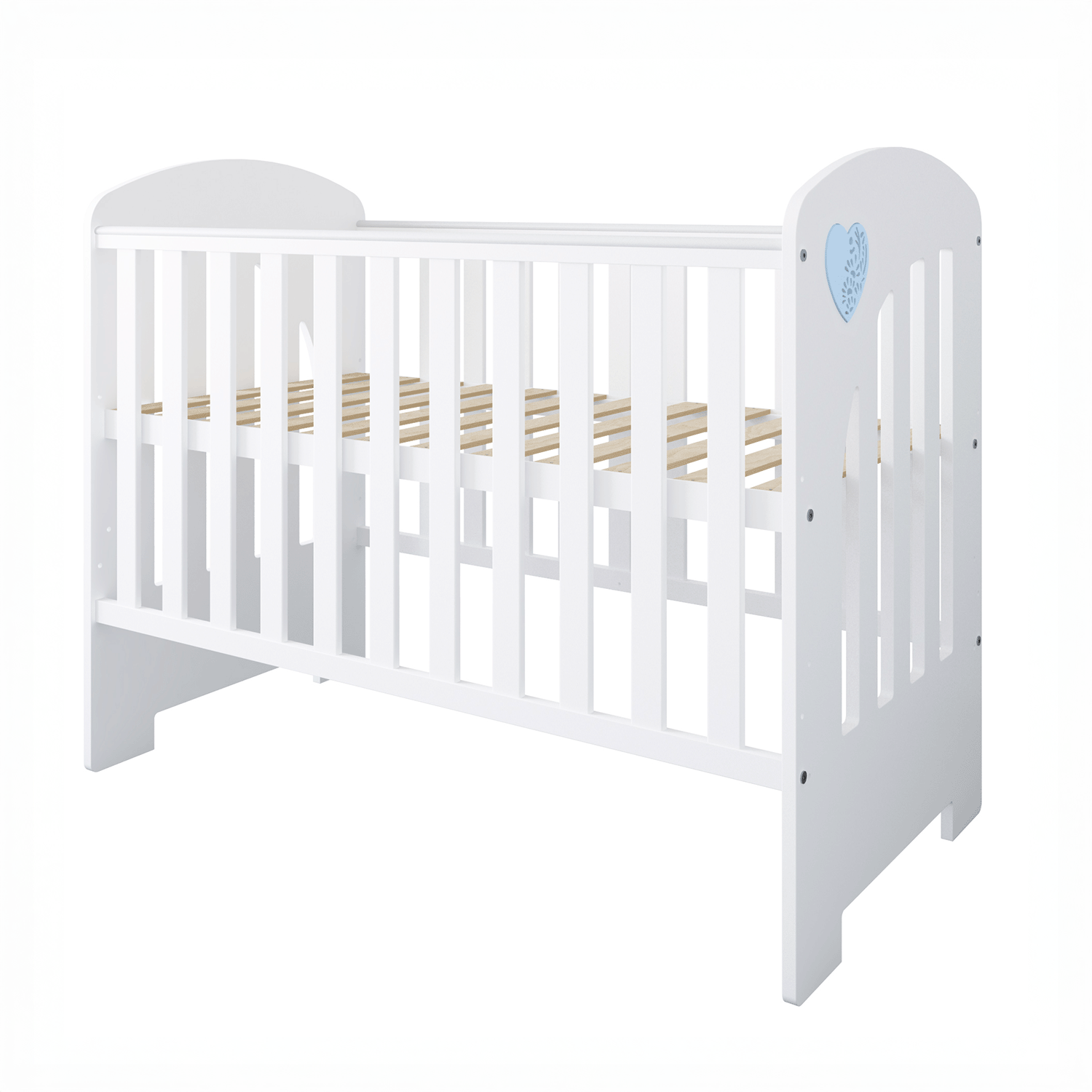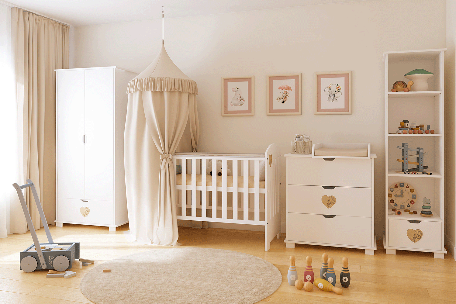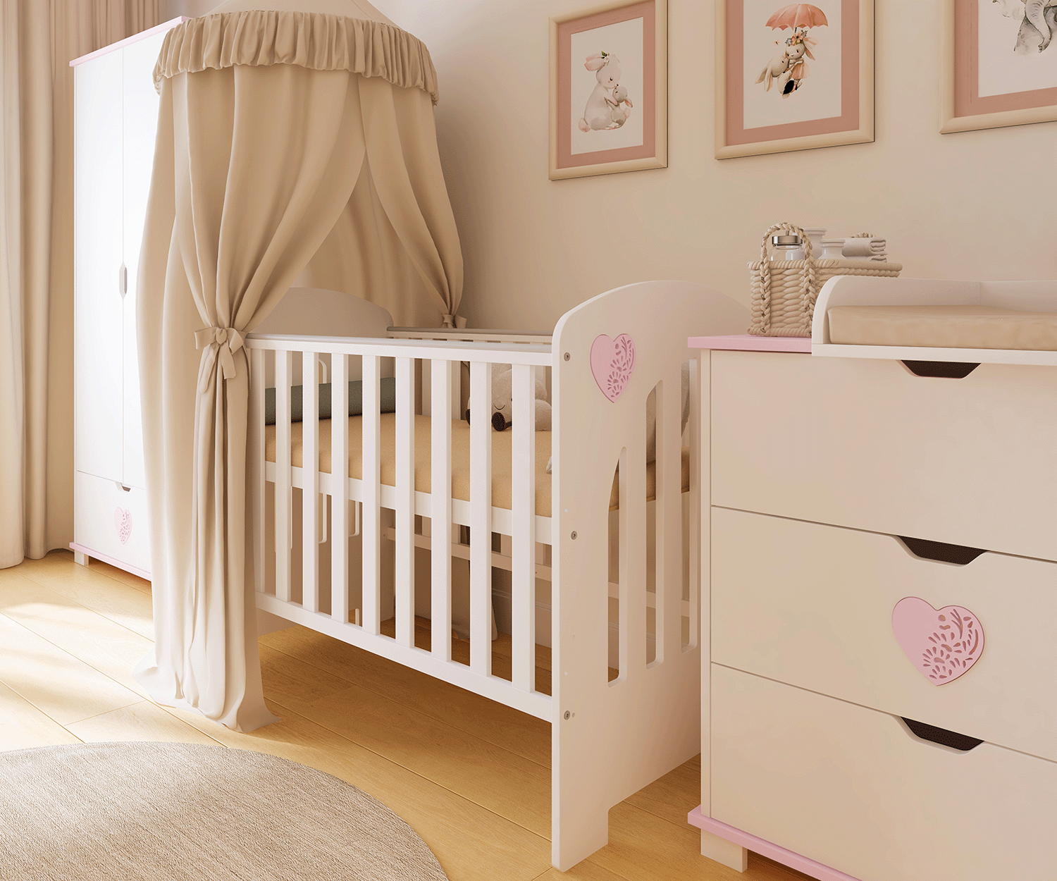 Łóżeczko dziecięce LOVE 120x60 to funkcjonalny i bezpieczny mebel zaprojektowany z myślą o niemowlętach. Solidna konstrukcja, trzy poziomy regulacji leżyska i otwarta, szczebelkowa forma zapewniają dziecku wygodę, bezpieczeństwo oraz odpowiednią cyrkulację powietrza.