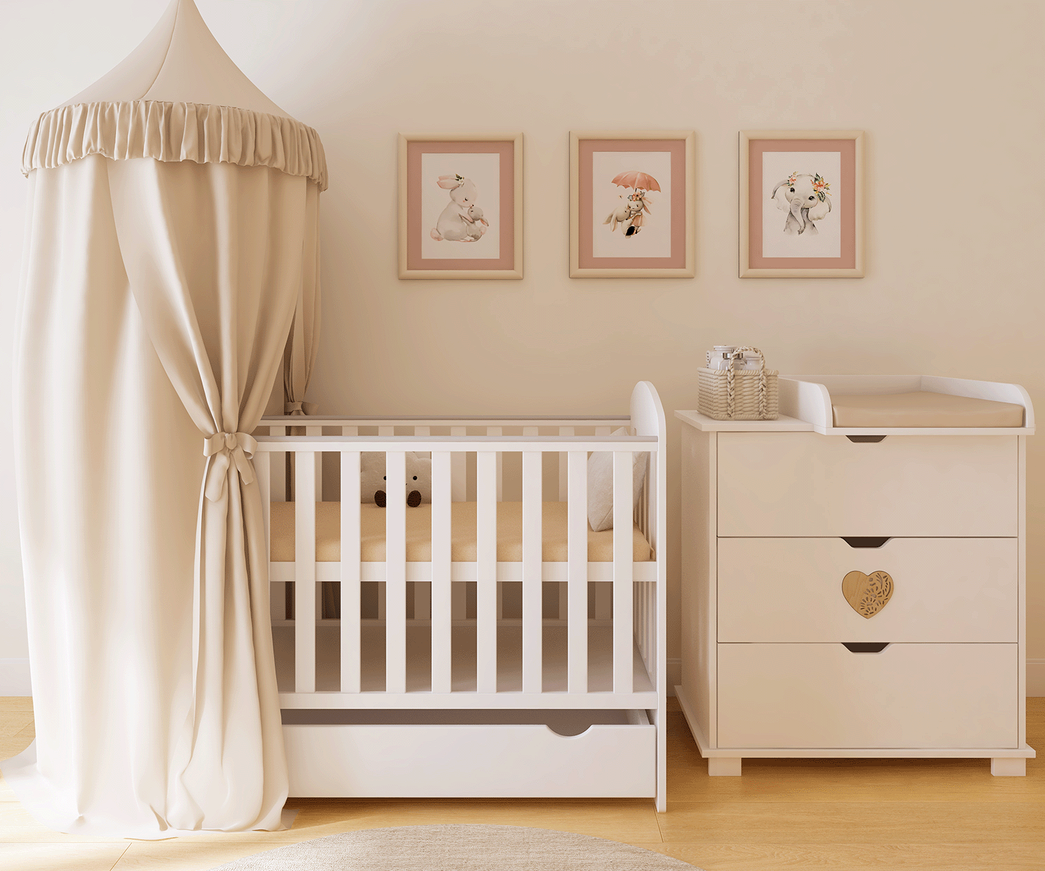 Model LOVE łączy nowoczesny design z praktycznymi rozwiązaniami – dwoma wyciąganymi szczebelkami, ochronnym gryzakiem oraz opcjonalną szufladą na prowadnicach kulkowych. Dzięki temu łóżeczko „rośnie” razem z dzieckiem i może pełnić funkcję tapczanika w kolejnych latach.