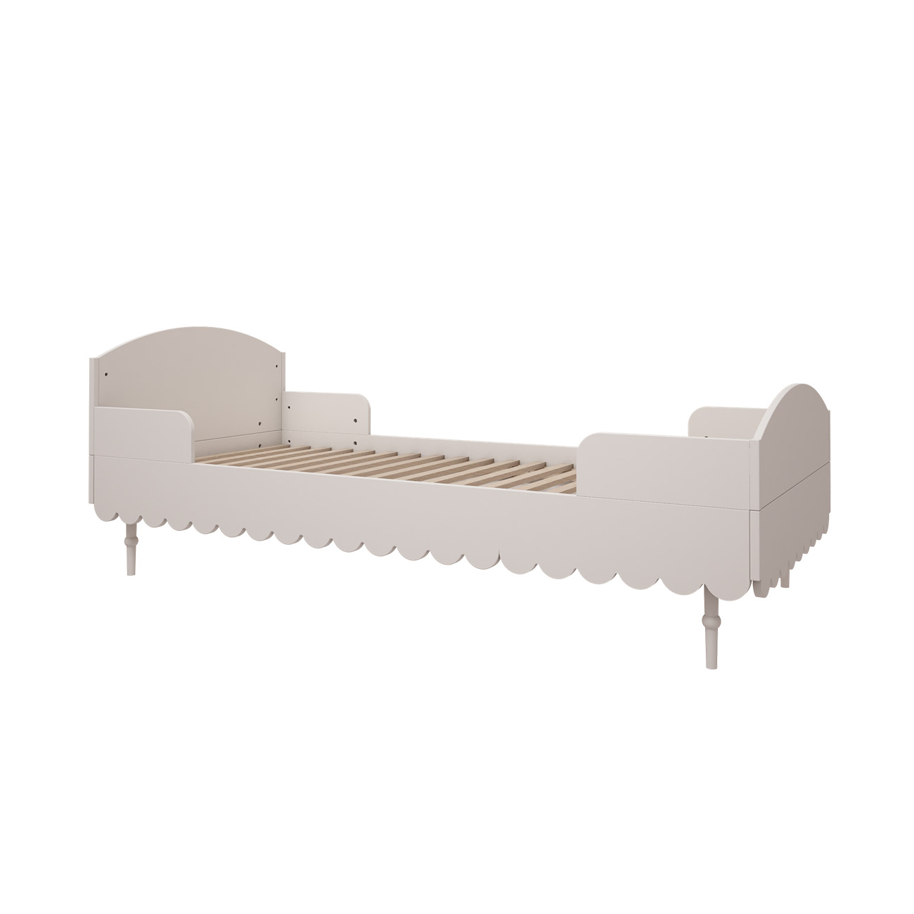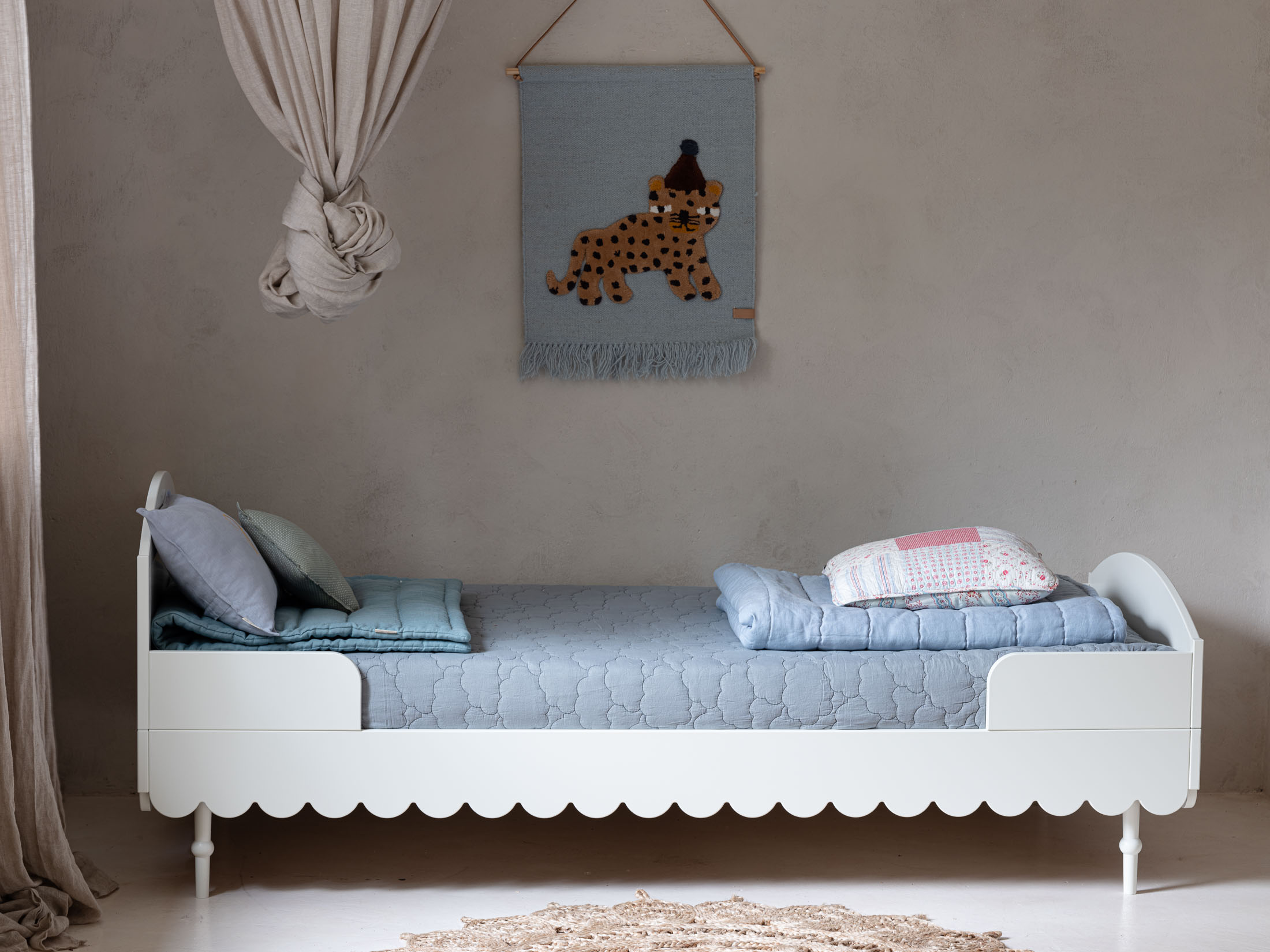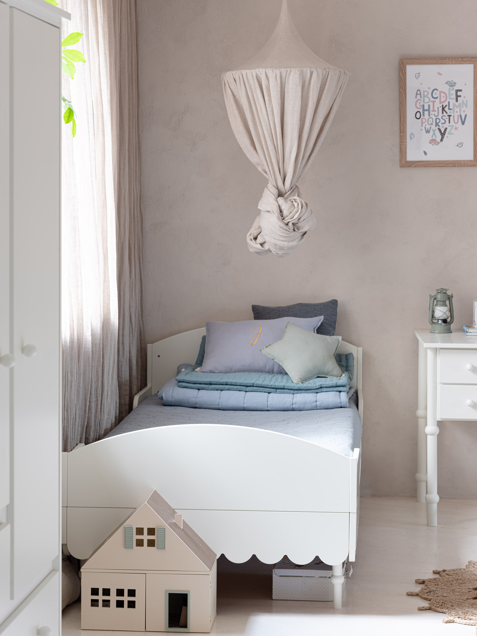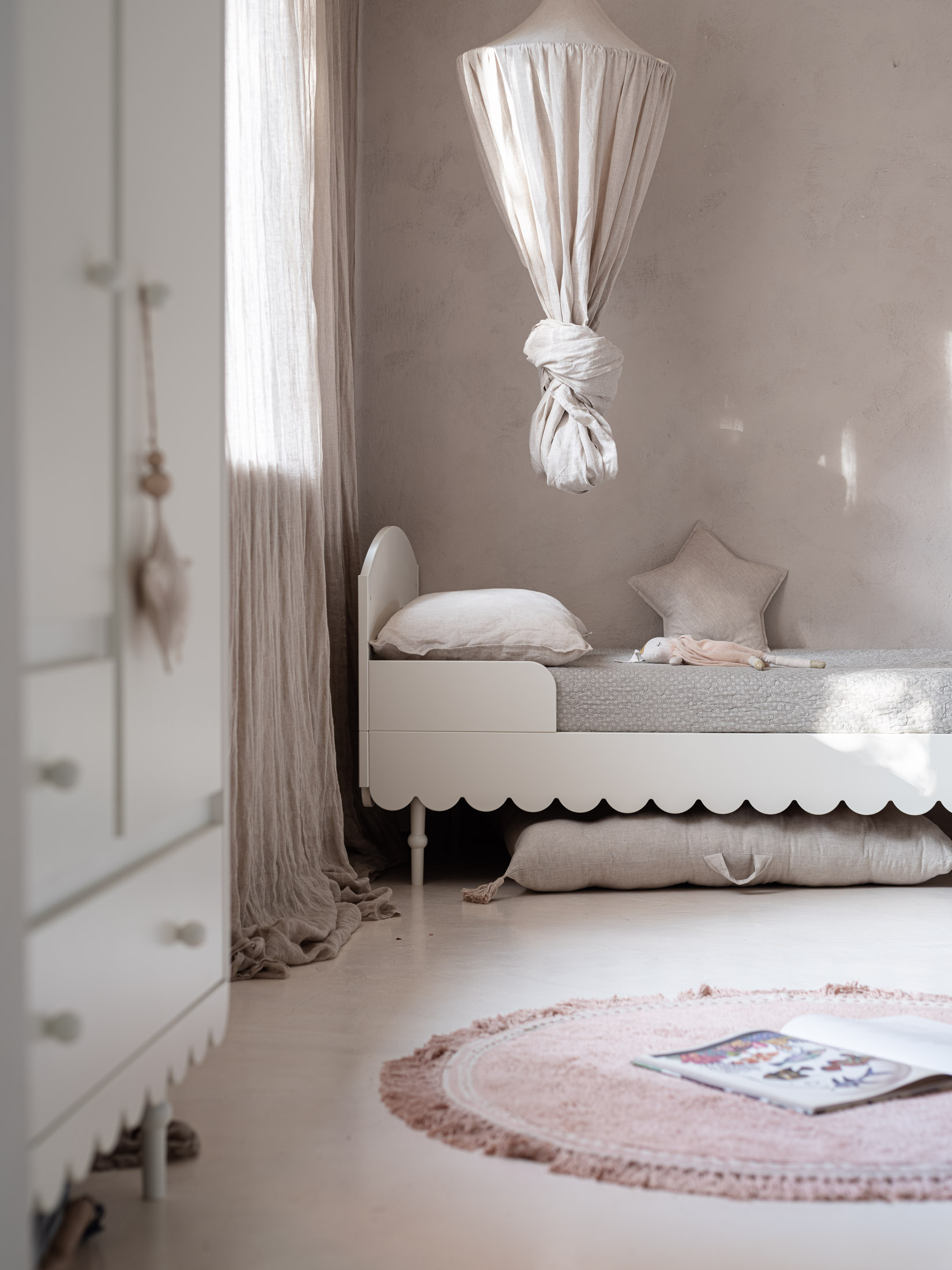 Łóżko 90 × 200 Babushka to komfortowe i estetyczne łóżko dziecięce, które łączy funkcjonalność codziennego użytkowania z charakterystycznym, dekoracyjnym stylem kolekcji Babushka. Subtelna falbanka wokół ramy nadaje mu lekko vintage’owy, boho charakter i sprawia, że łóżko staje się nie tylko miejscem snu, ale również ważnym elementem aranżacji pokoju.