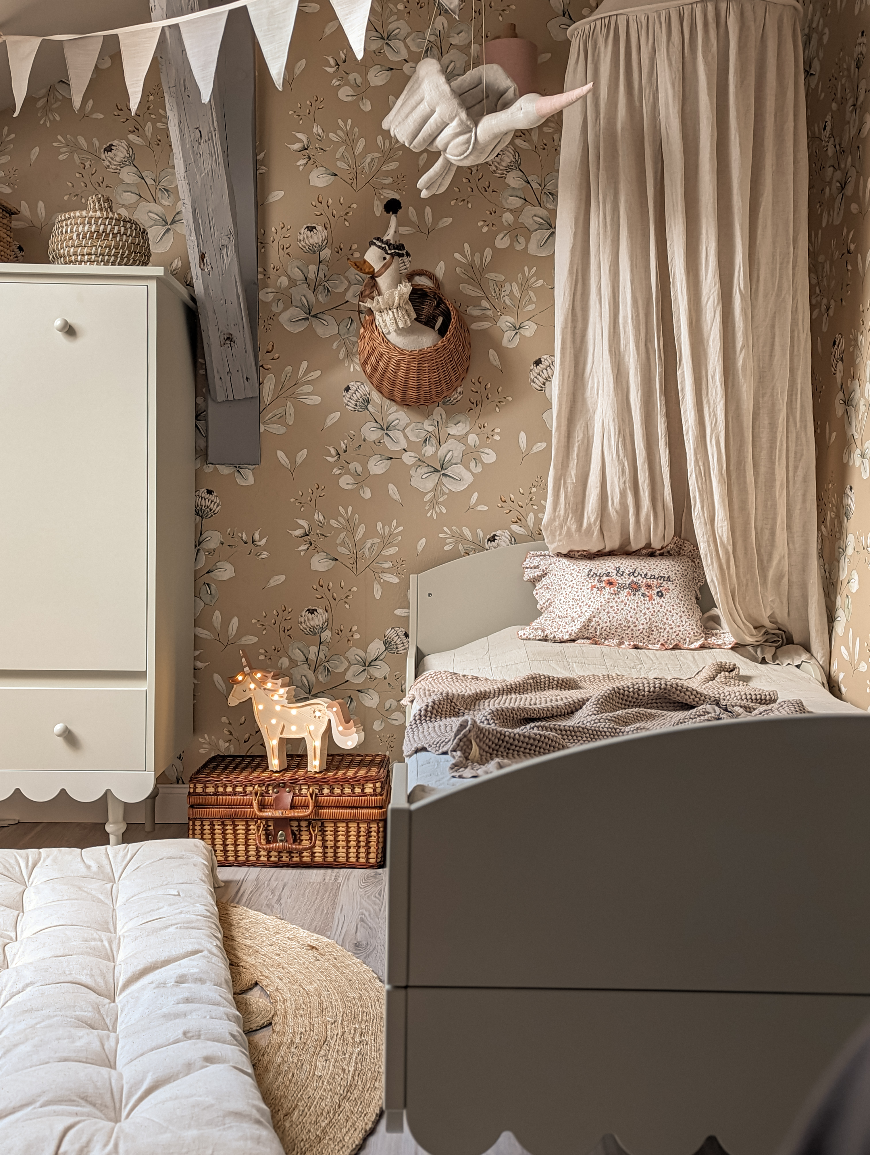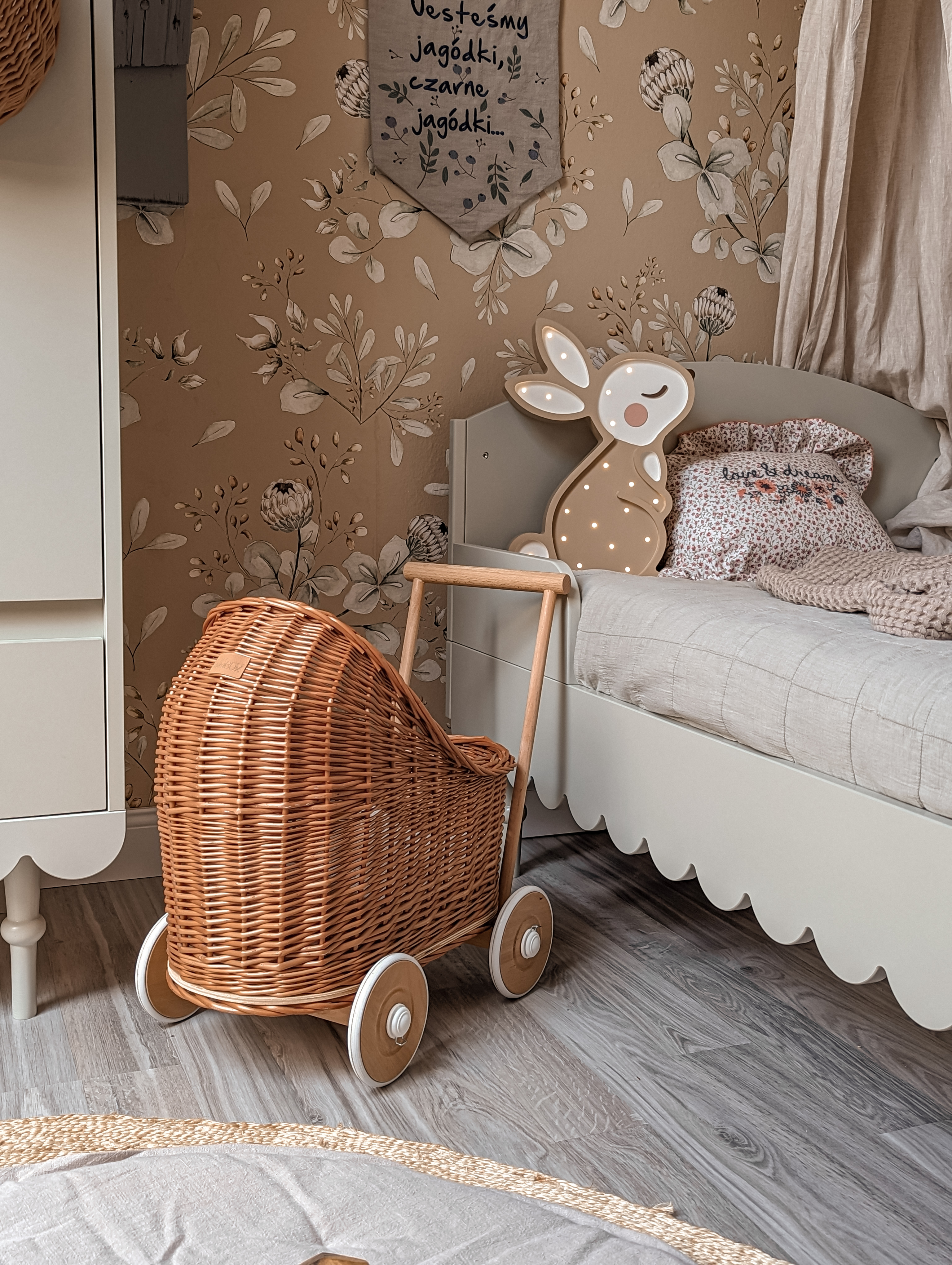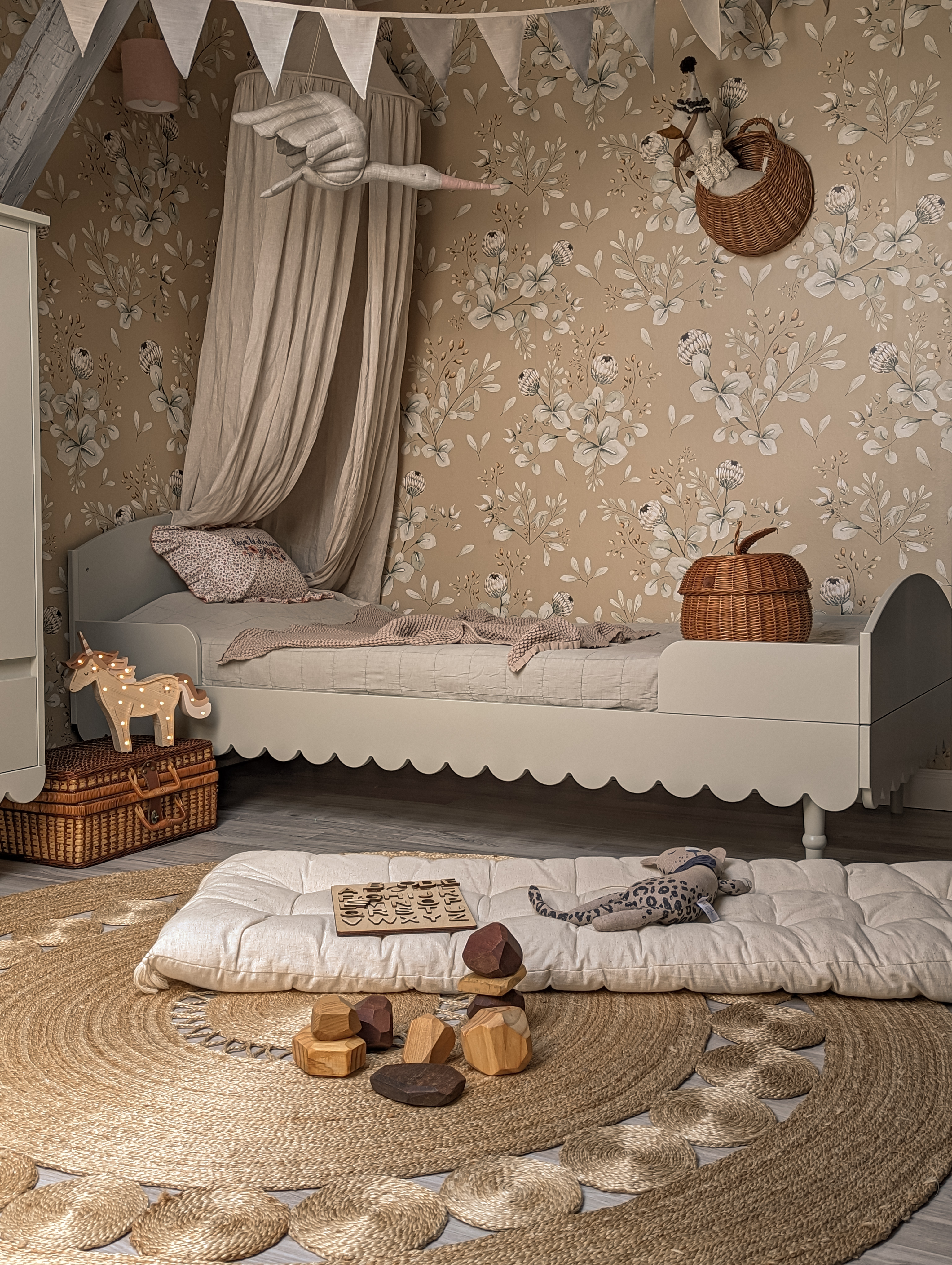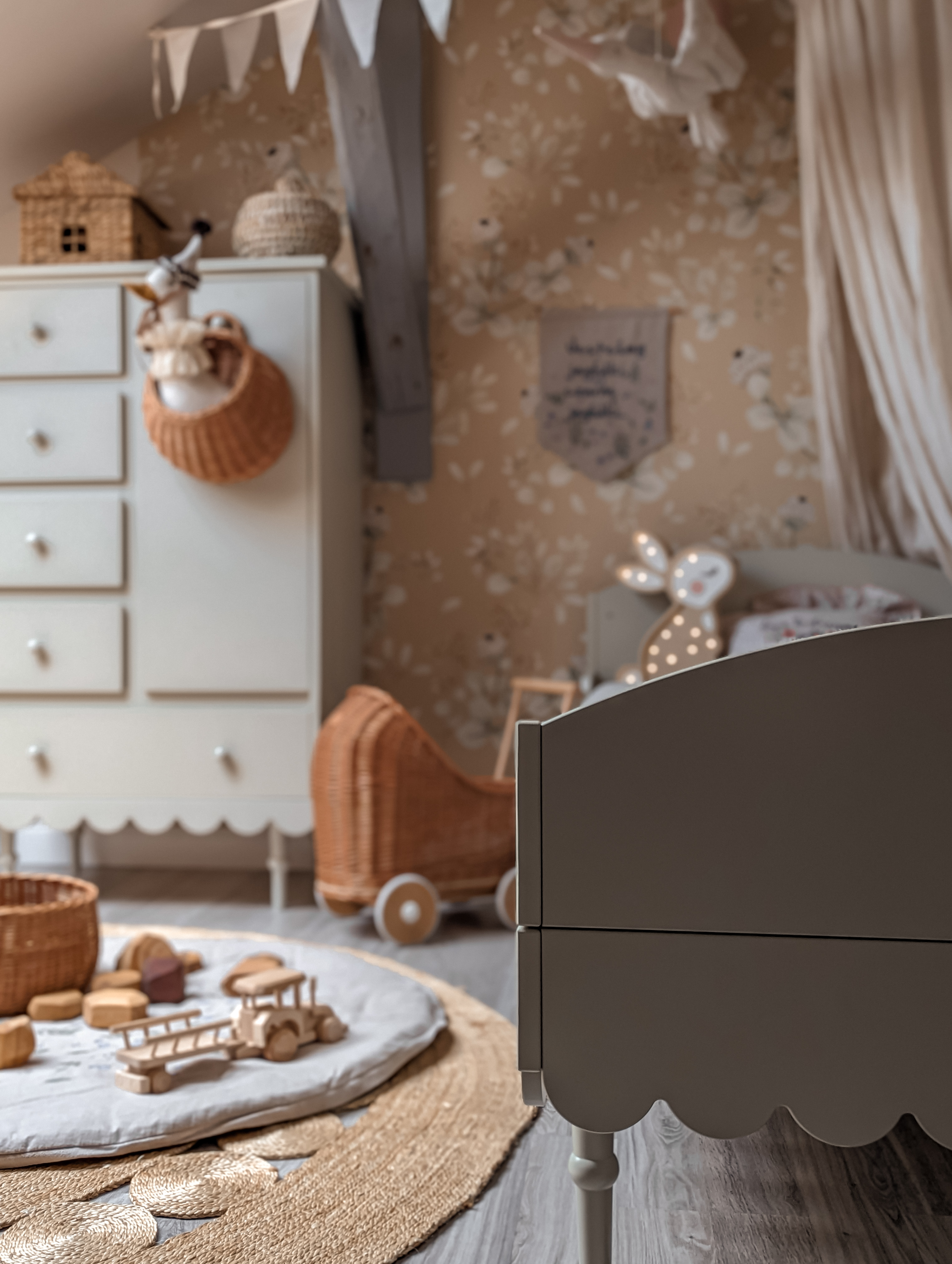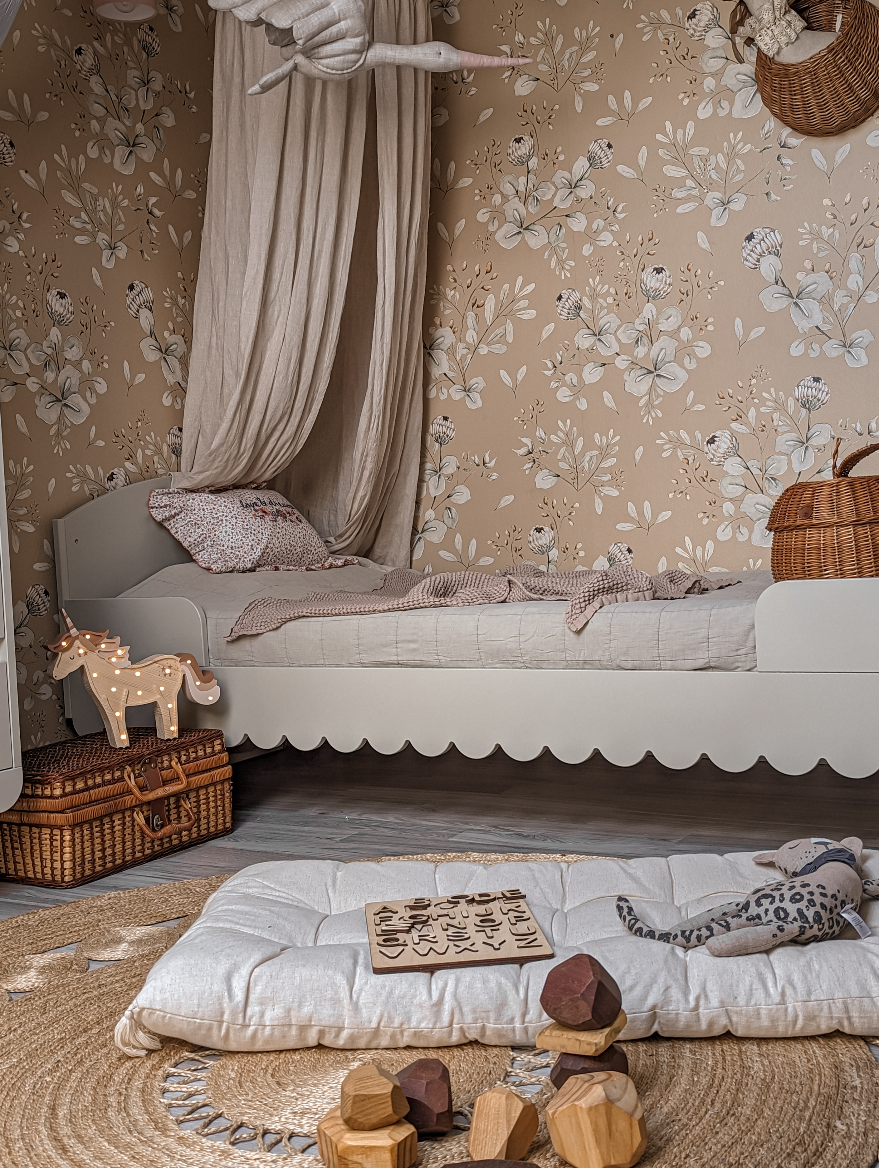 Łóżko 90 × 200 Babushka to komfortowe i estetyczne łóżko dziecięce, które łączy funkcjonalność codziennego użytkowania z charakterystycznym, dekoracyjnym stylem kolekcji Babushka. Subtelna falbanka wokół ramy nadaje mu lekko vintage’owy, boho charakter i sprawia, że łóżko staje się nie tylko miejscem snu, ale również ważnym elementem aranżacji pokoju.