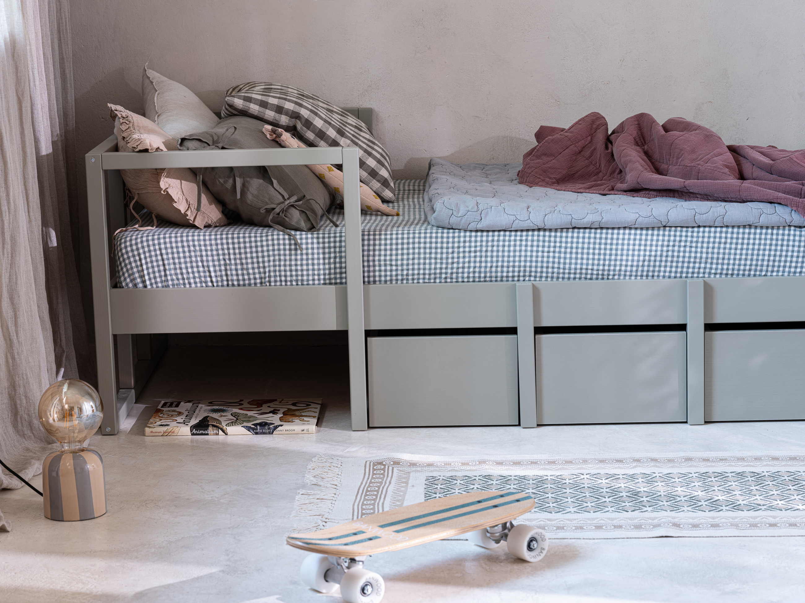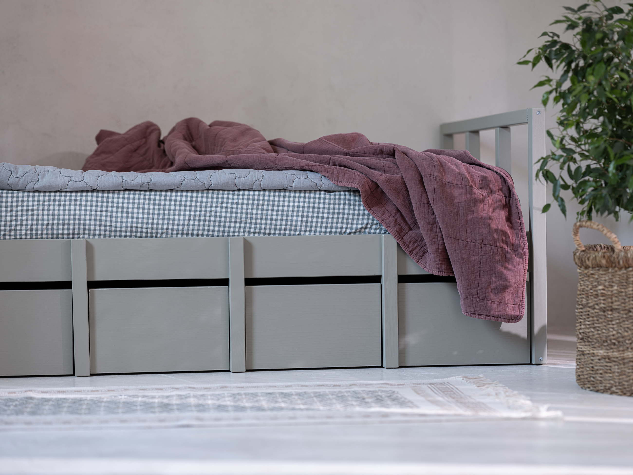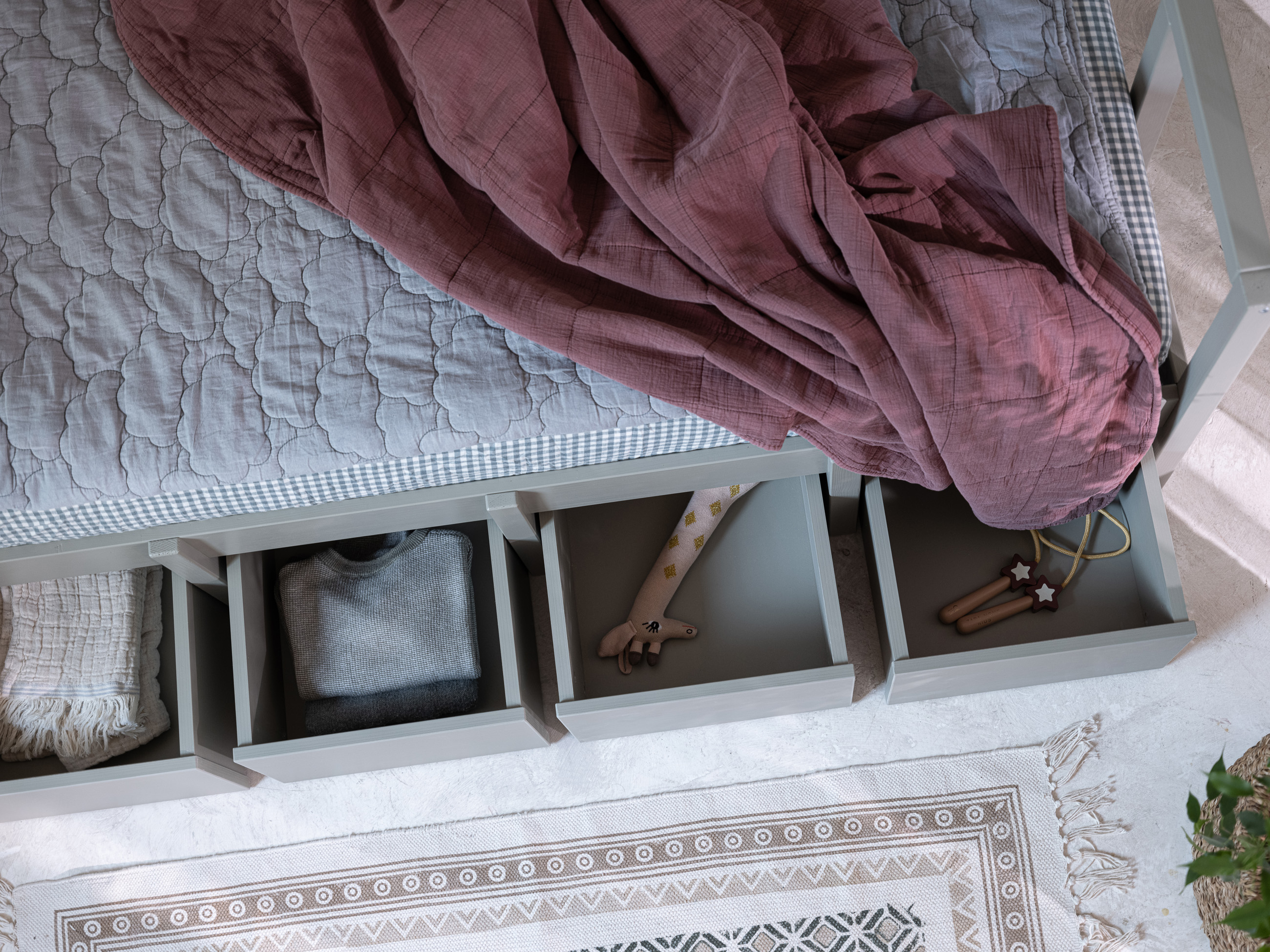 Możliwość dokupienia od 1 do 4 szuflad — dodatkowe miejsce na pościel, ubrania lub zabawki (szuflady nie są wliczone w cenę łóżka).
