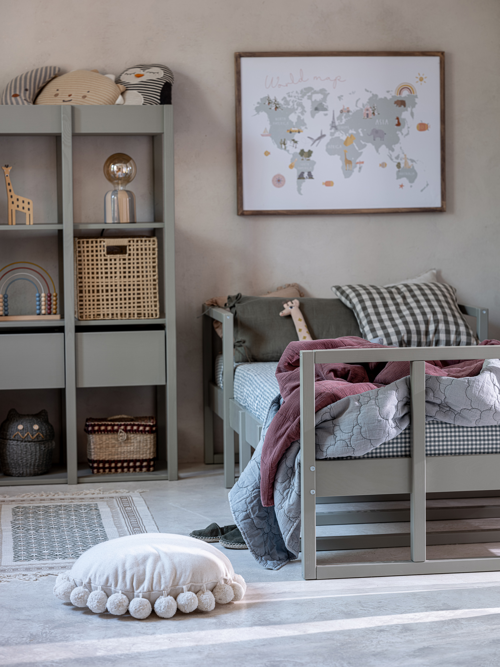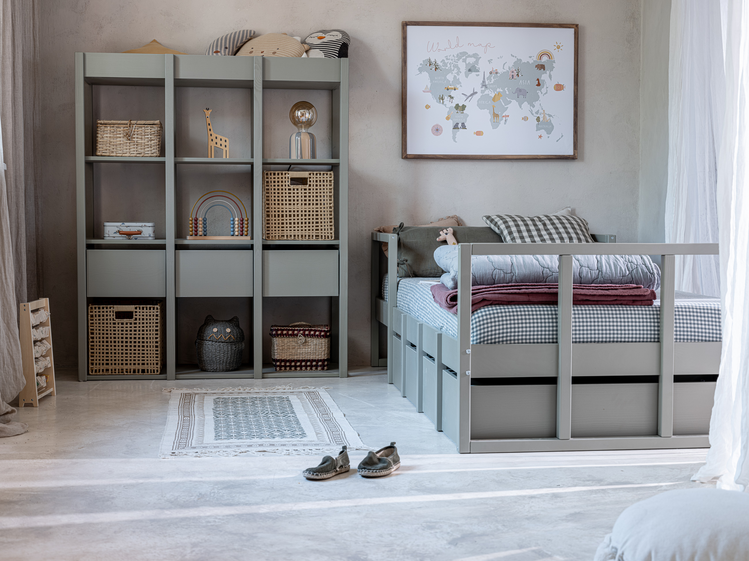 Zgaszony niebieski — nowoczesny i wyrazisty akcent do pokoju dziecka.