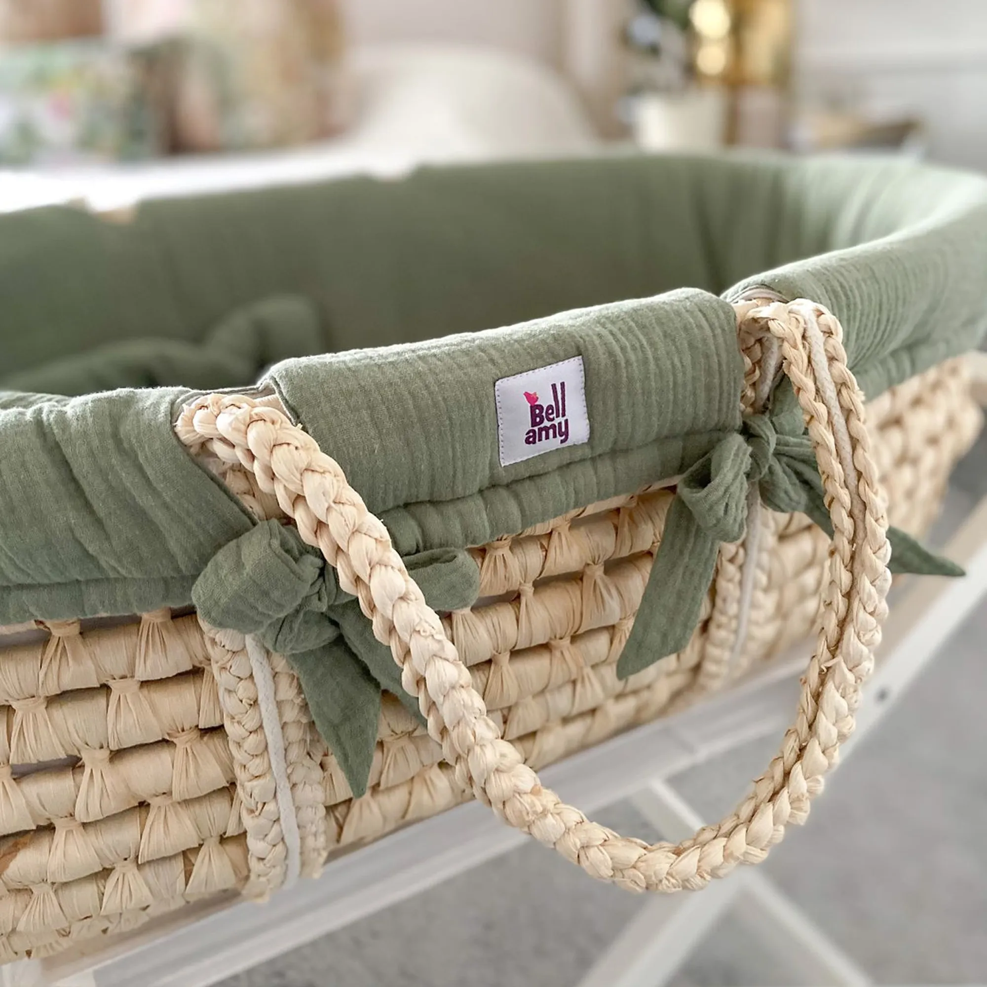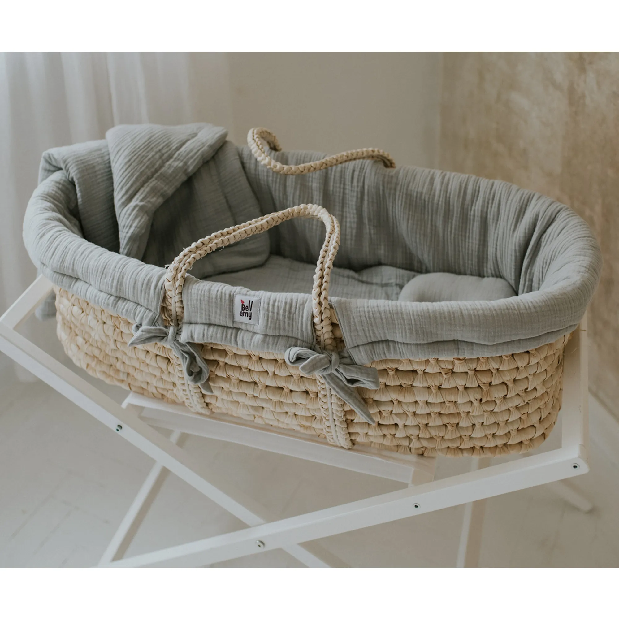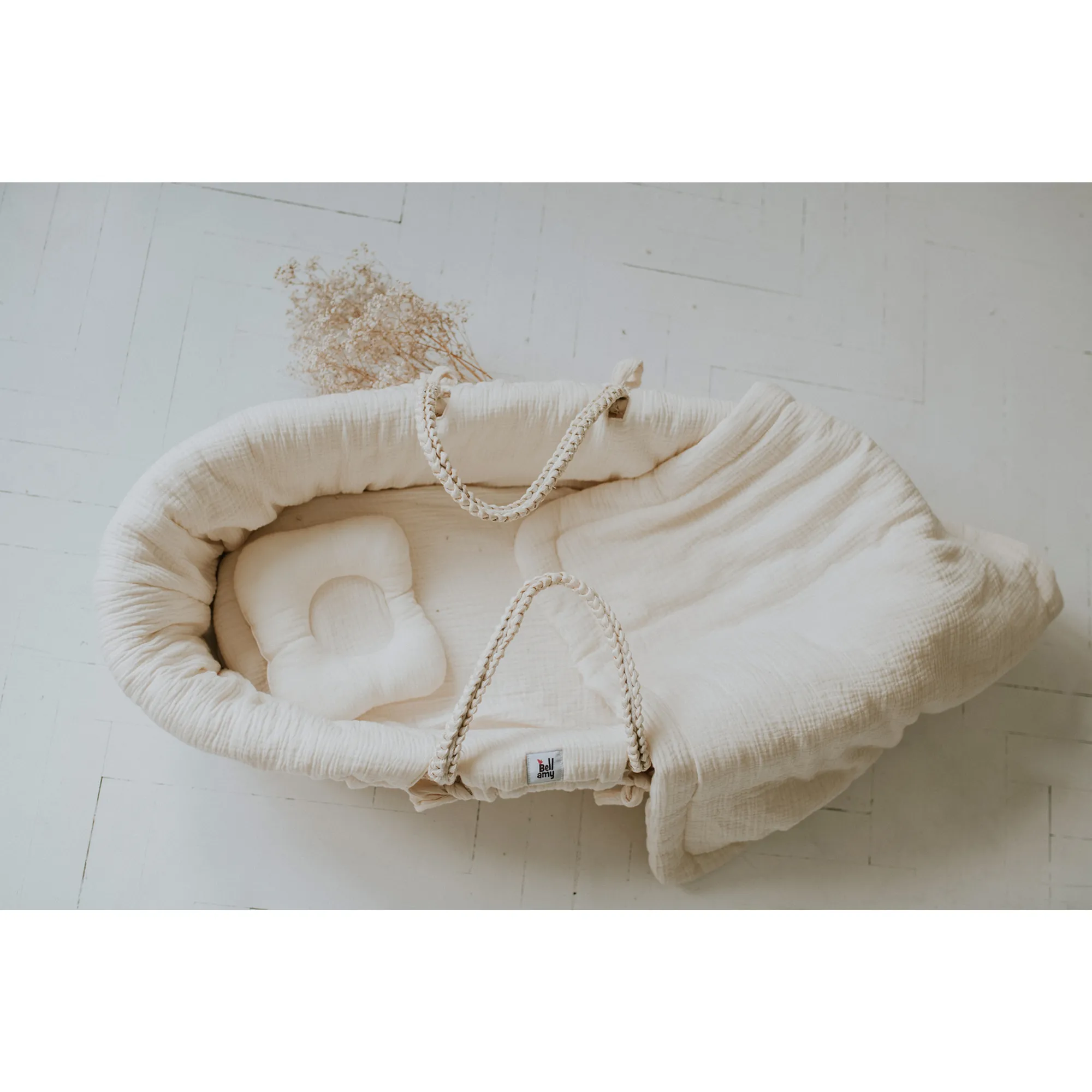 - Kompleksowe tekstylia muślinowe (wyściółka, prześcieradło, kołderka, poduszka z wgłębieniem na główkę – dostępne za dodatkową opłatą)