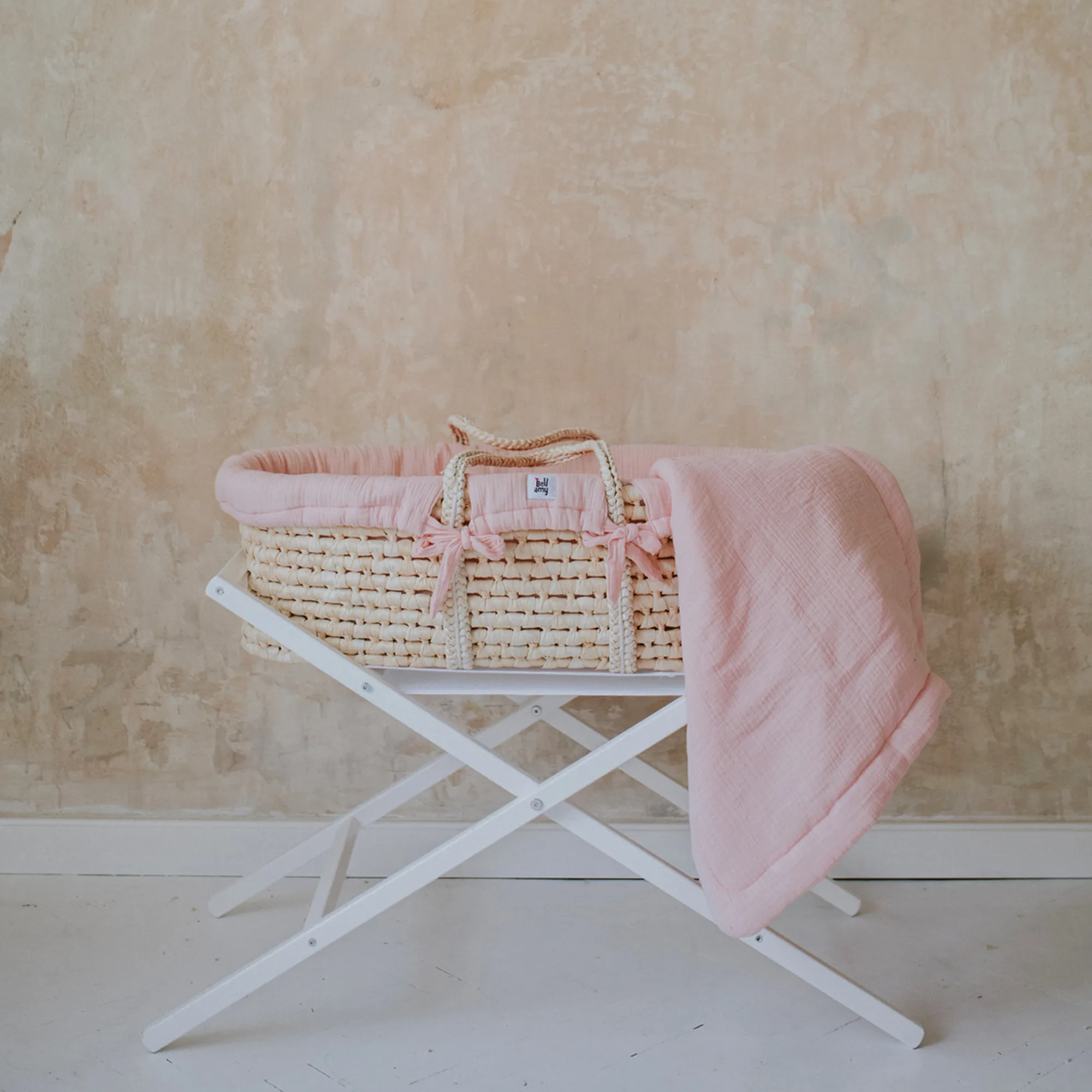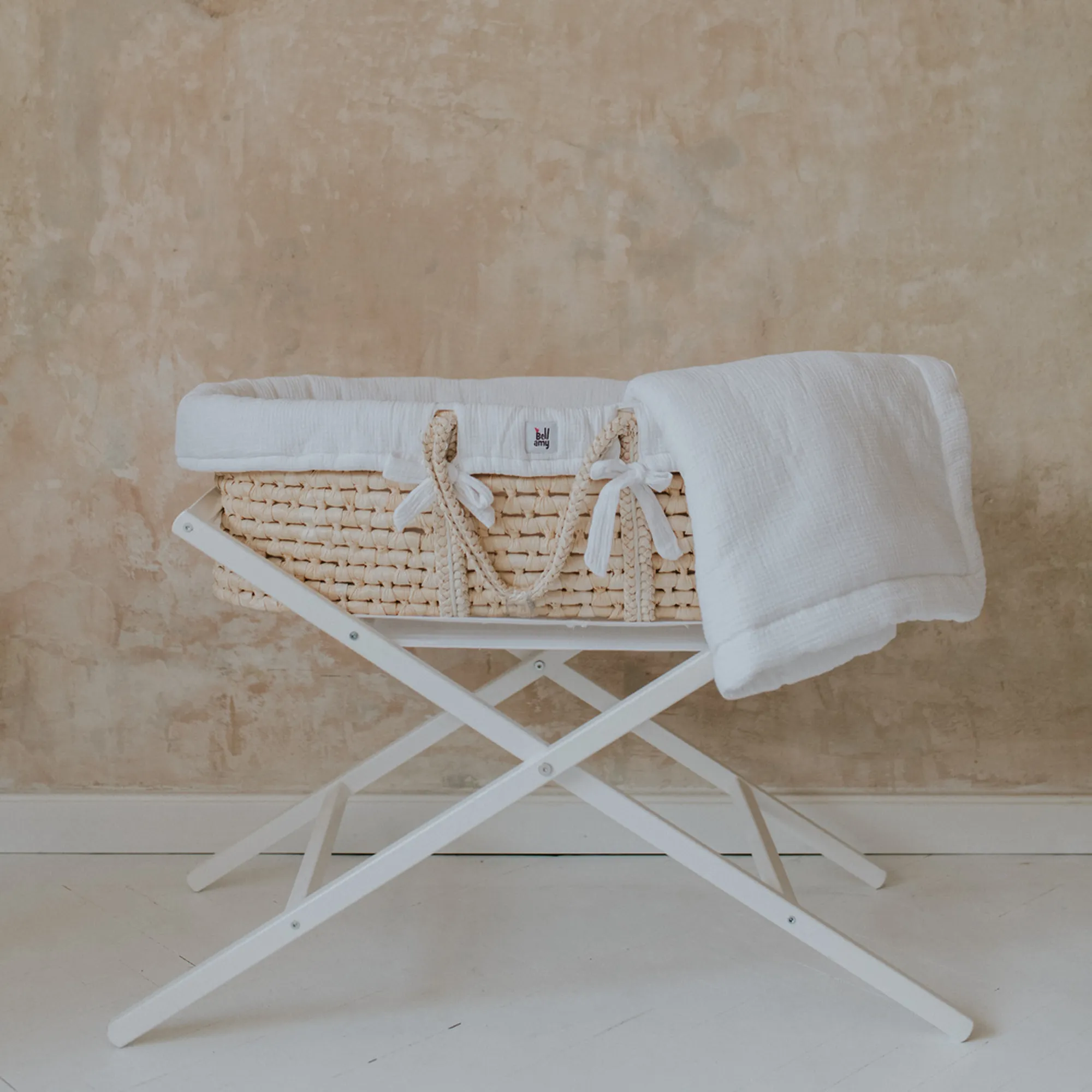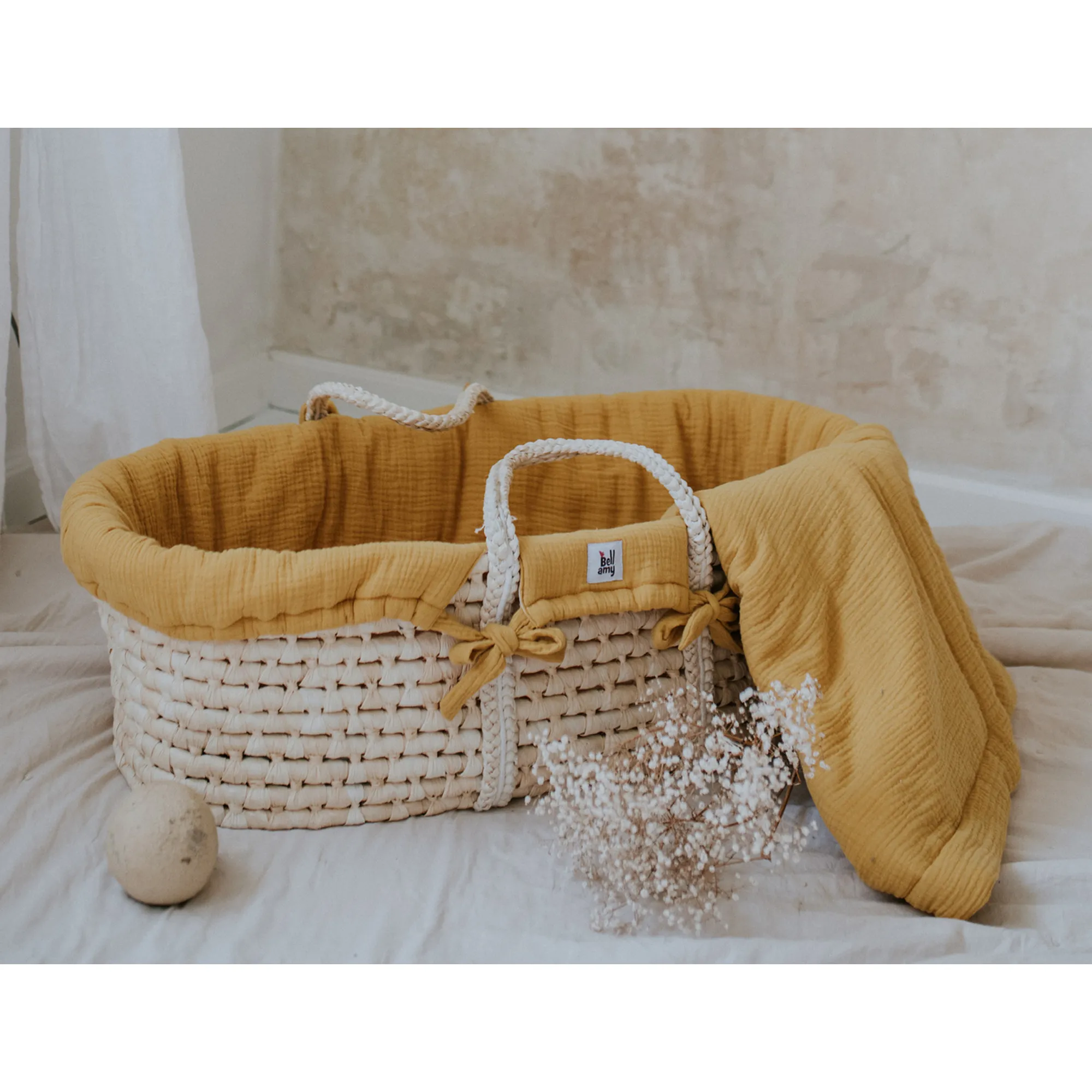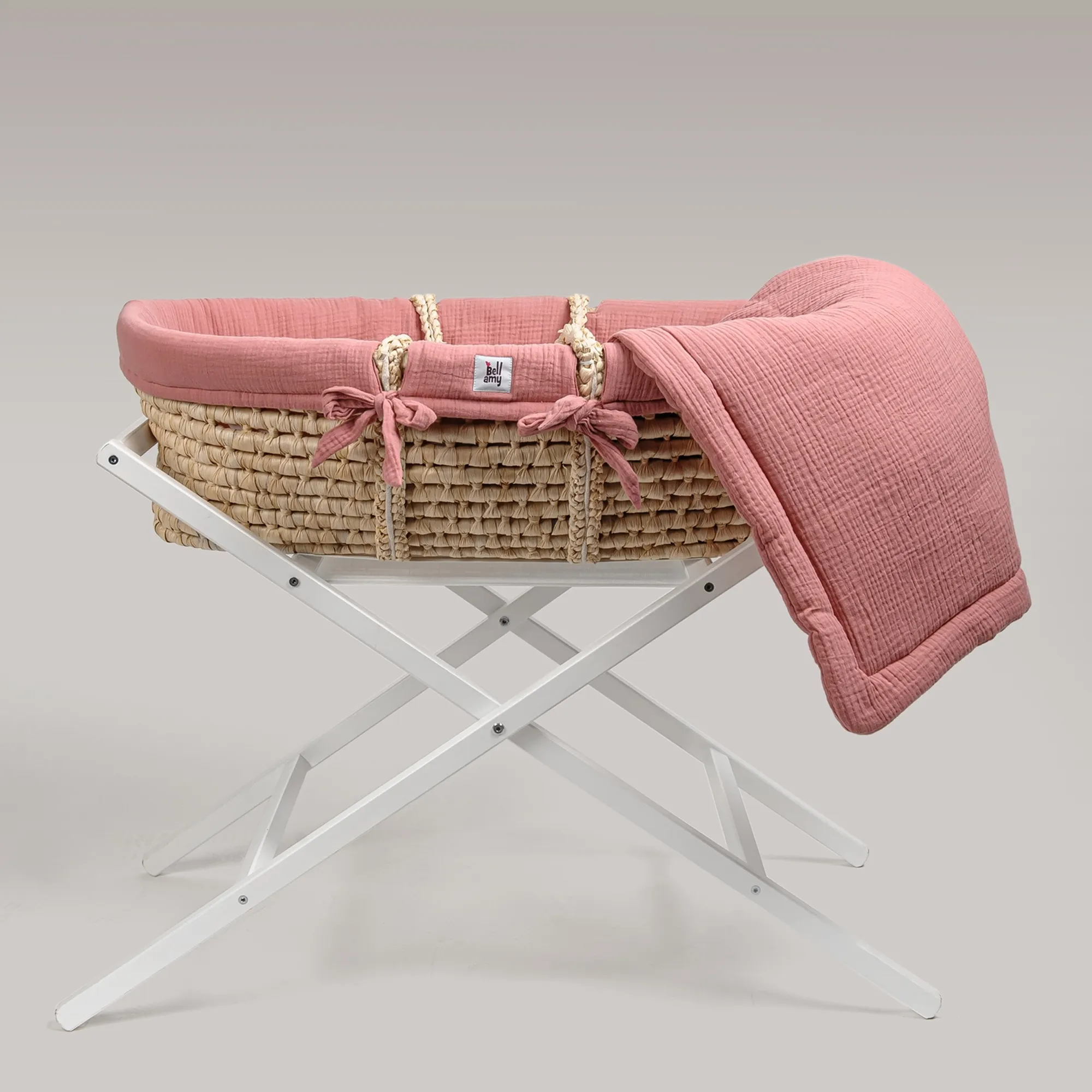 - Kompleksowe tekstylia muślinowe (wyściółka, prześcieradło, kołderka, poduszka z wgłębieniem na główkę – dostępne za dodatkową opłatą)