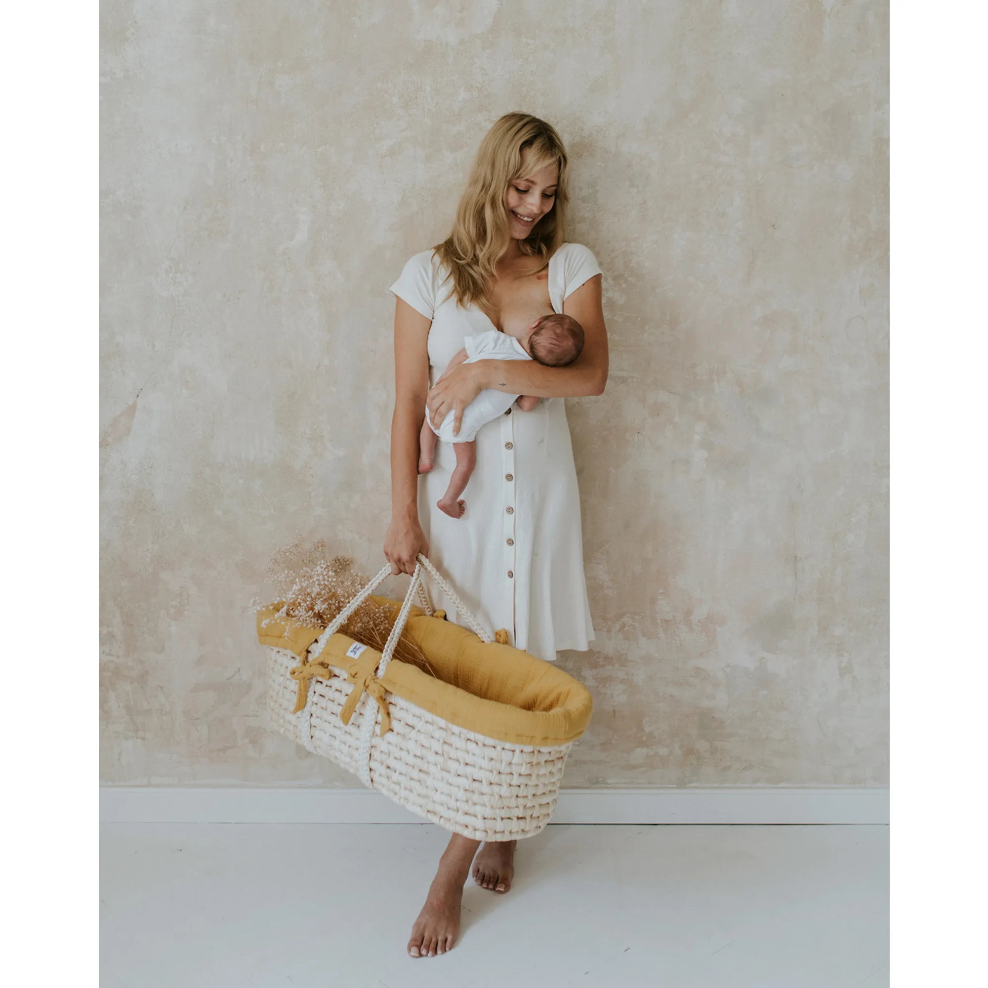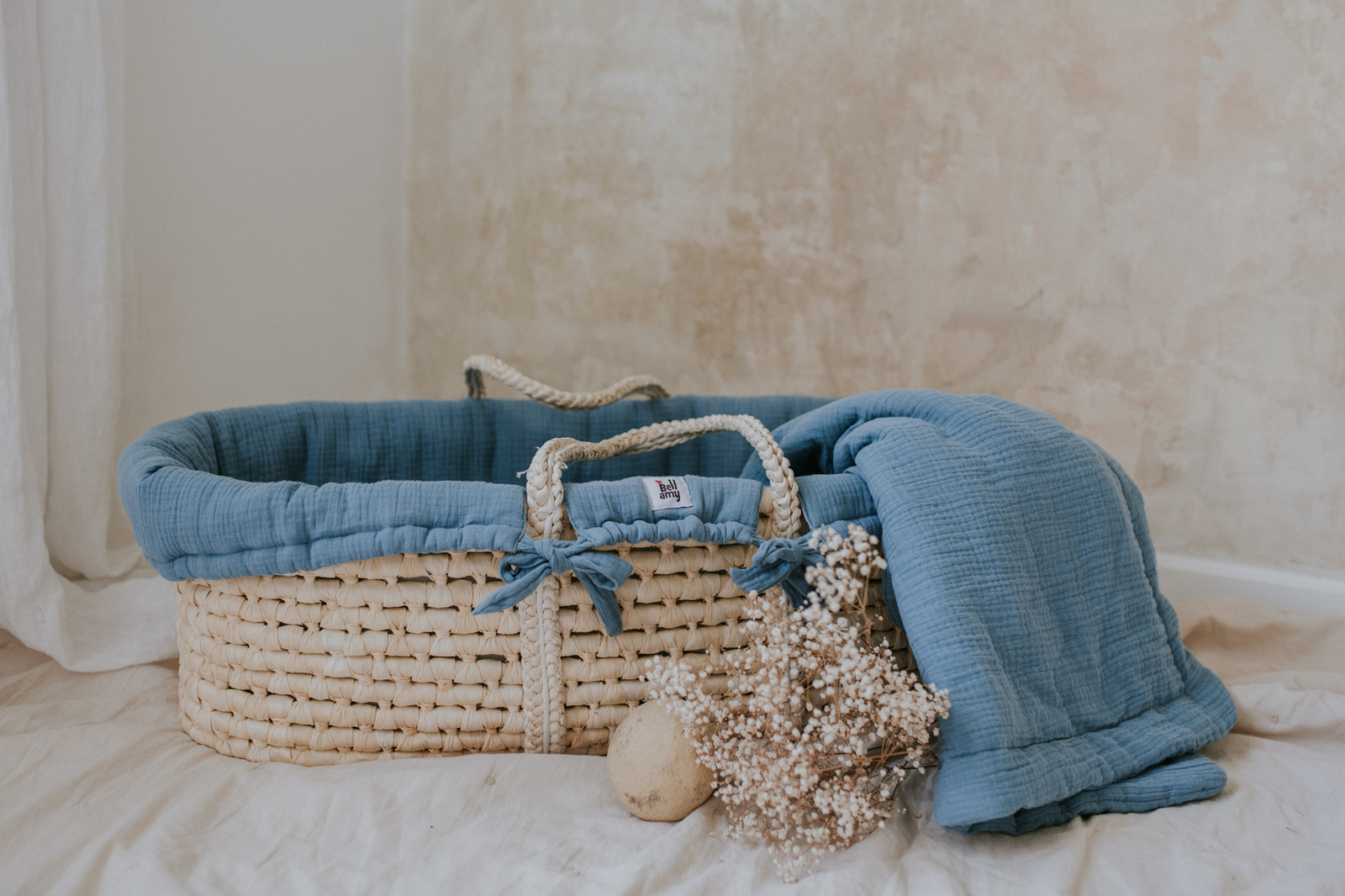 - Kompleksowe tekstylia muślinowe (wyściółka, prześcieradło, kołderka, poduszka z wgłębieniem na główkę)