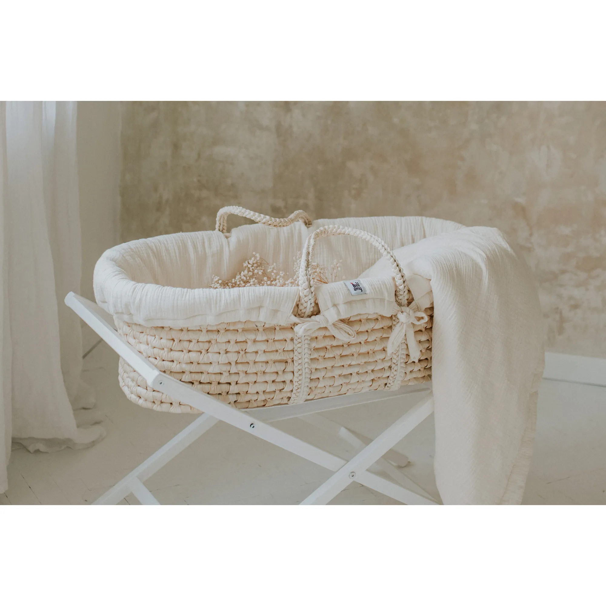 Kosz Mojżesza z materacem i stojakiem Meeko + tekstylia Milk