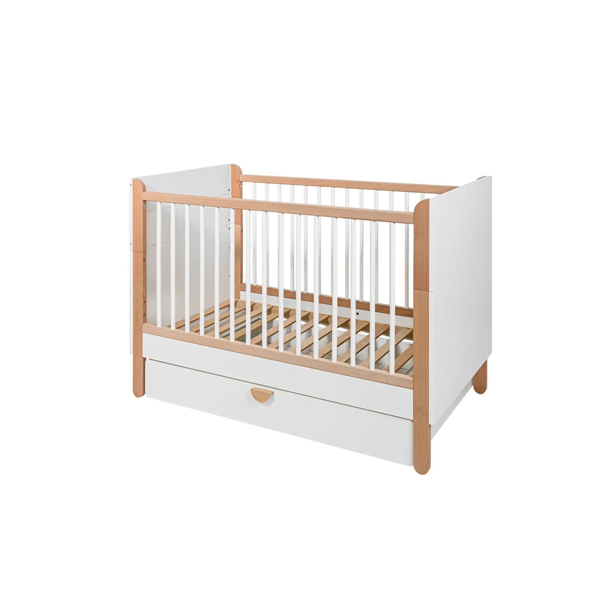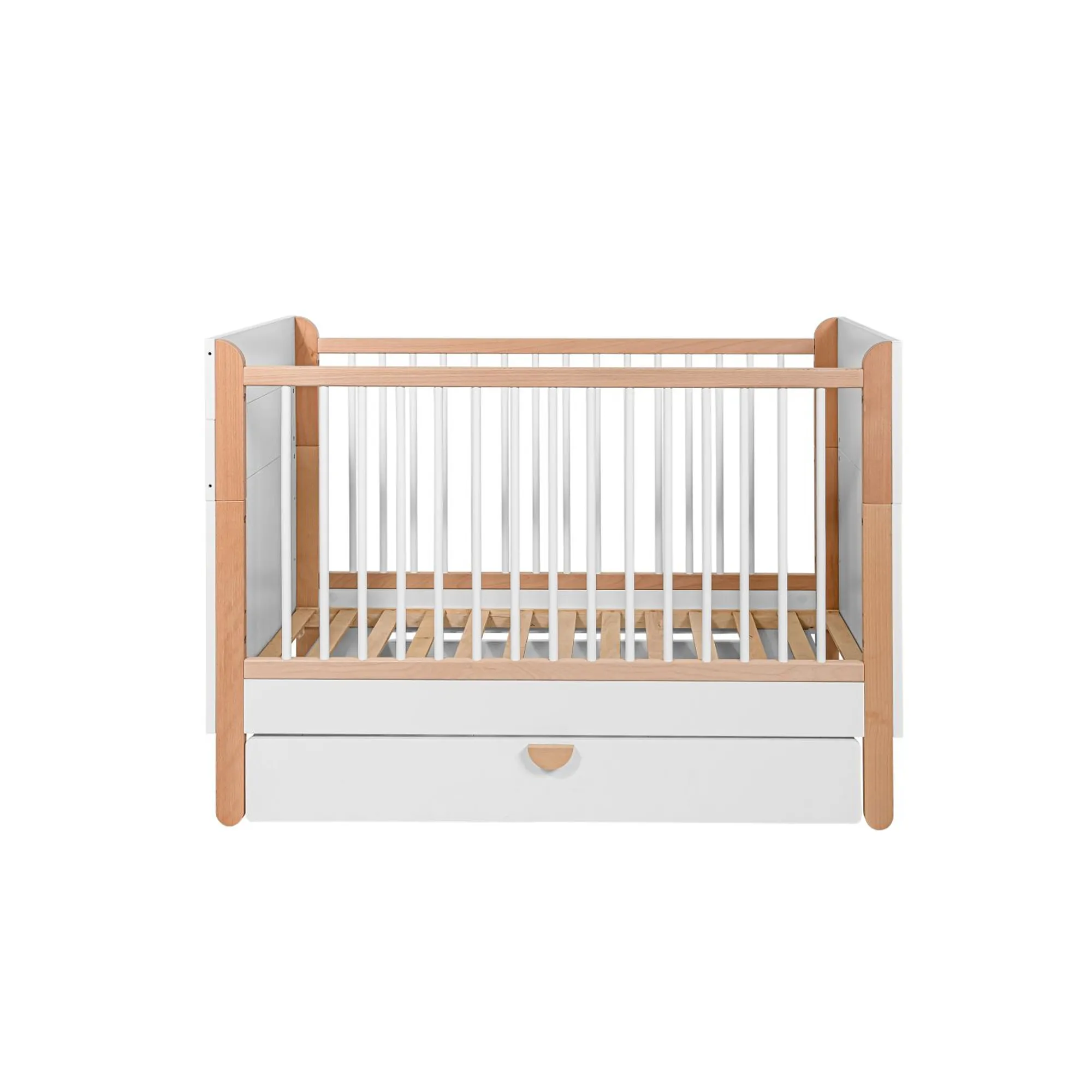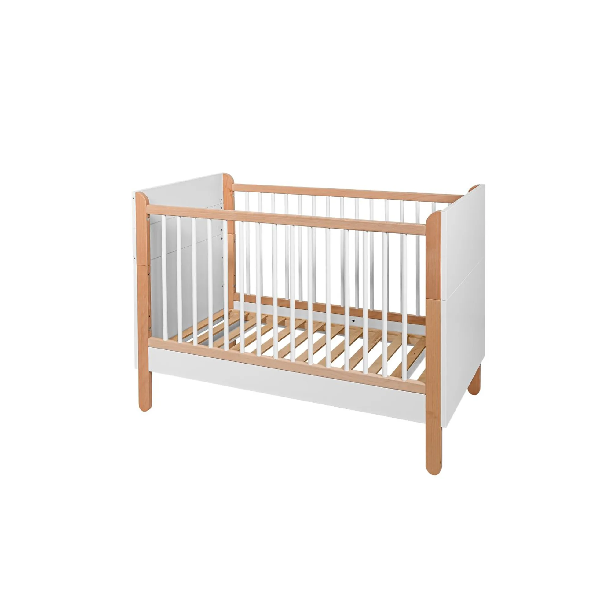 - Korpus i elementy łóżeczka: Płyta MDF lakierowana i wysokiej jakości płyta laminowana, odporne na uszkodzenia i wilgoć