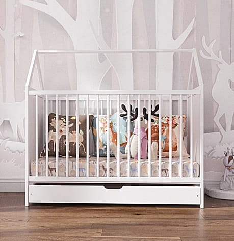 Łóżeczko wykonane z drewna. Wypełnienie szczytów wykonano z HDF. Szuflada z płyty wiórowej i płyty HDF.