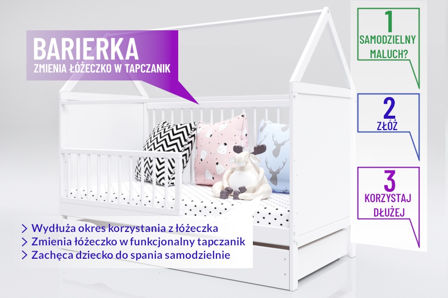 - funkcja tapczanika po zdjęciu jednego boku łóżeczka, możliwość założenia barierki zabezpieczającej
