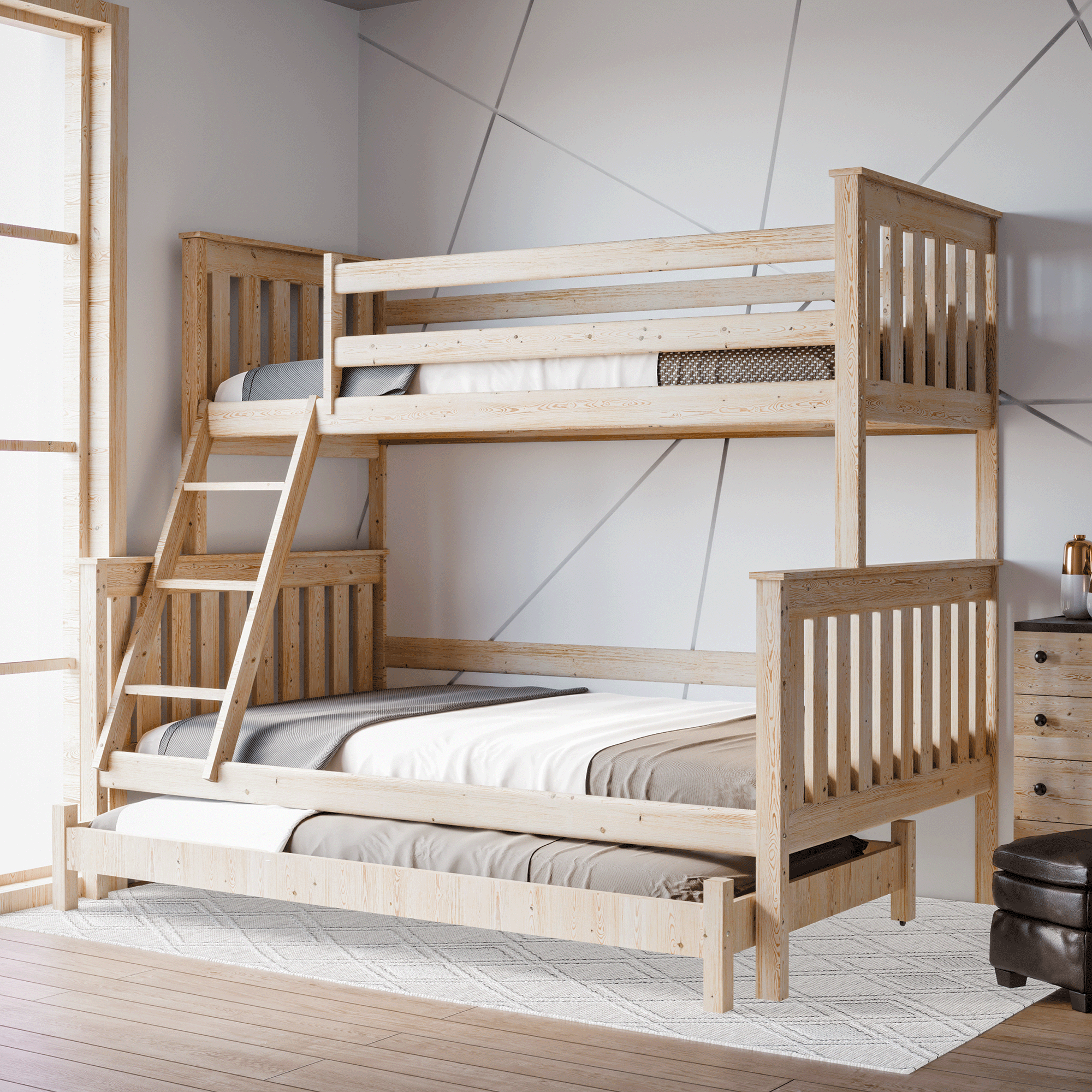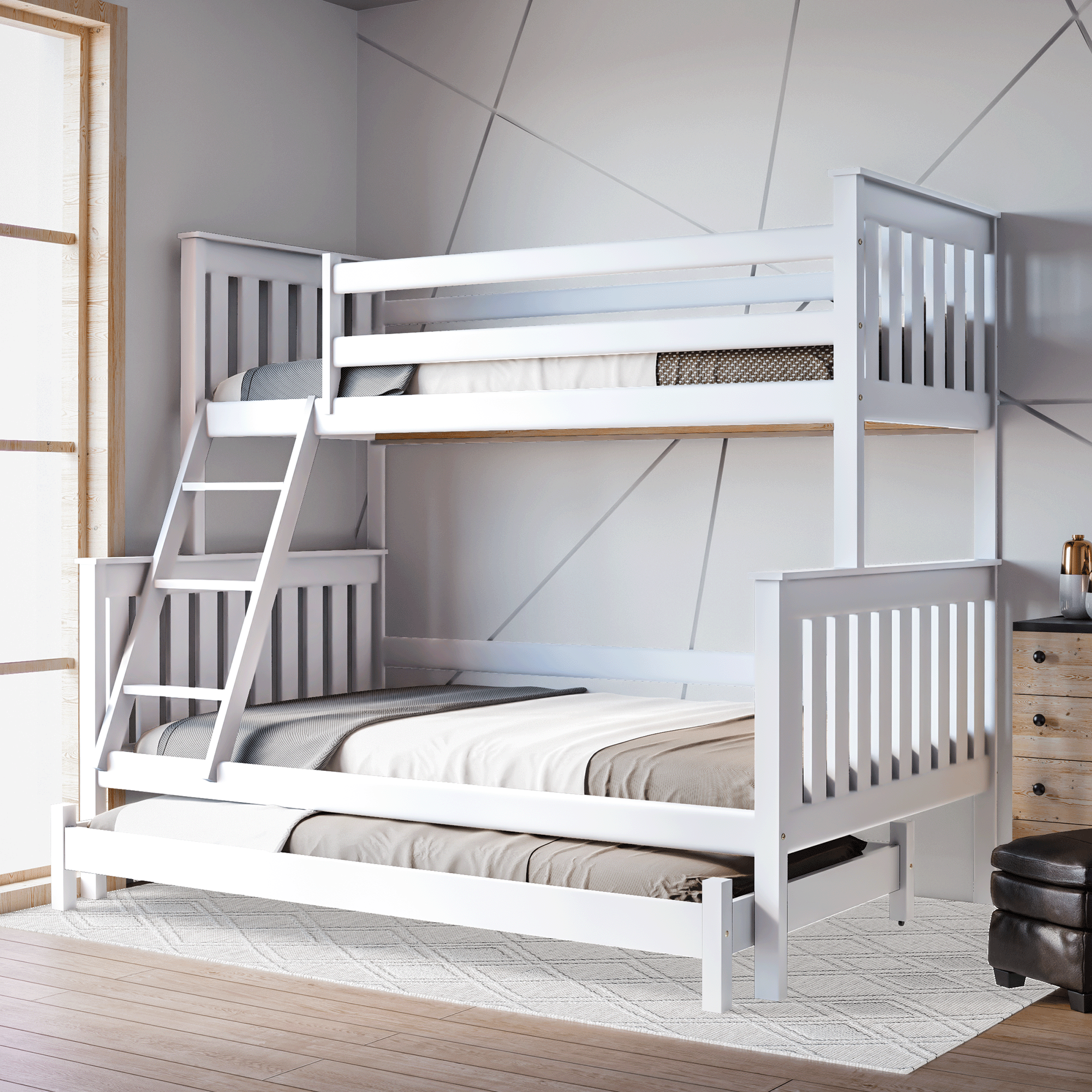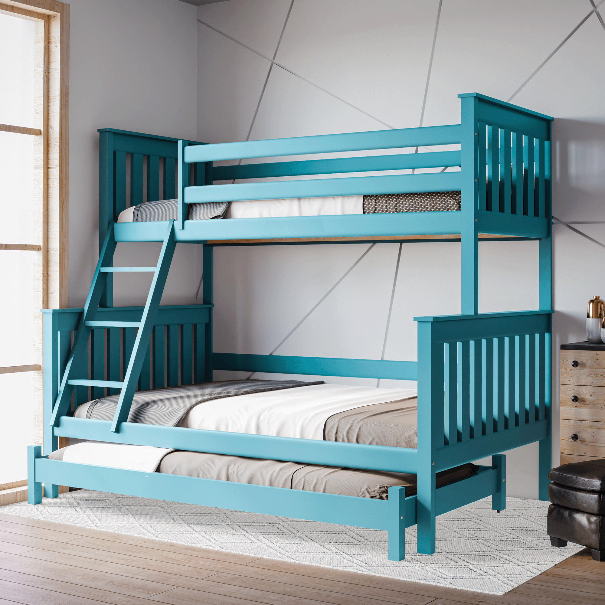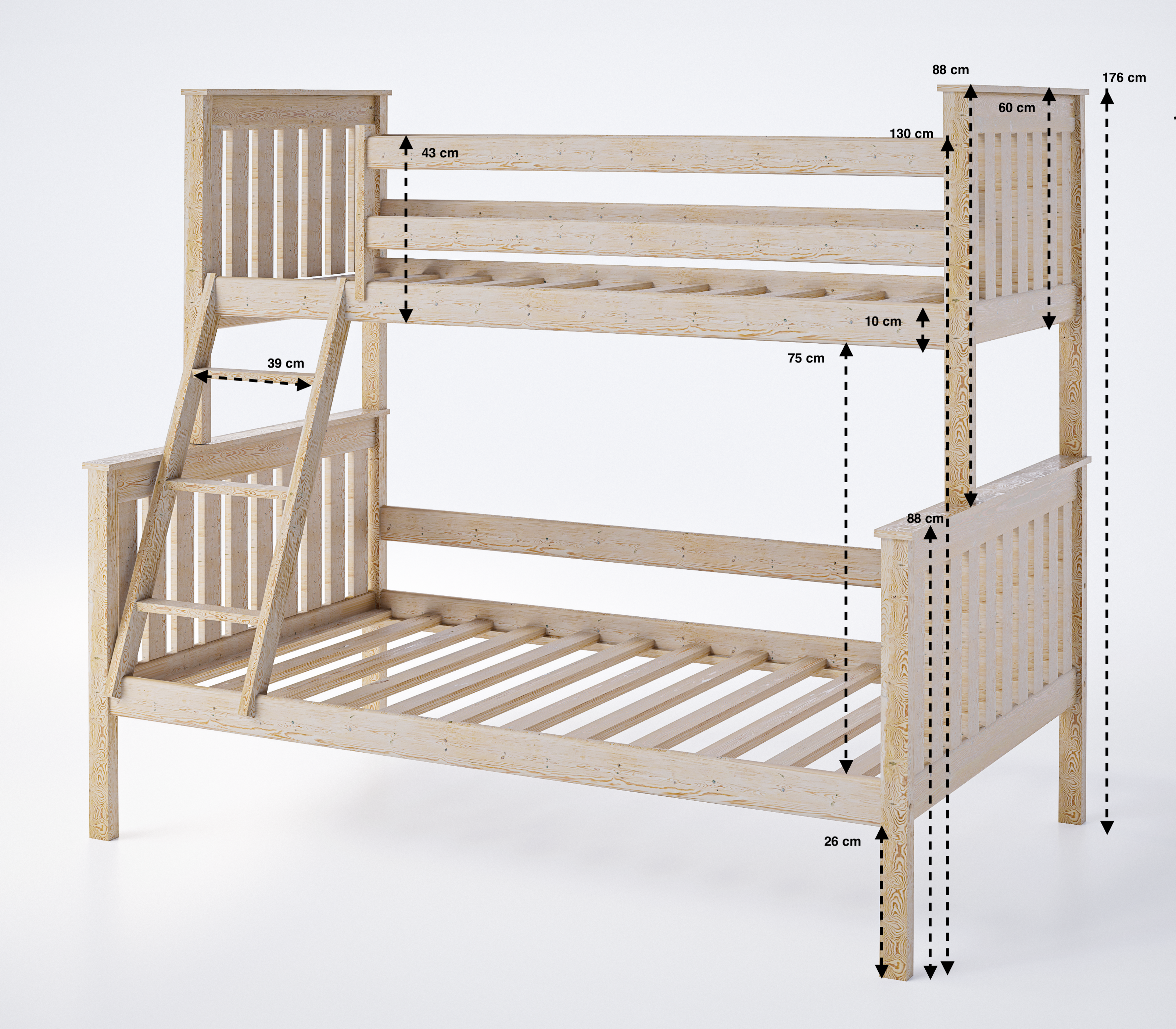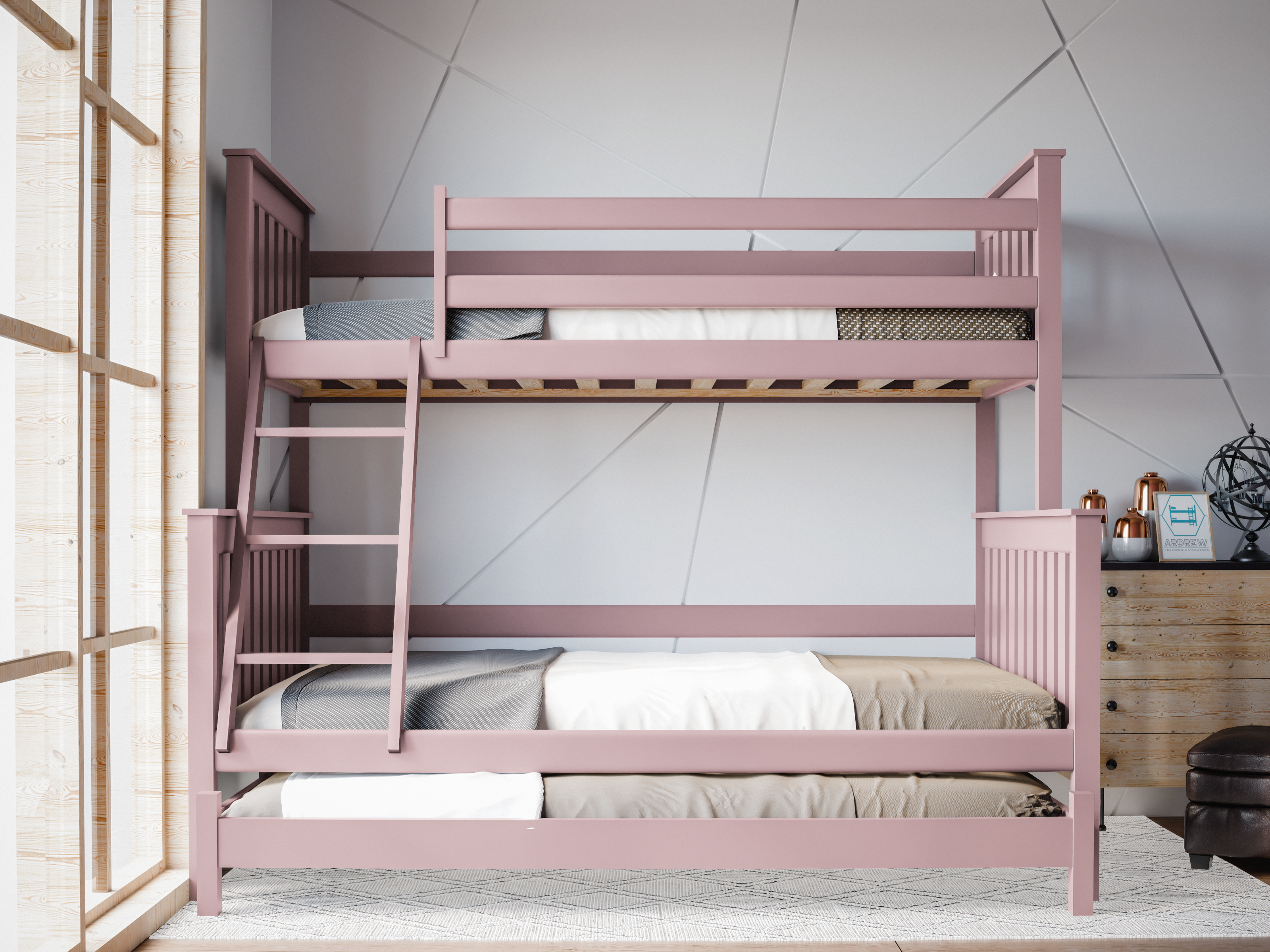 Łóżko piętrowe 3-osobowe Dallas to idealne rozwiązanie dla rodzin z dziećmi, rodzeństwa dzielącego pokój lub osób, które chcą maksymalnie wykorzystać przestrzeń w mieszkaniu. Model Dallas łączy w sobie solidne wykonanie, bezpieczeństwo i wygodę, a dzięki dodatkowej, wysuwanej konstrukcji zapewnia miejsce do spania nawet dla czterech osób. Świetnie sprawdzi się w pokoju dziecięcym, młodzieżowym, jak i w pokoju gościnnym.