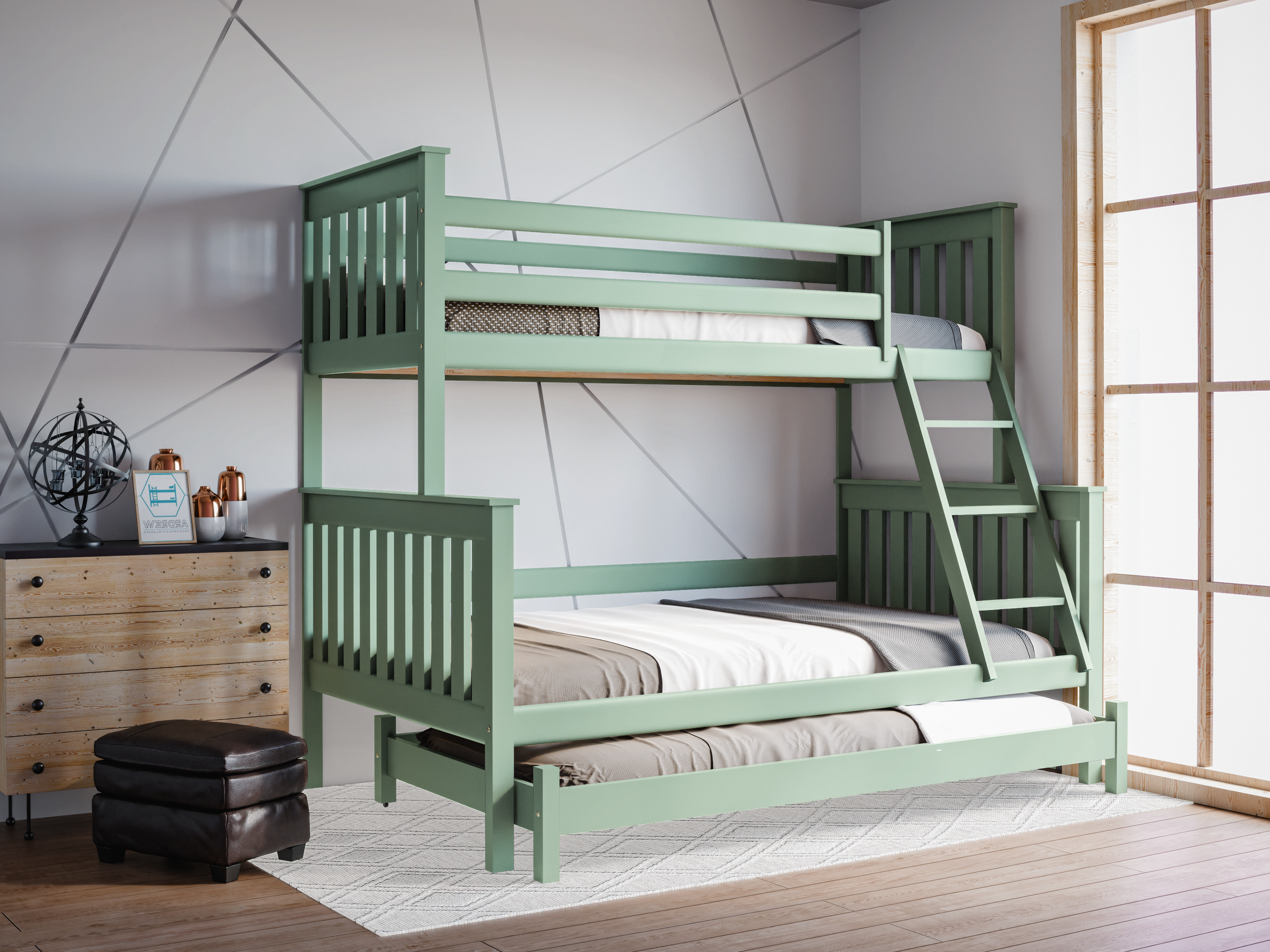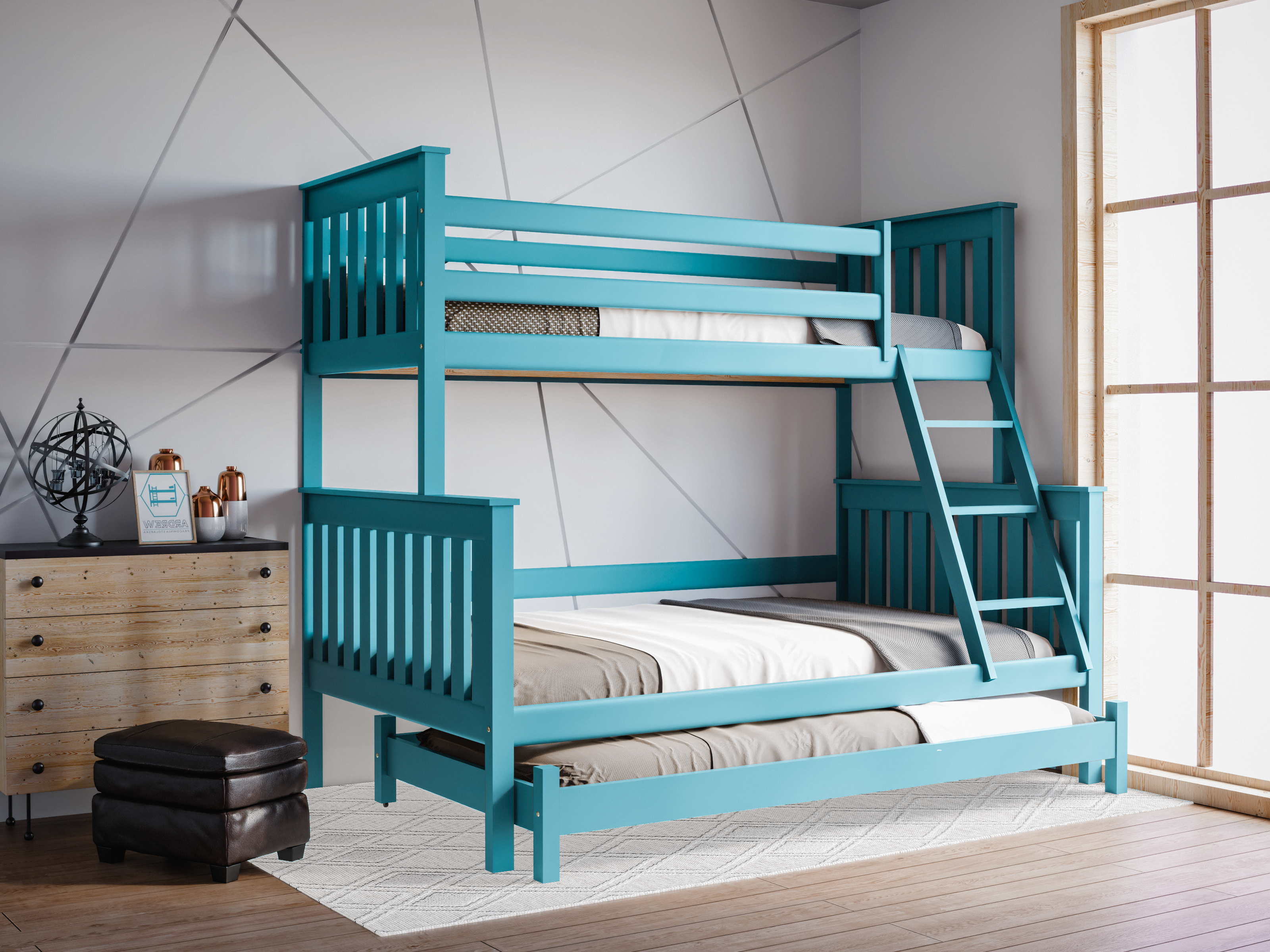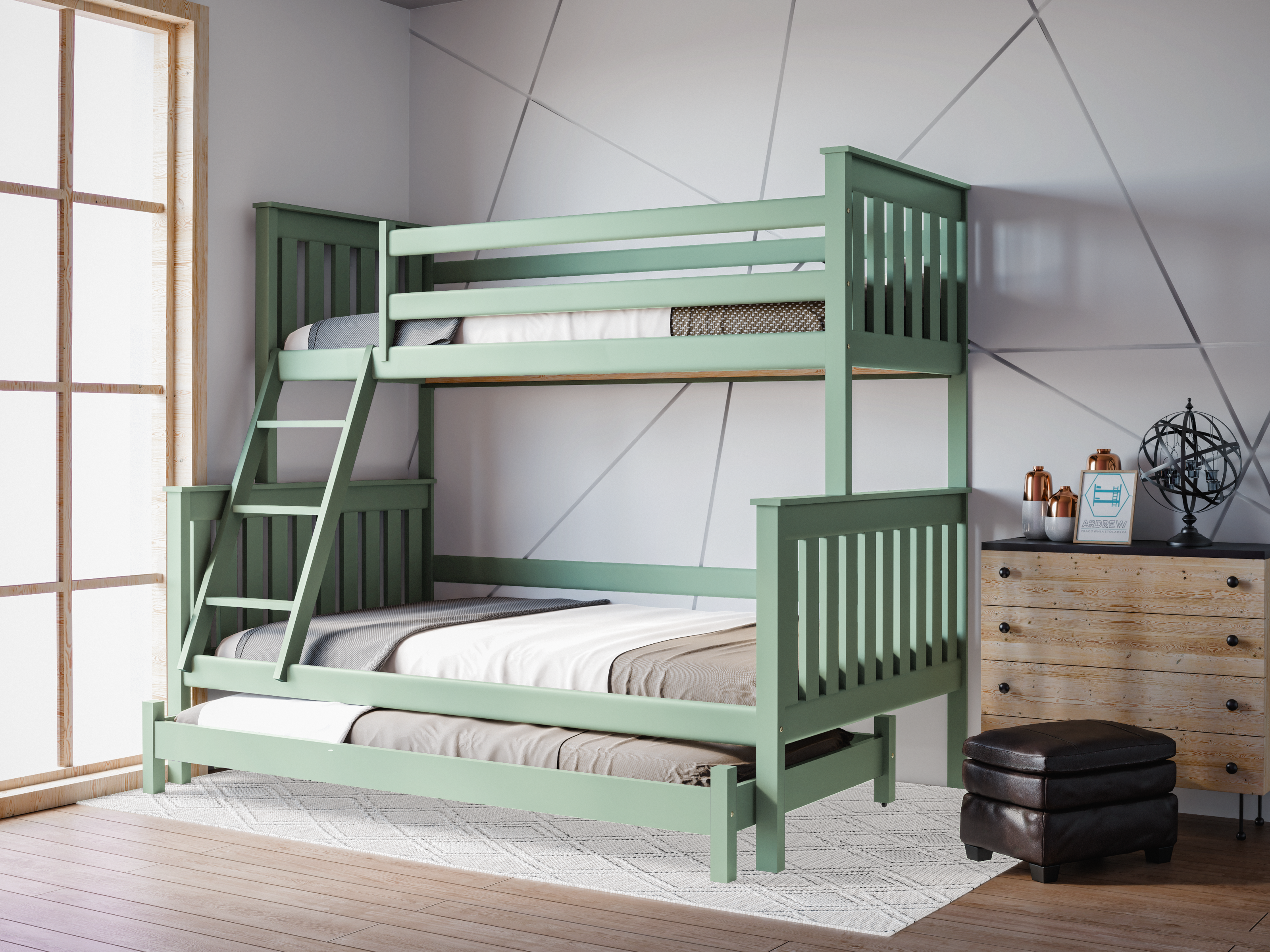 - łóżko 3-osobowe z dodatkowym wysuwanym miejscem do spania dla czwartej osoby