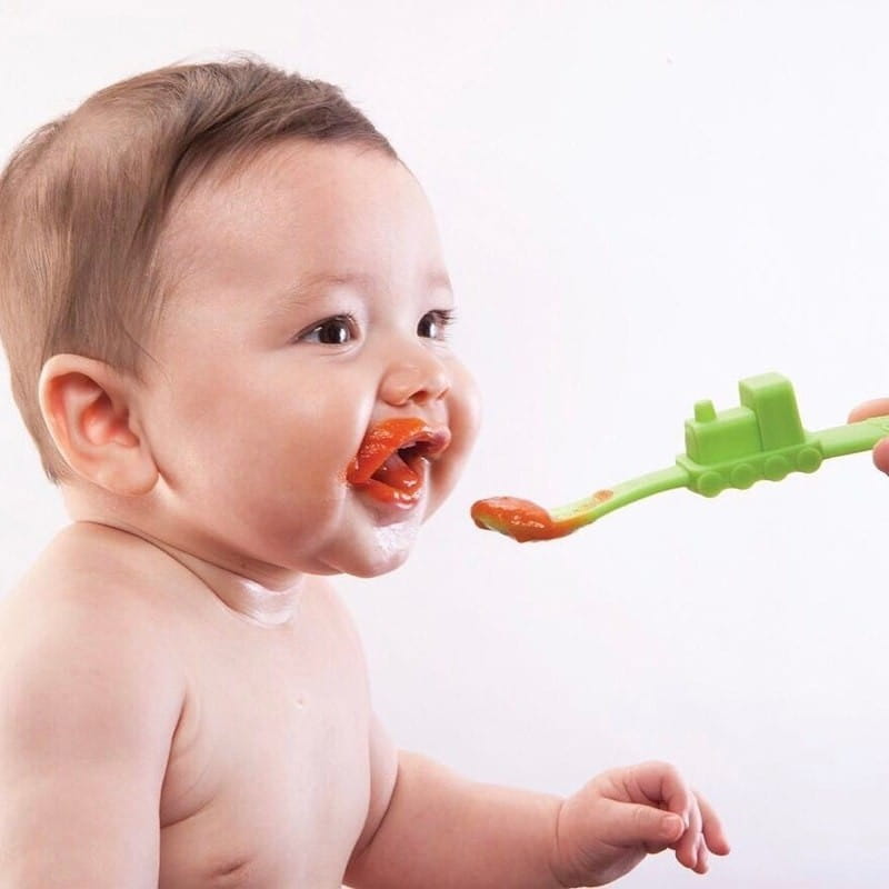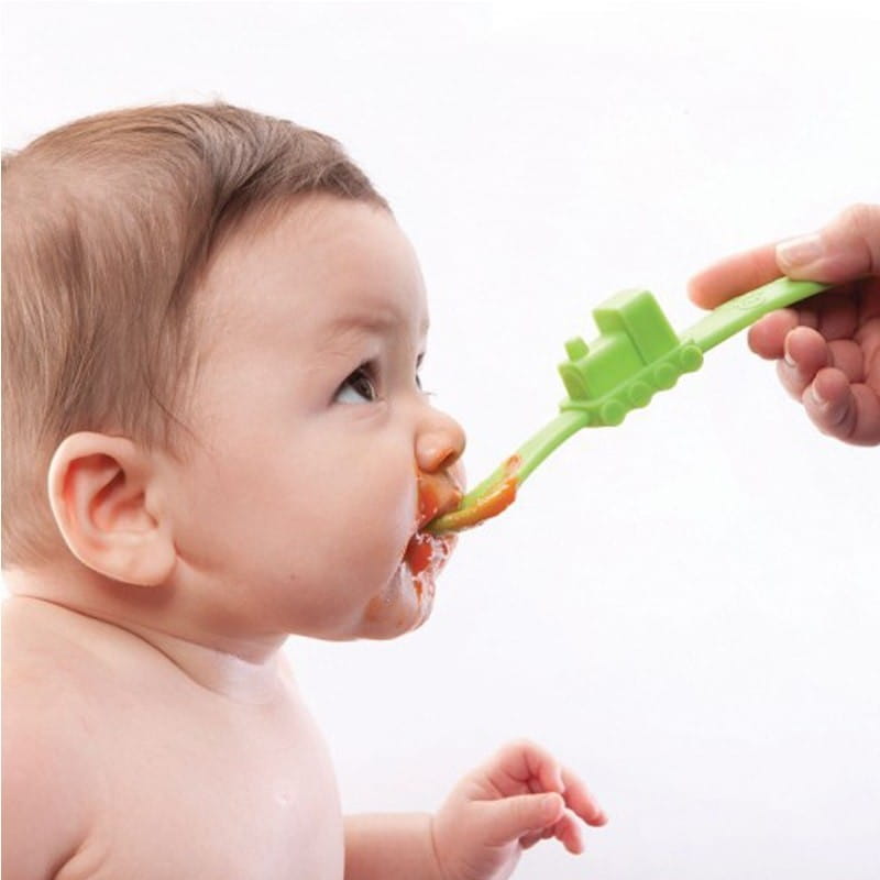 Prezentujemy delikatną silikonową łyżeczkę do karmienia i nauki samodzielnego jedzenia w kształcie pociągu firmy Oogaa.