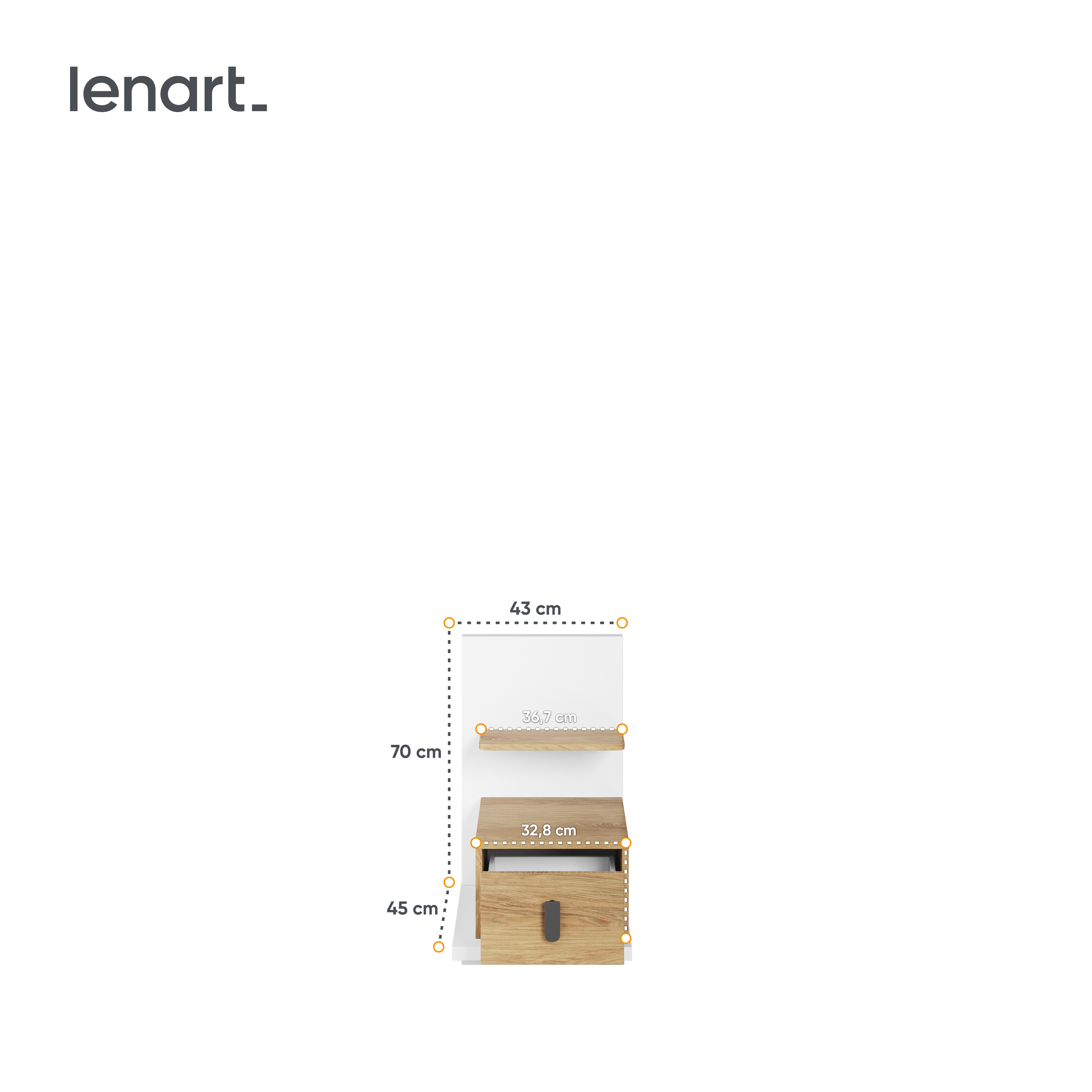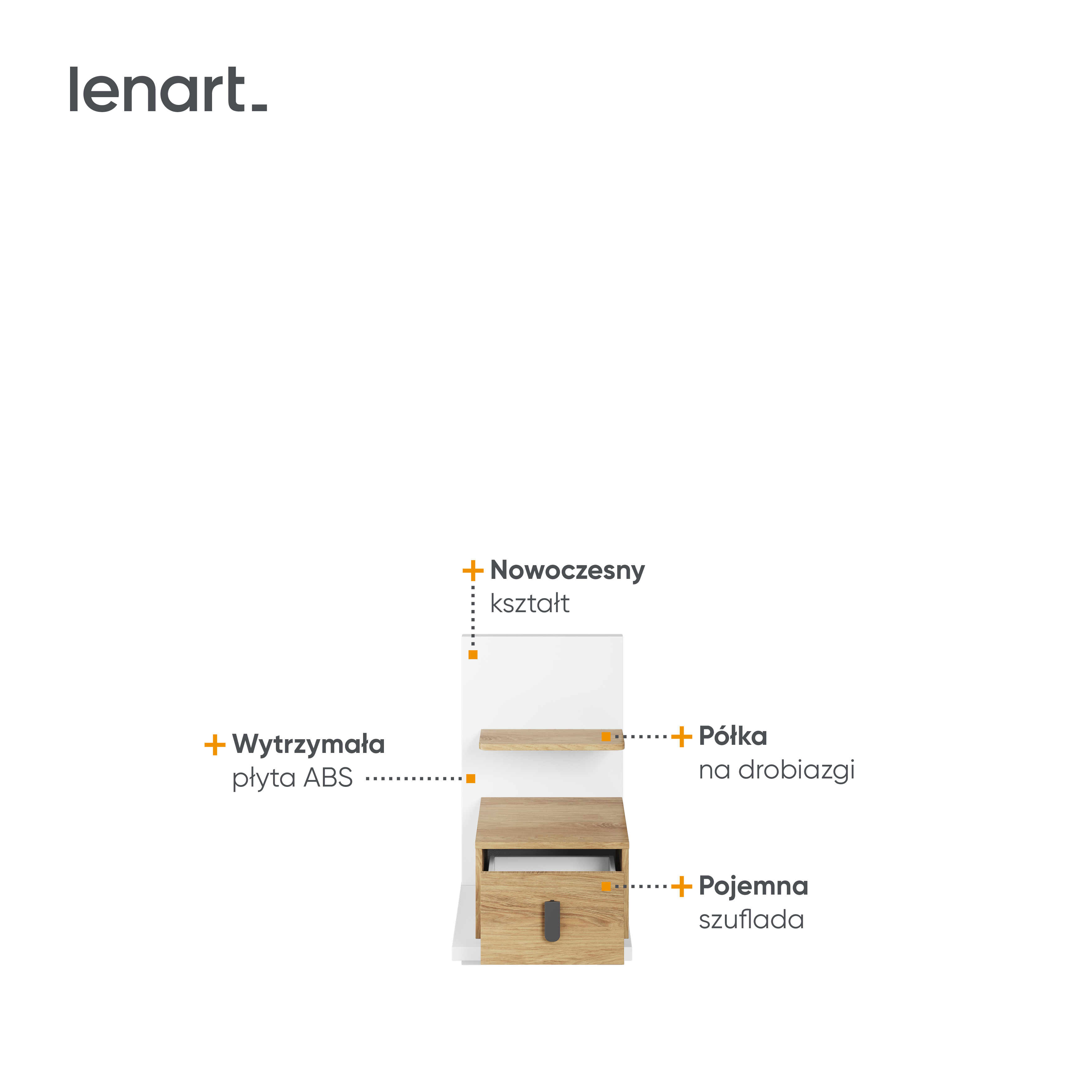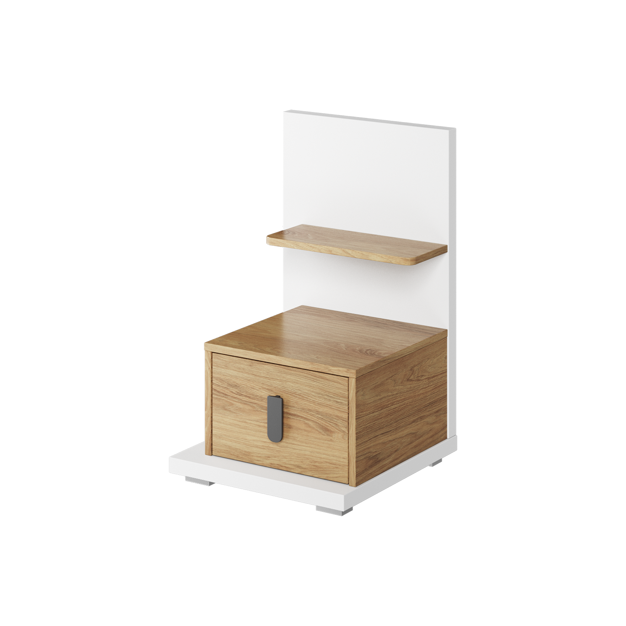 Stolik nocny Simi to elegancki i nowoczesny mebel, który doskonale wpasuje się w wystrój sypialni lub pokoju młodzieżowego. Jego oryginalny kształt i stylowy design łączą funkcjonalność z estetyką. Pojemna szuflada umożliwia łatwy dostęp do przechowywanych wewnątrz rzeczy, a blat szuflady oraz niewielka półka pozwalają wygodnie odłożyć najpotrzebniejsze przedmioty, takie jak telefon, budzik czy krem do rąk.